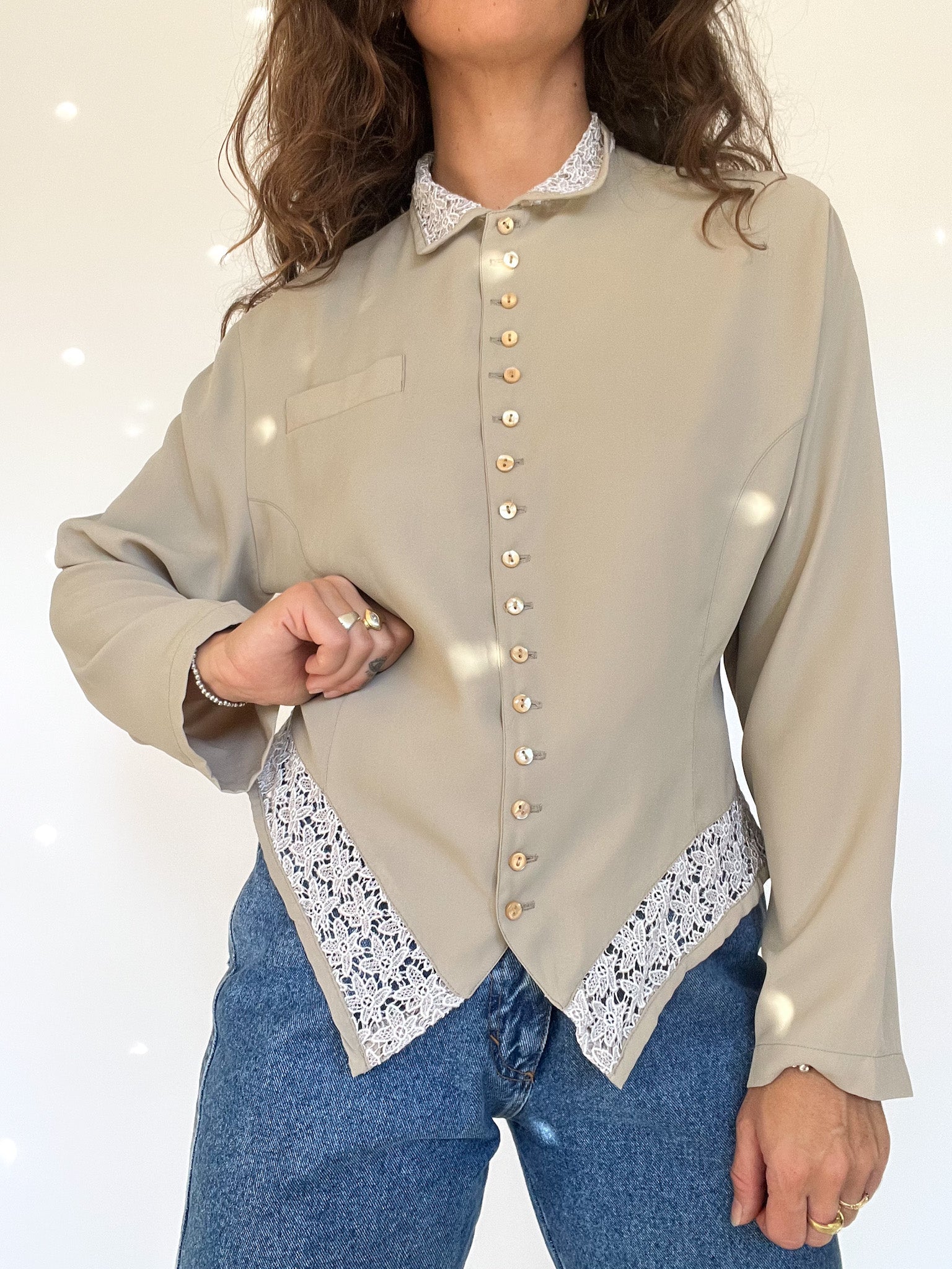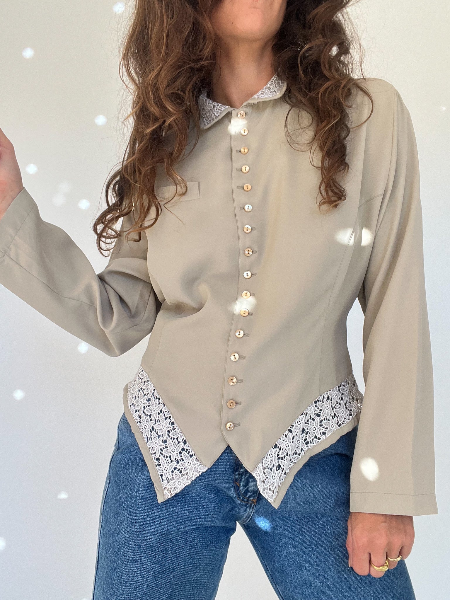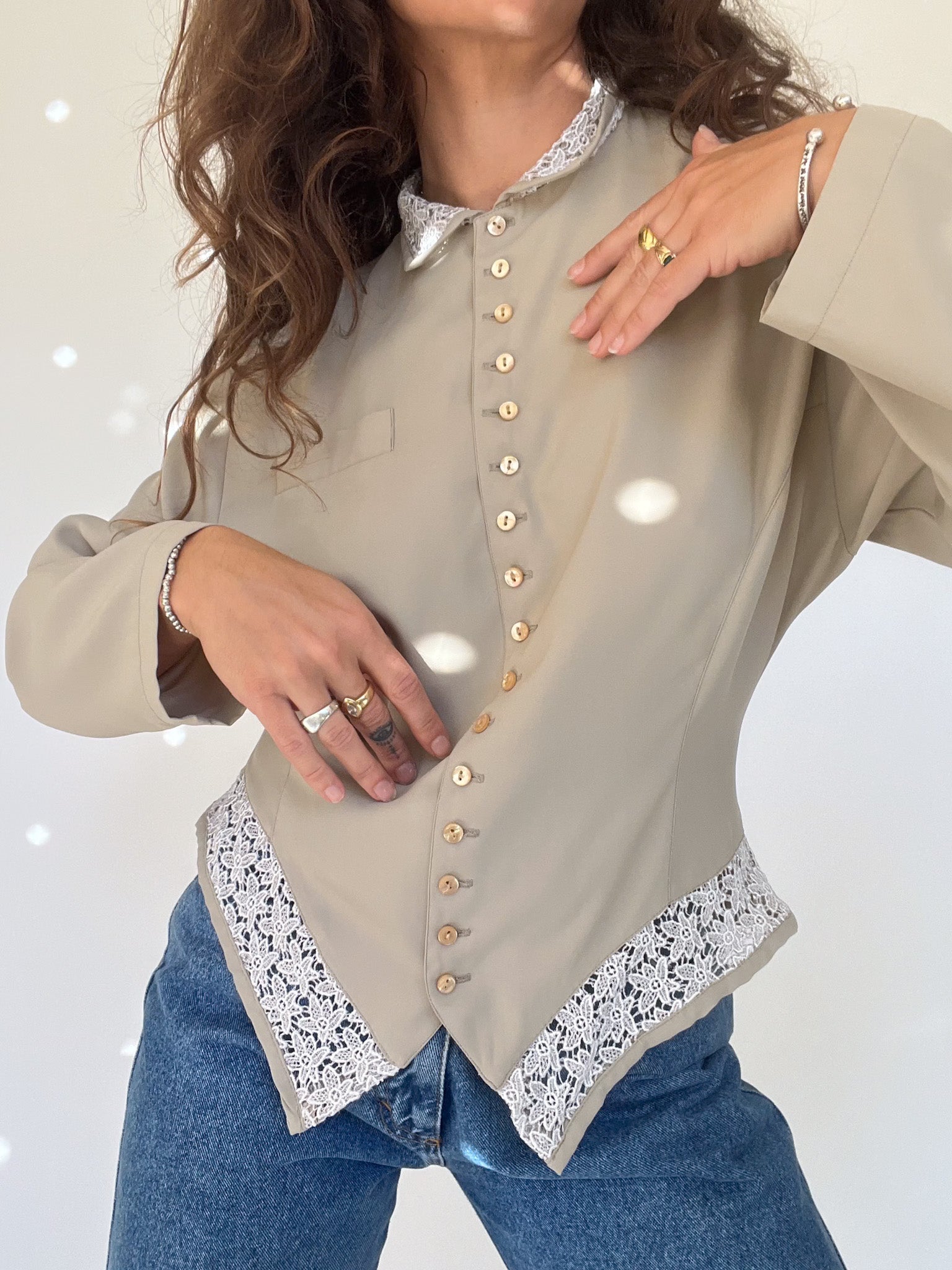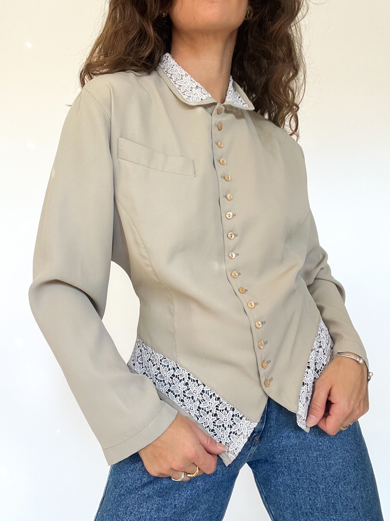 Vintage 80’s Beige Fitted Blouse with Lace Trim
