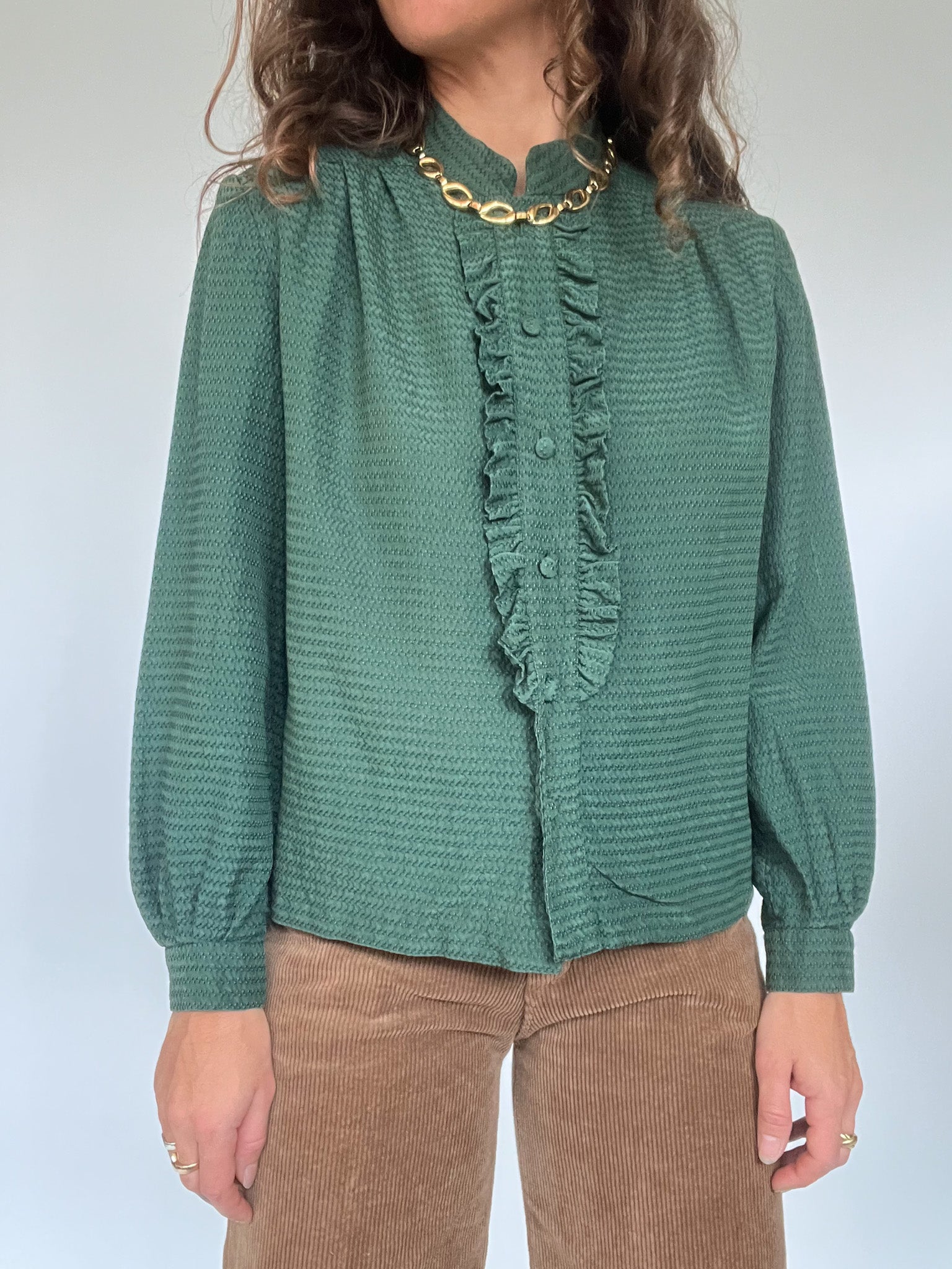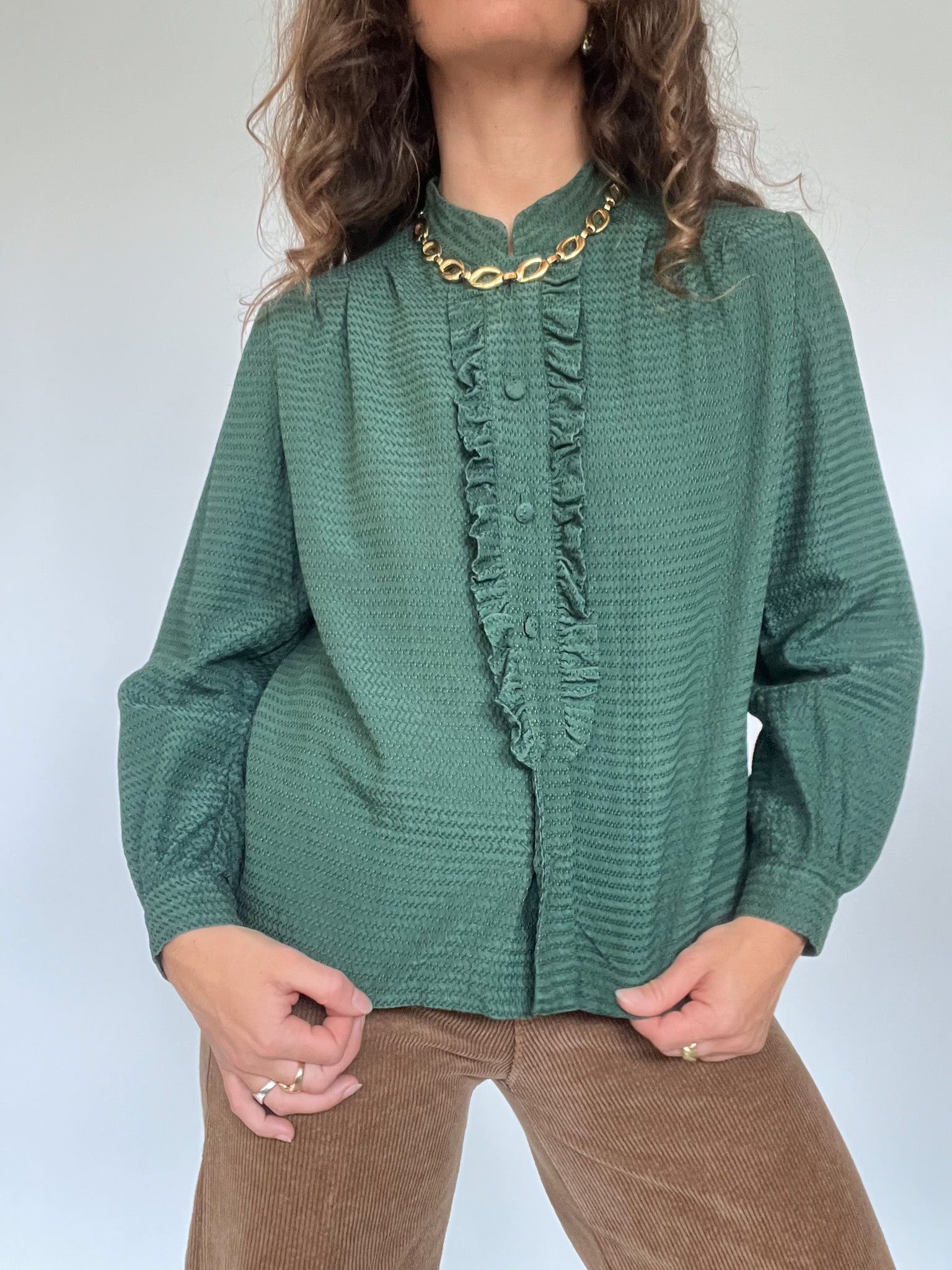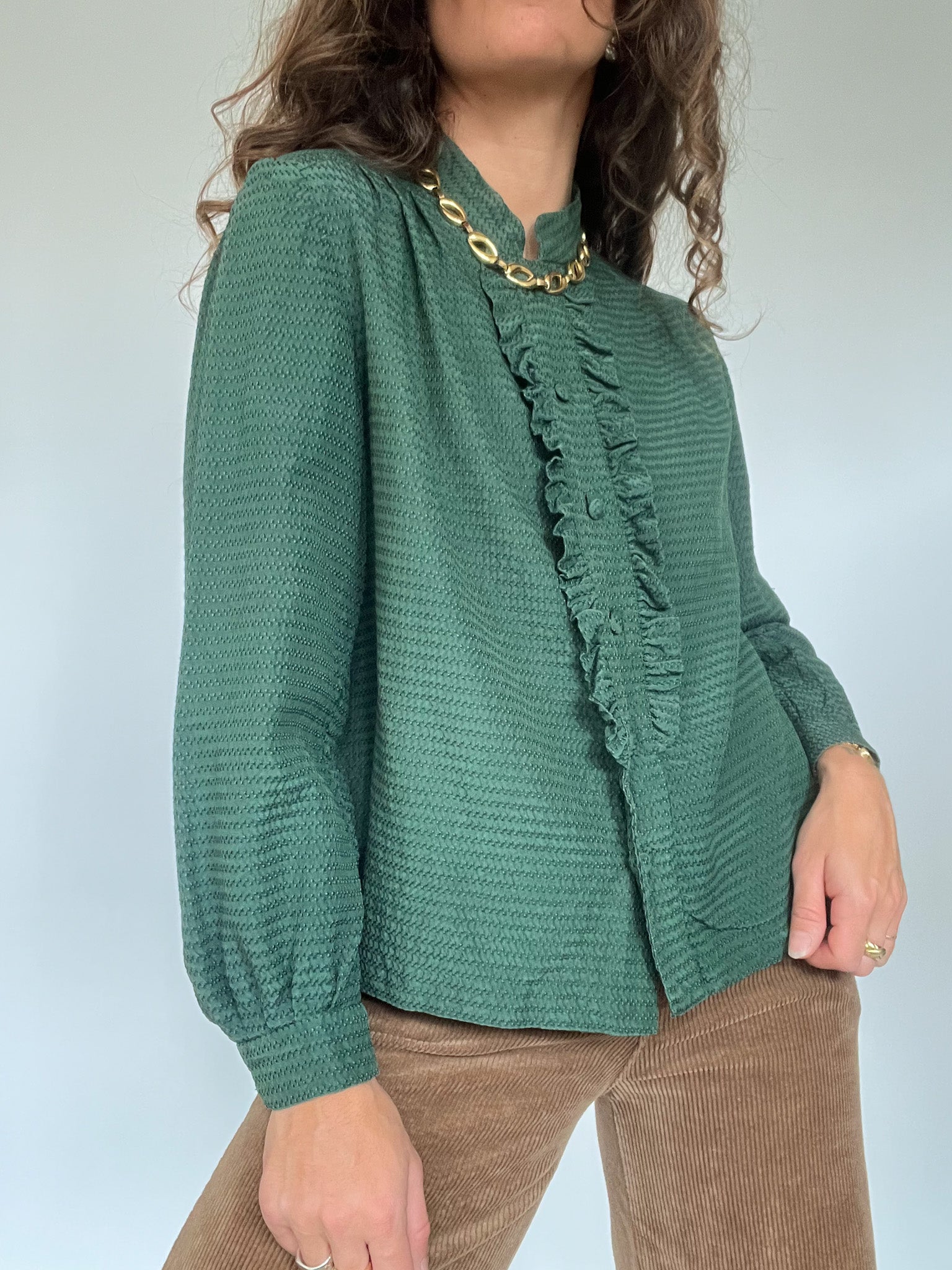 Vintage 80’s Emerald Green Ruffled Handmade Blouse