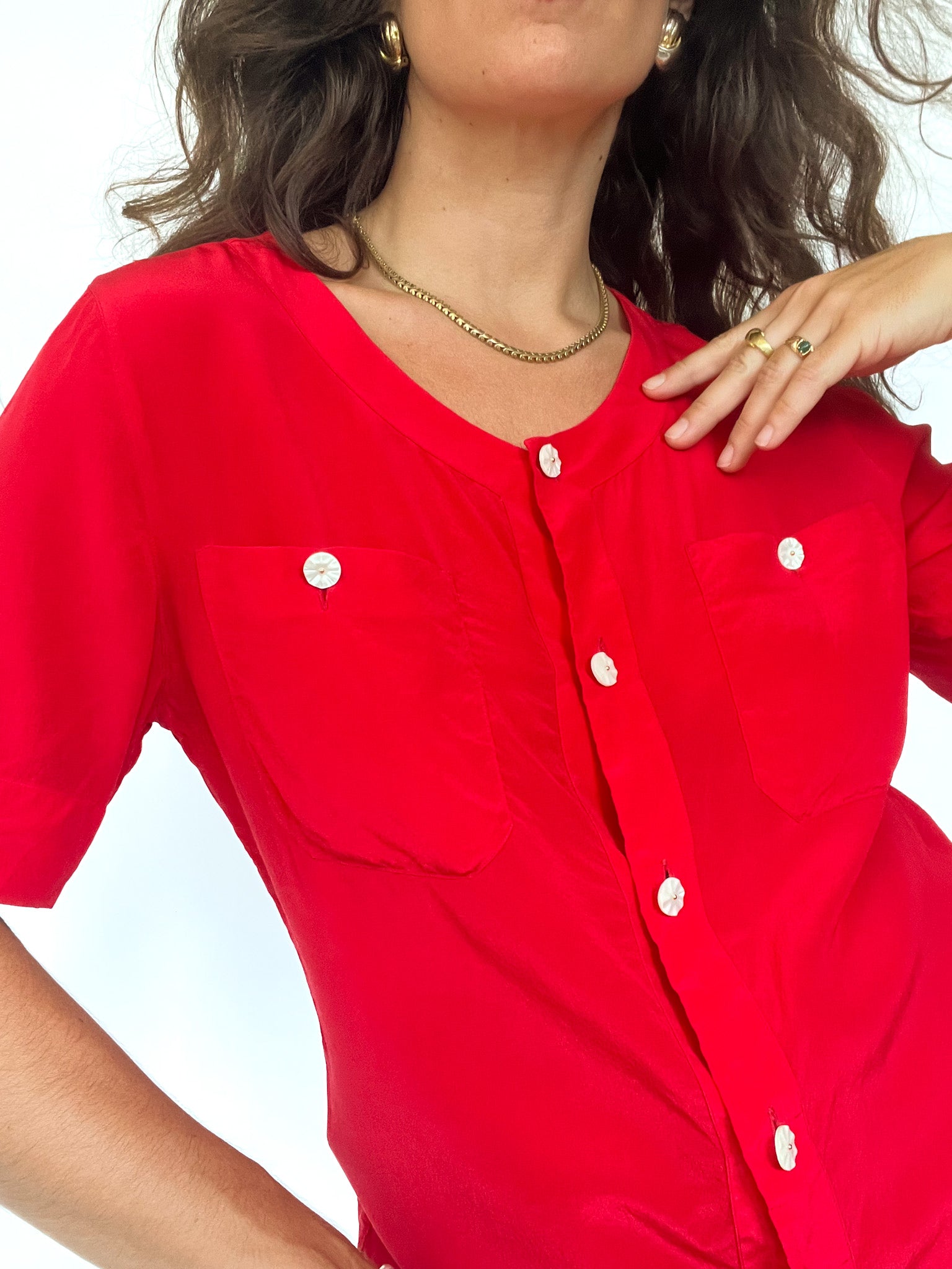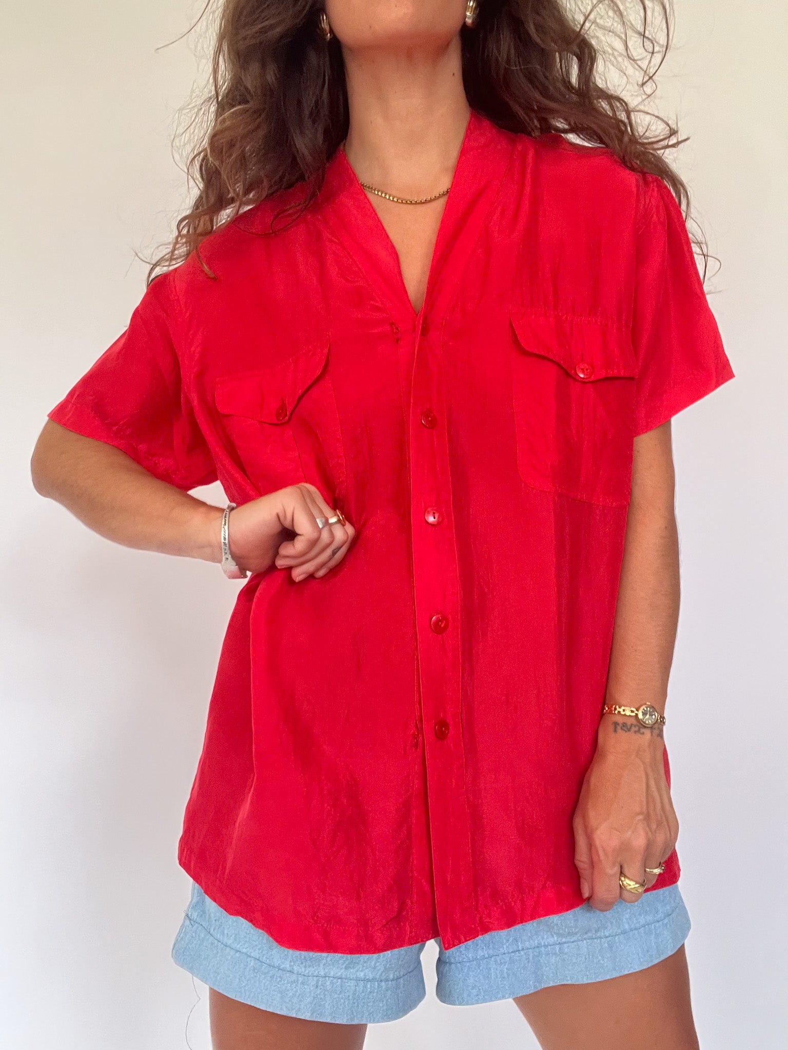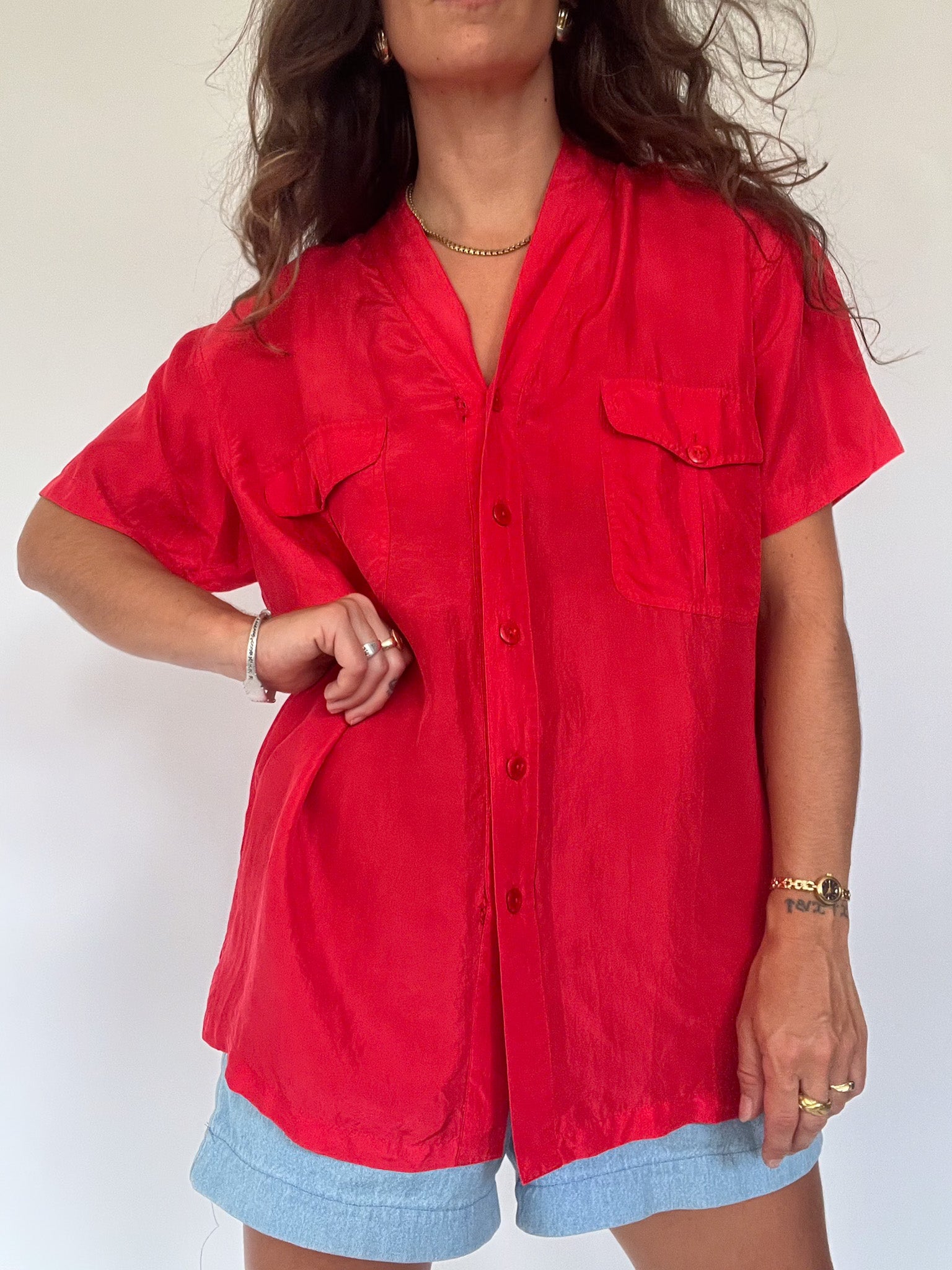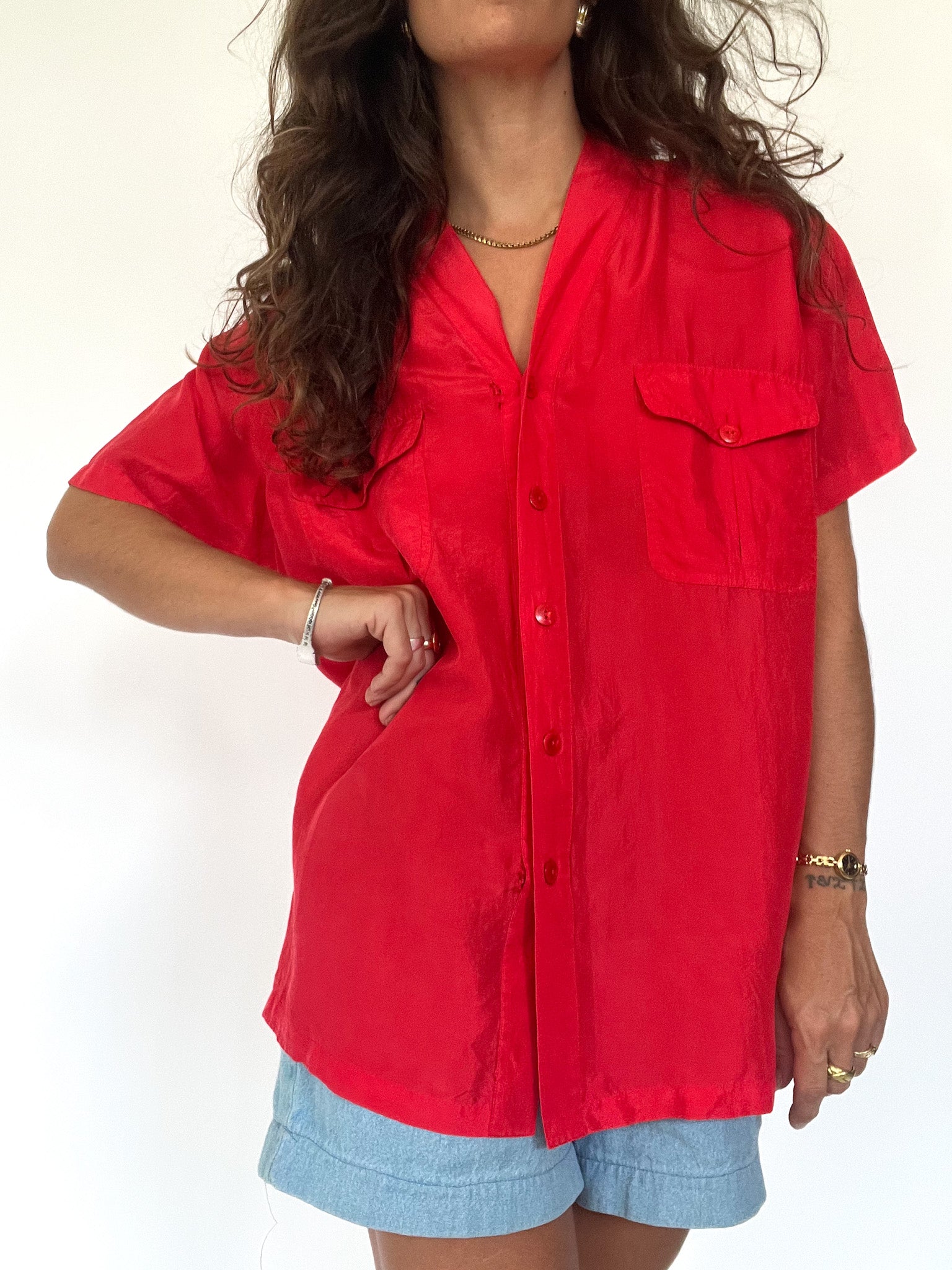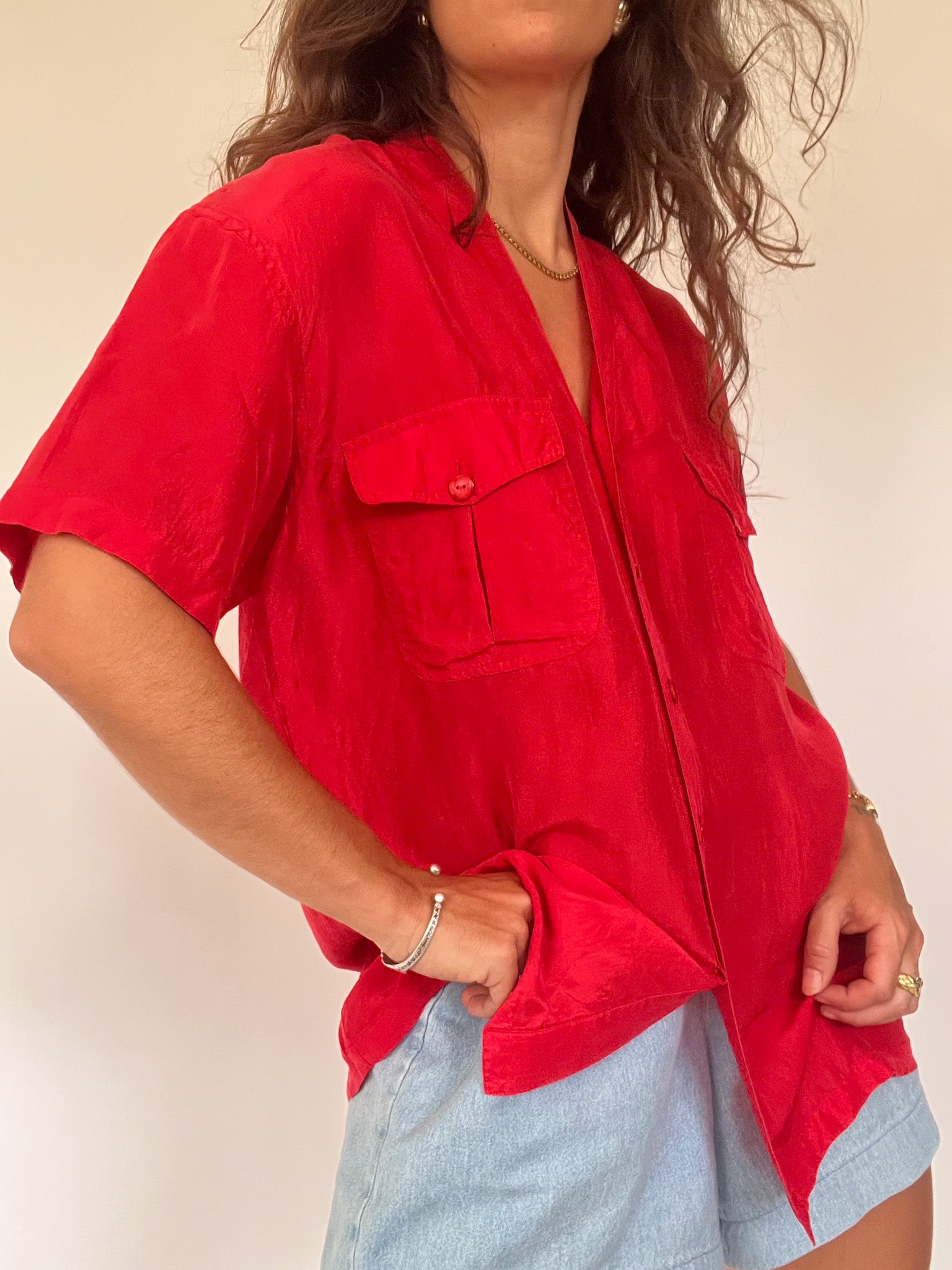 Vintage 90’s Cherry Red Silk Shirt with Pockets