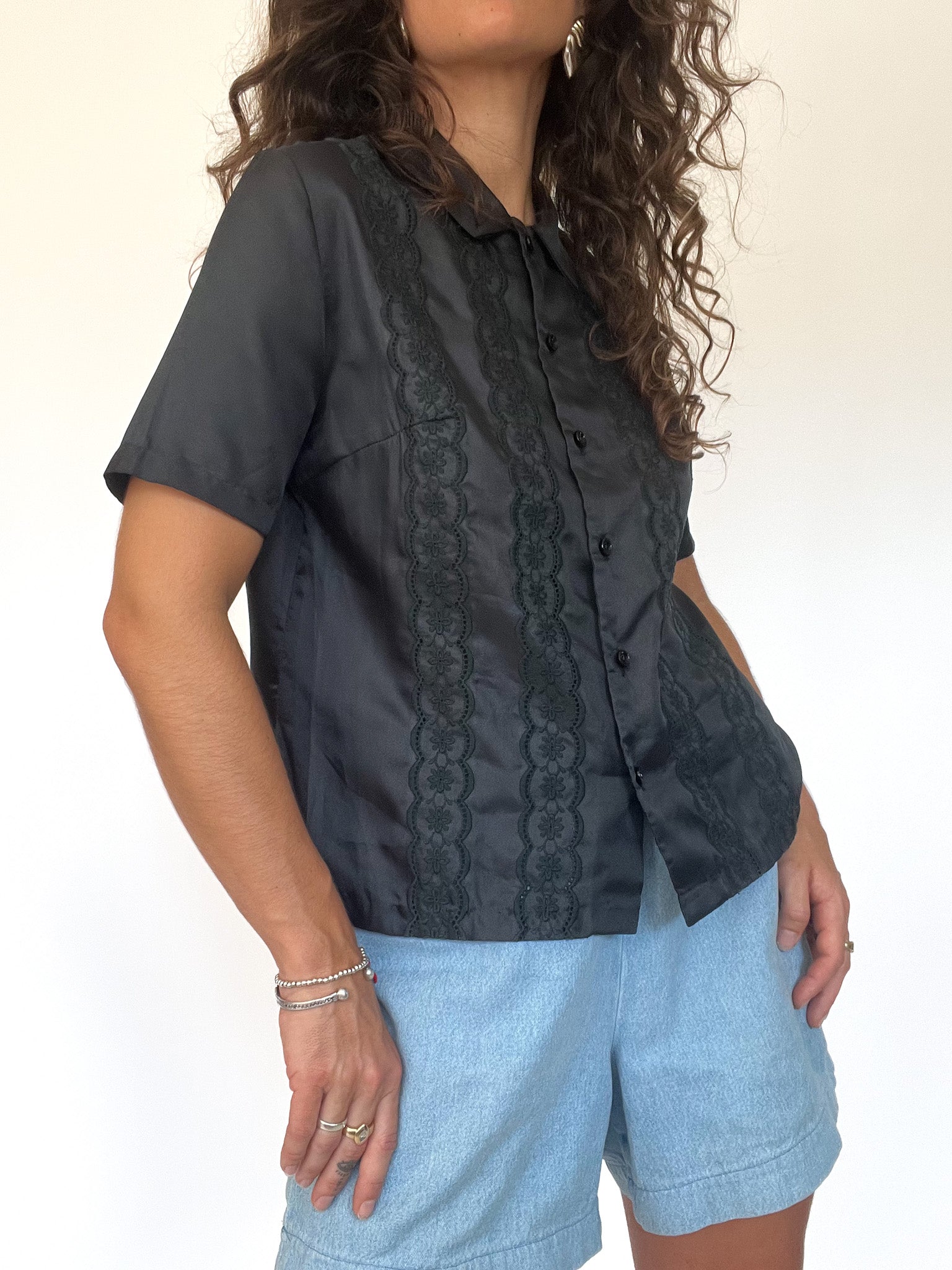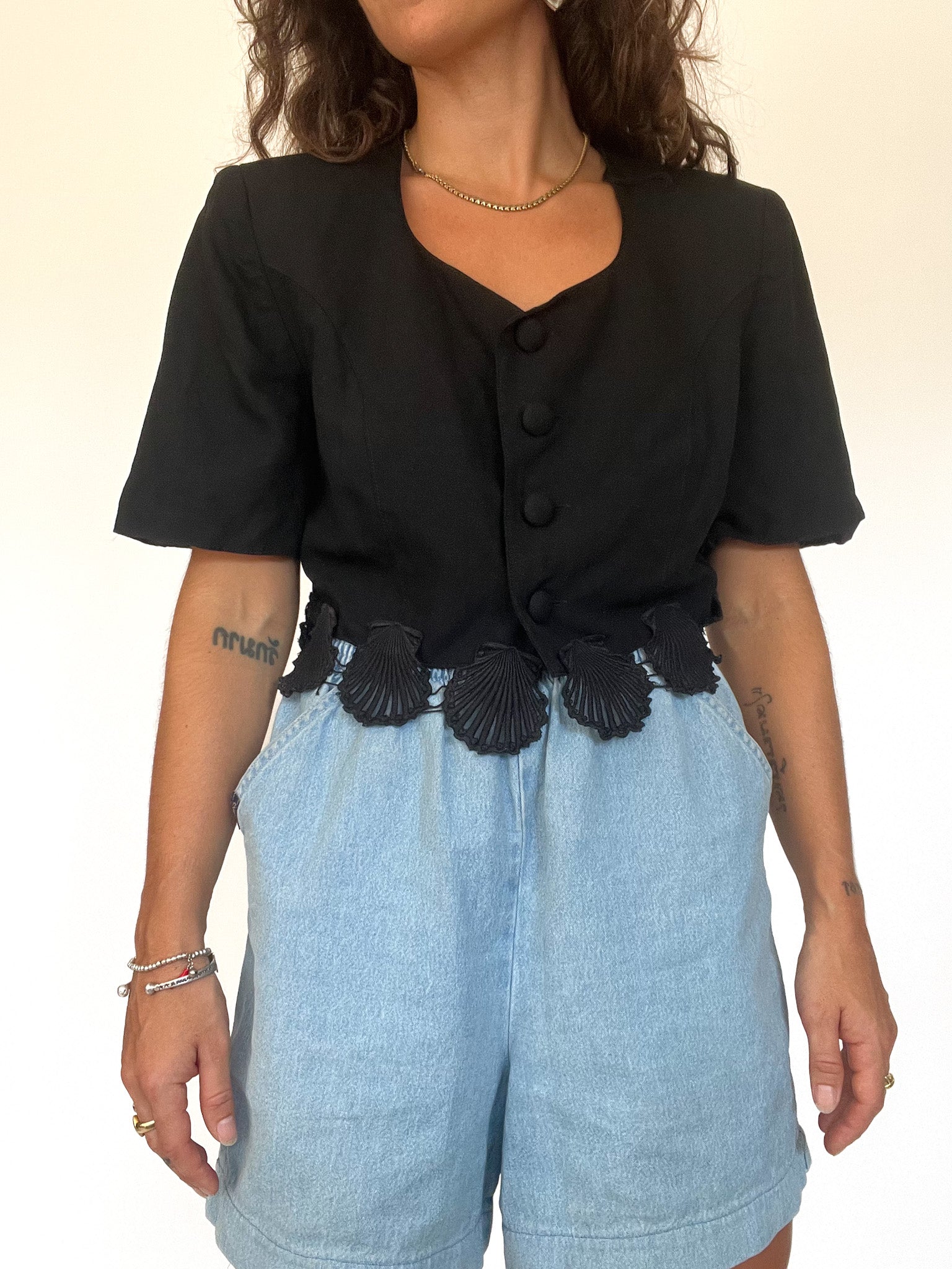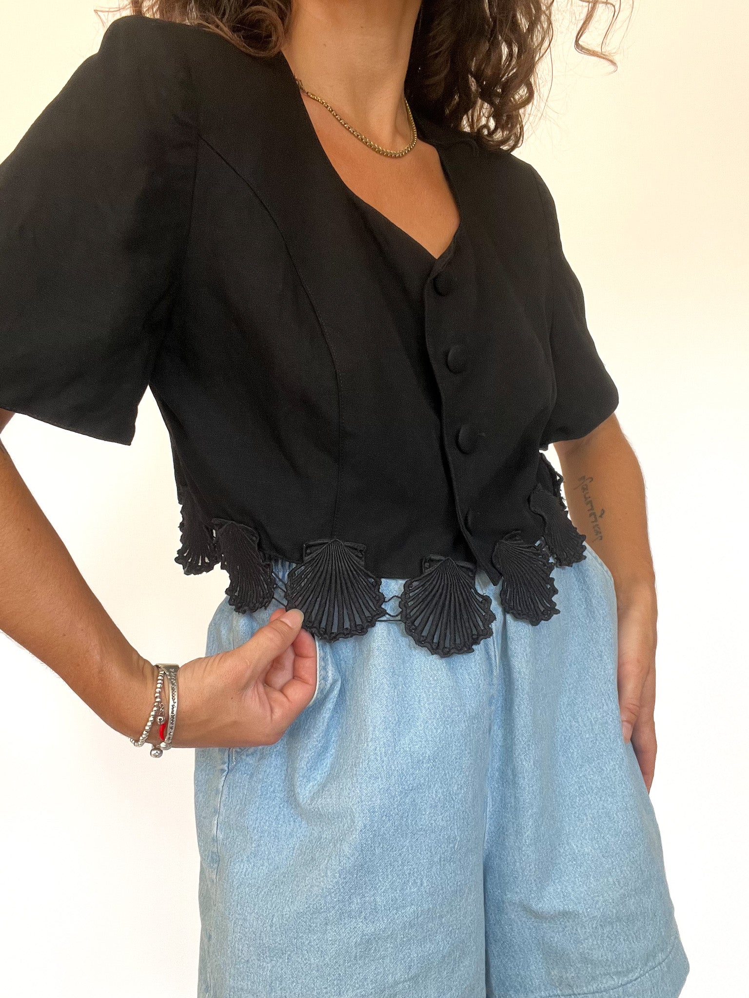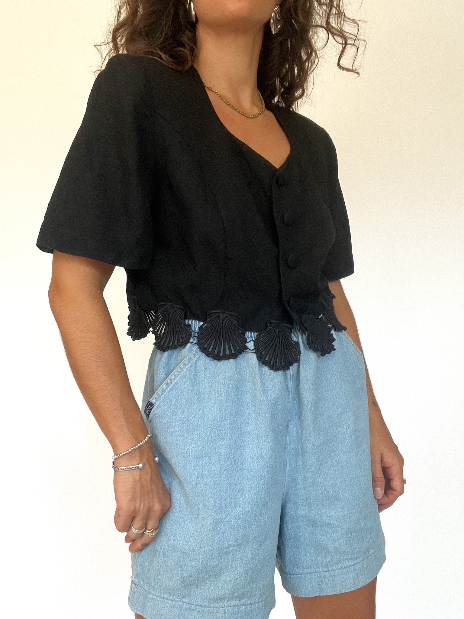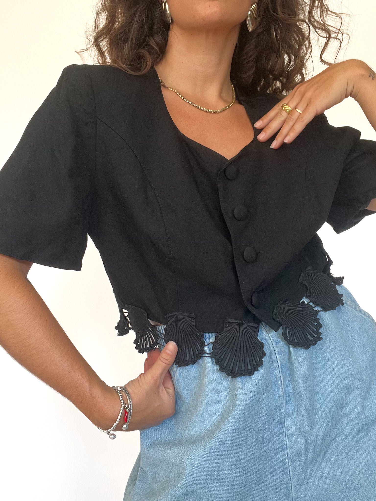 Vintage 90’s Black Linen-Blend Shell Trim Blouse