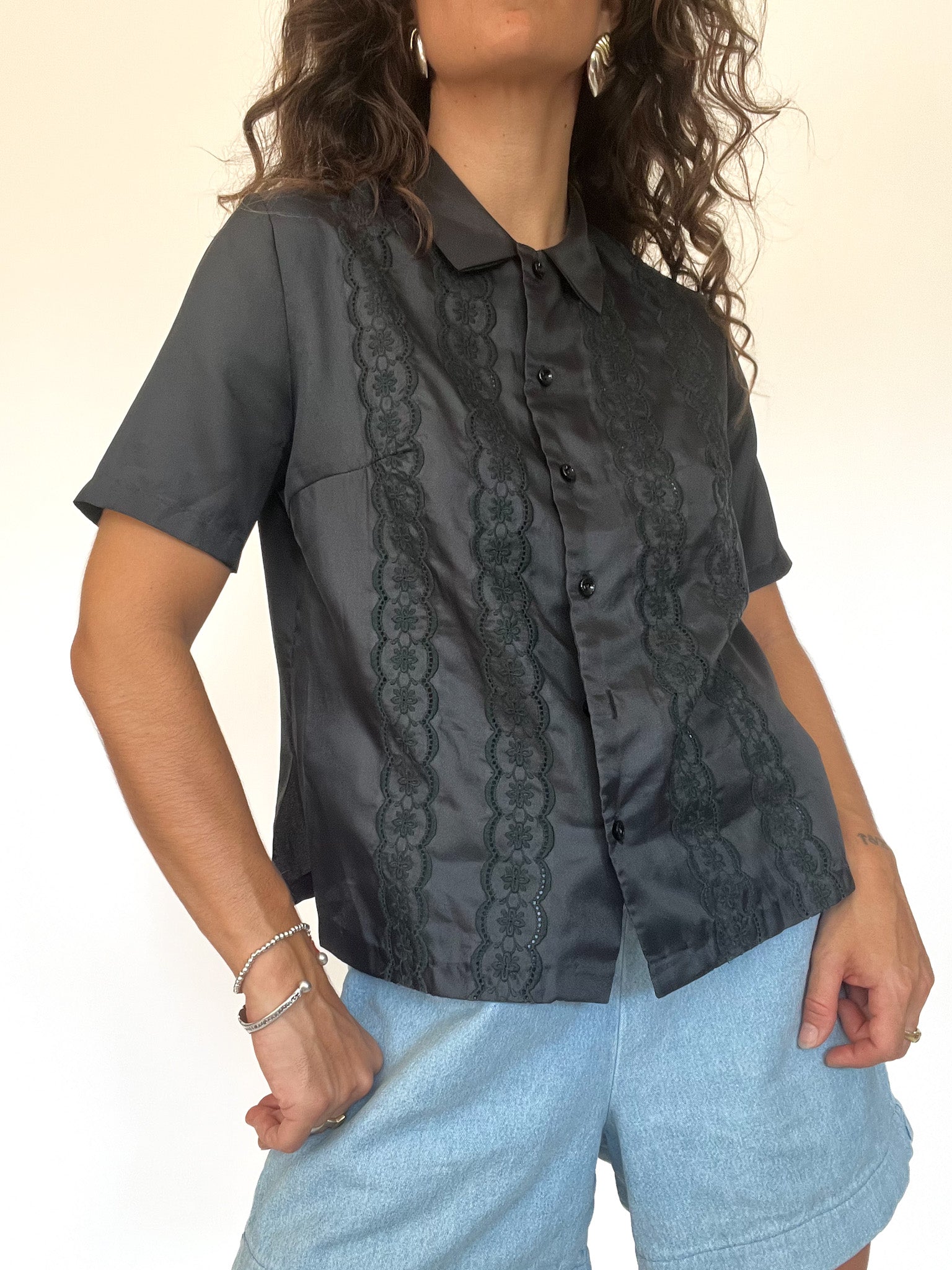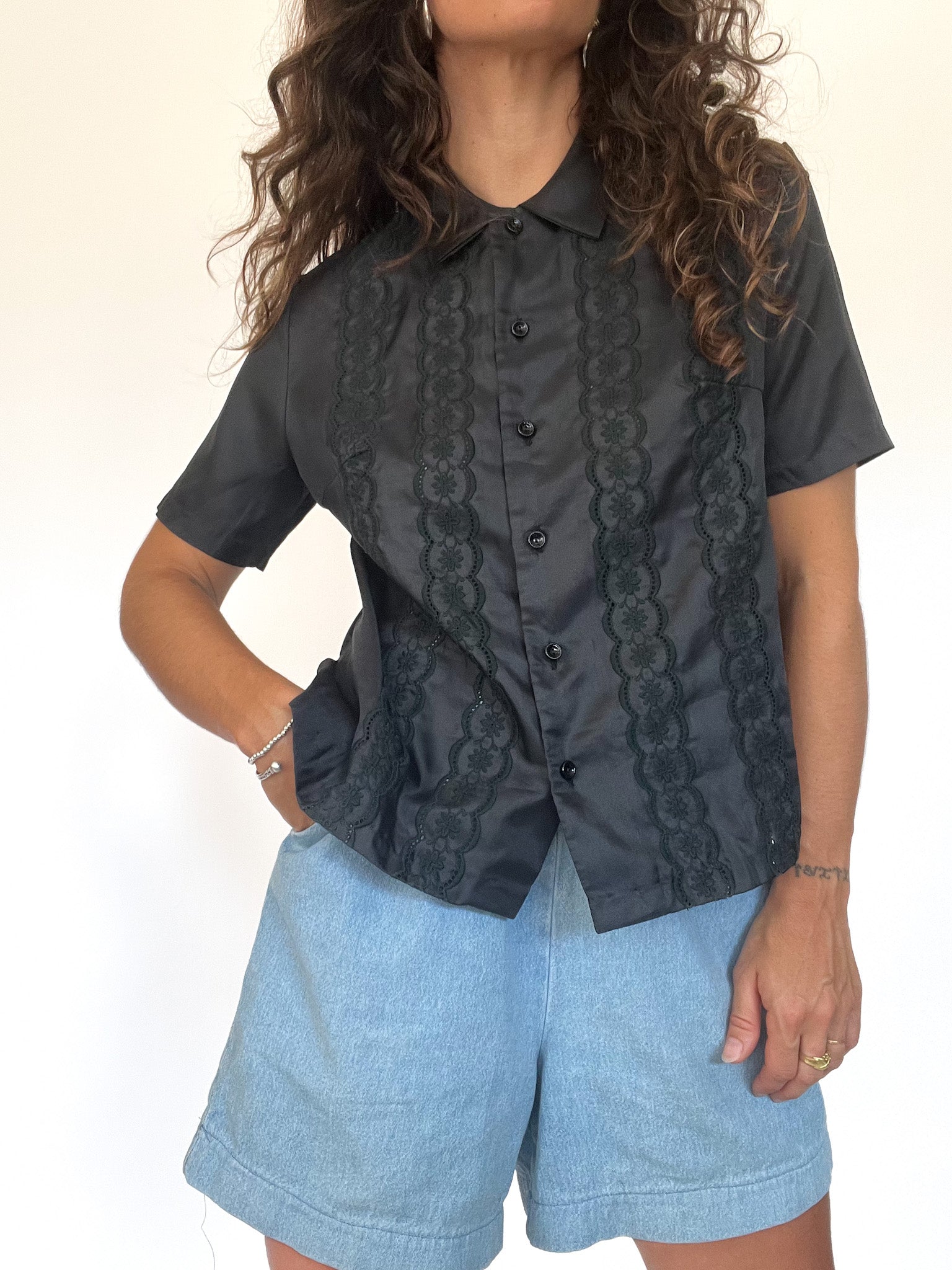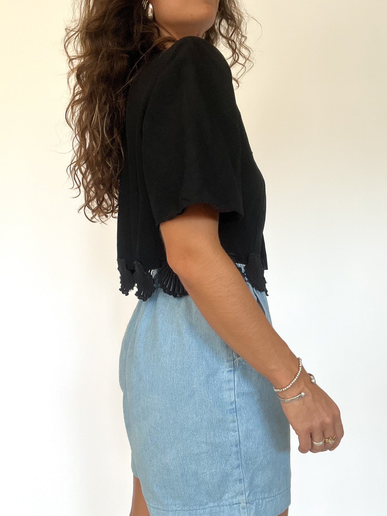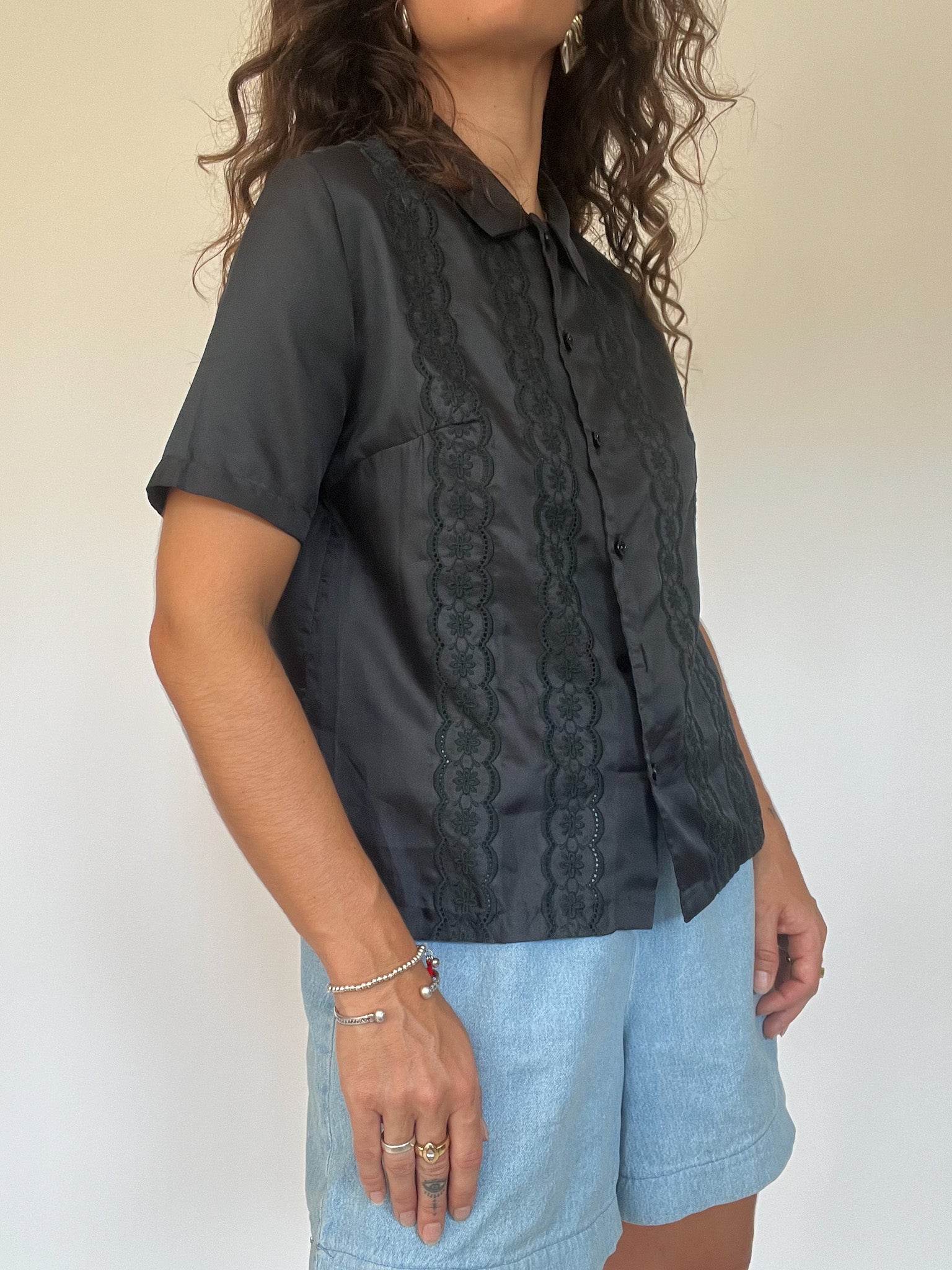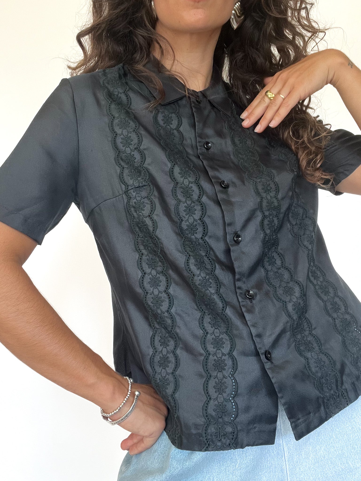 Vintage 90’s Black Linen-Blend Shell Trim Blouse