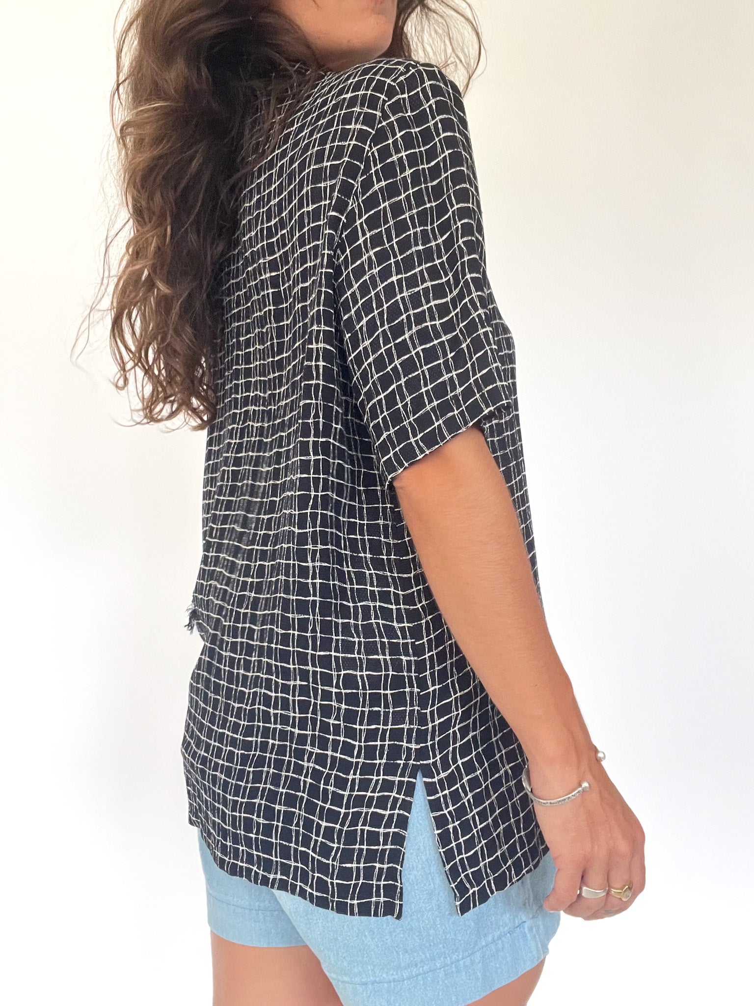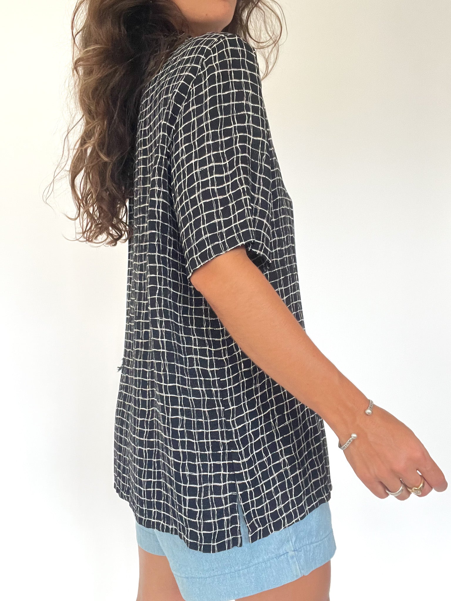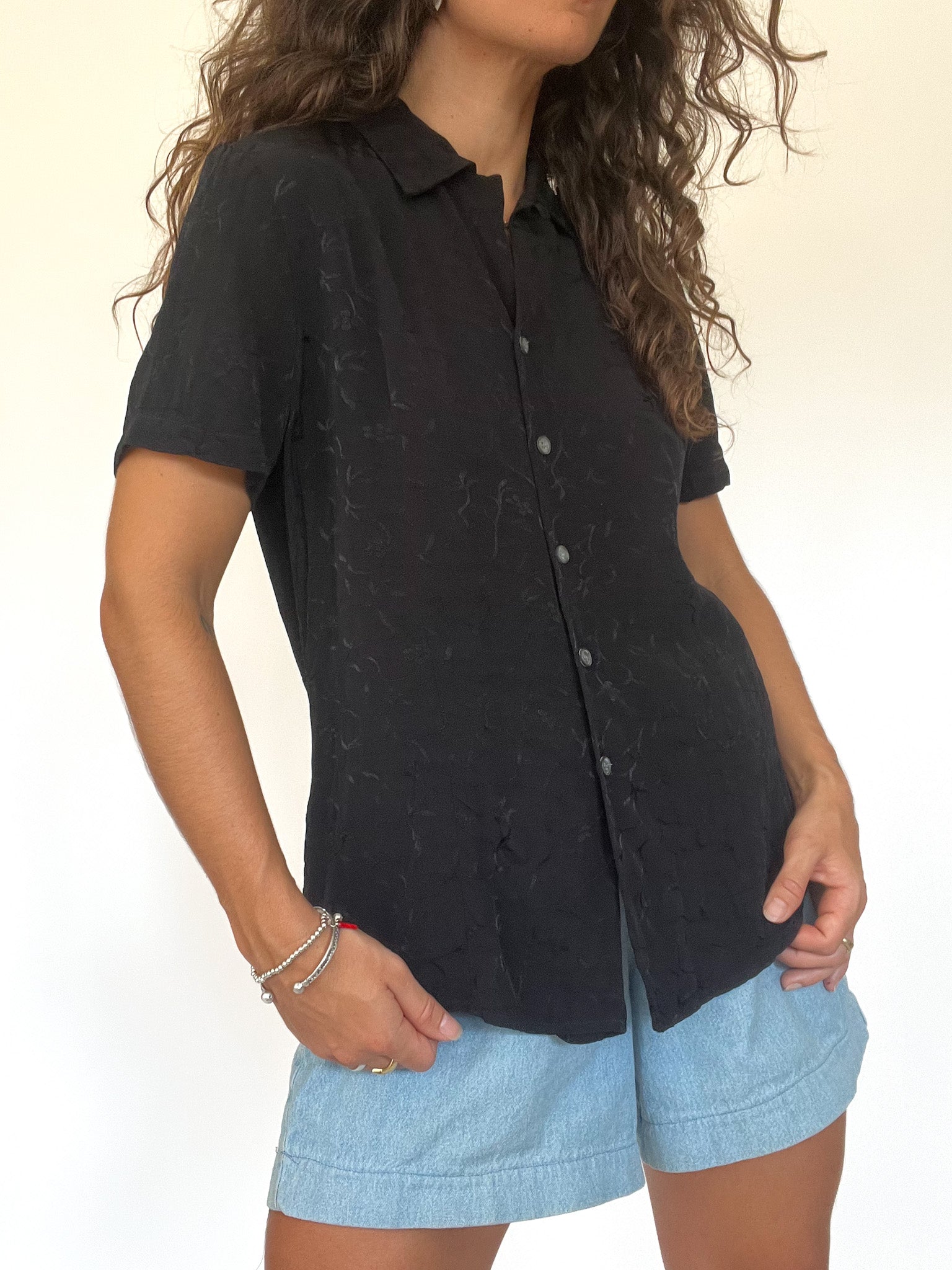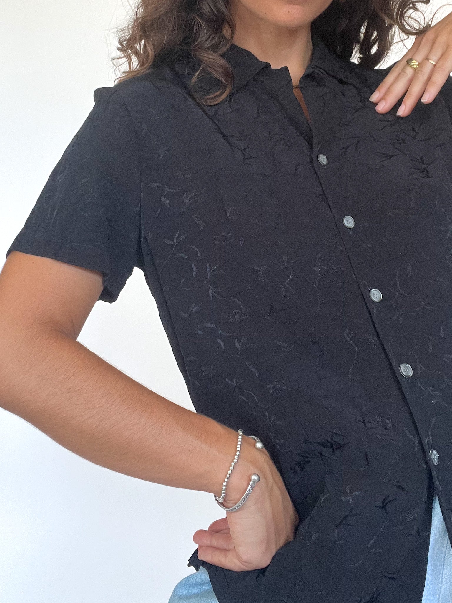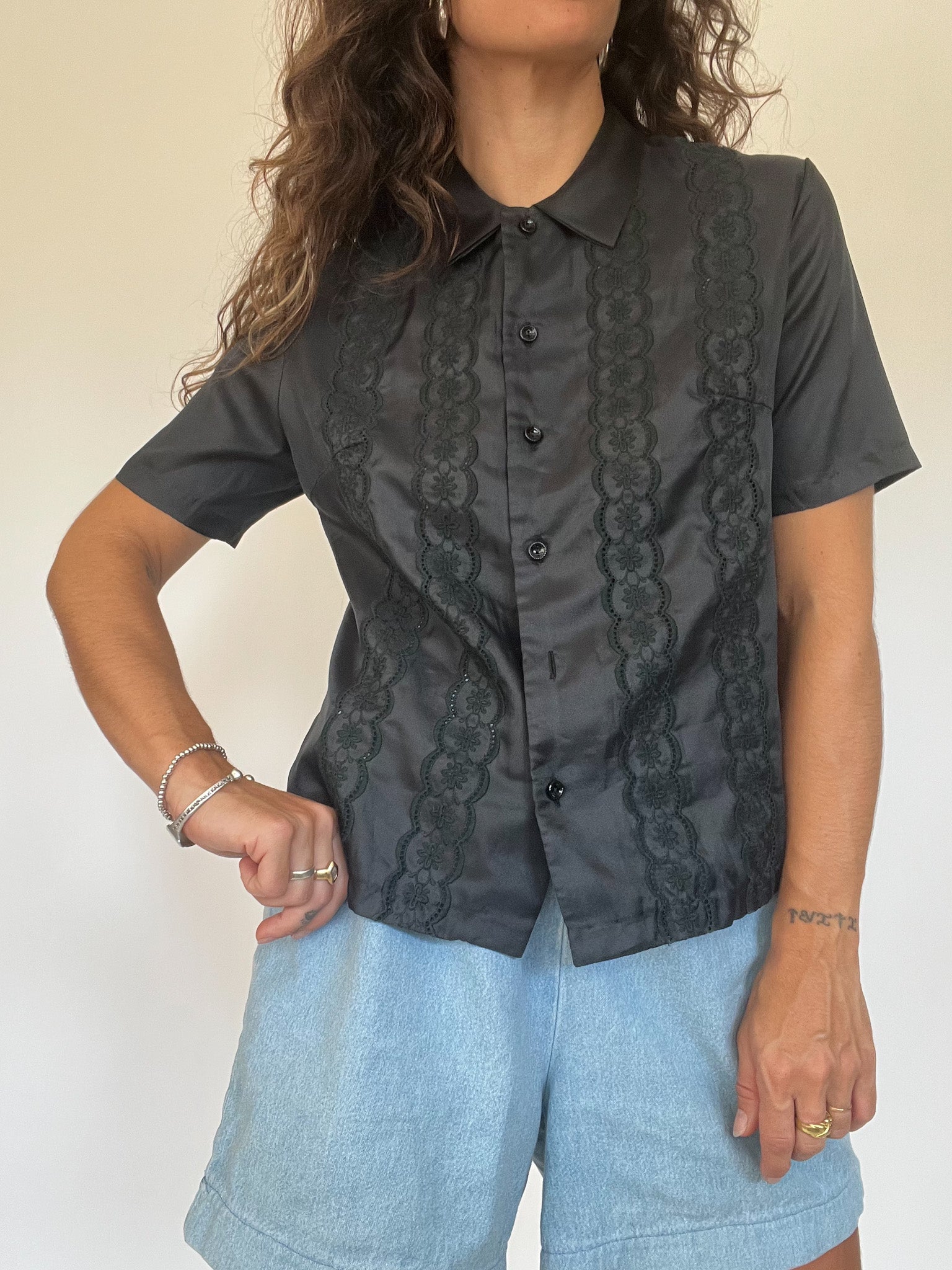 Vintage 90’s Black Linen-Blend Shell Trim Blouse