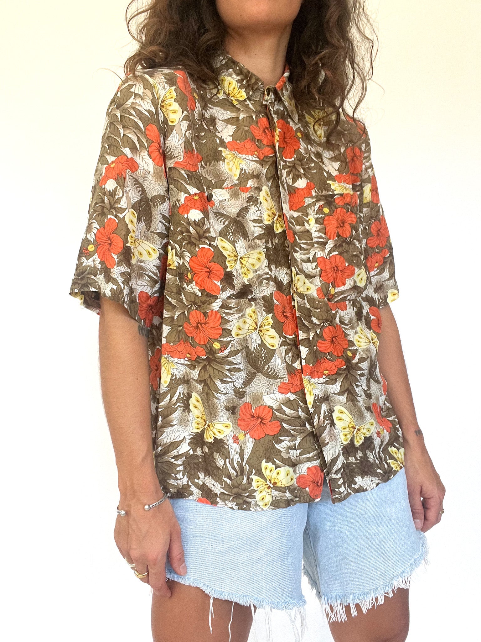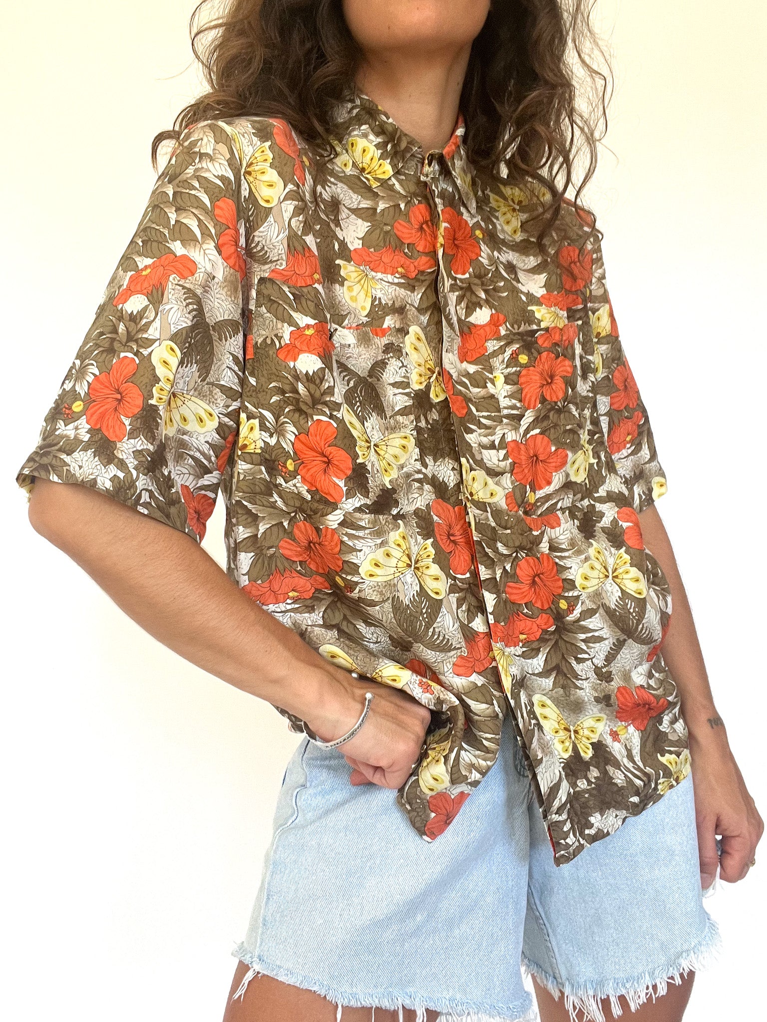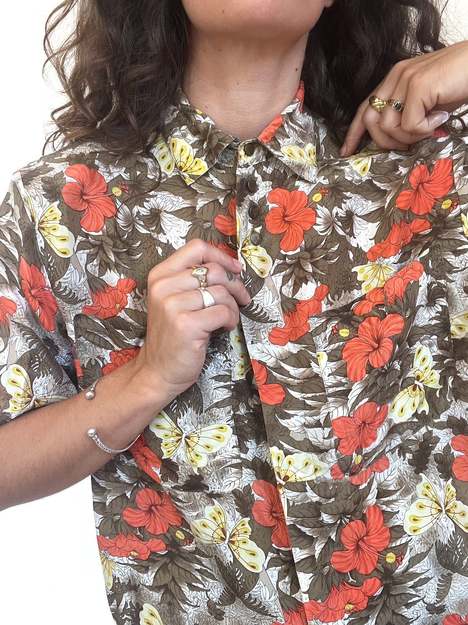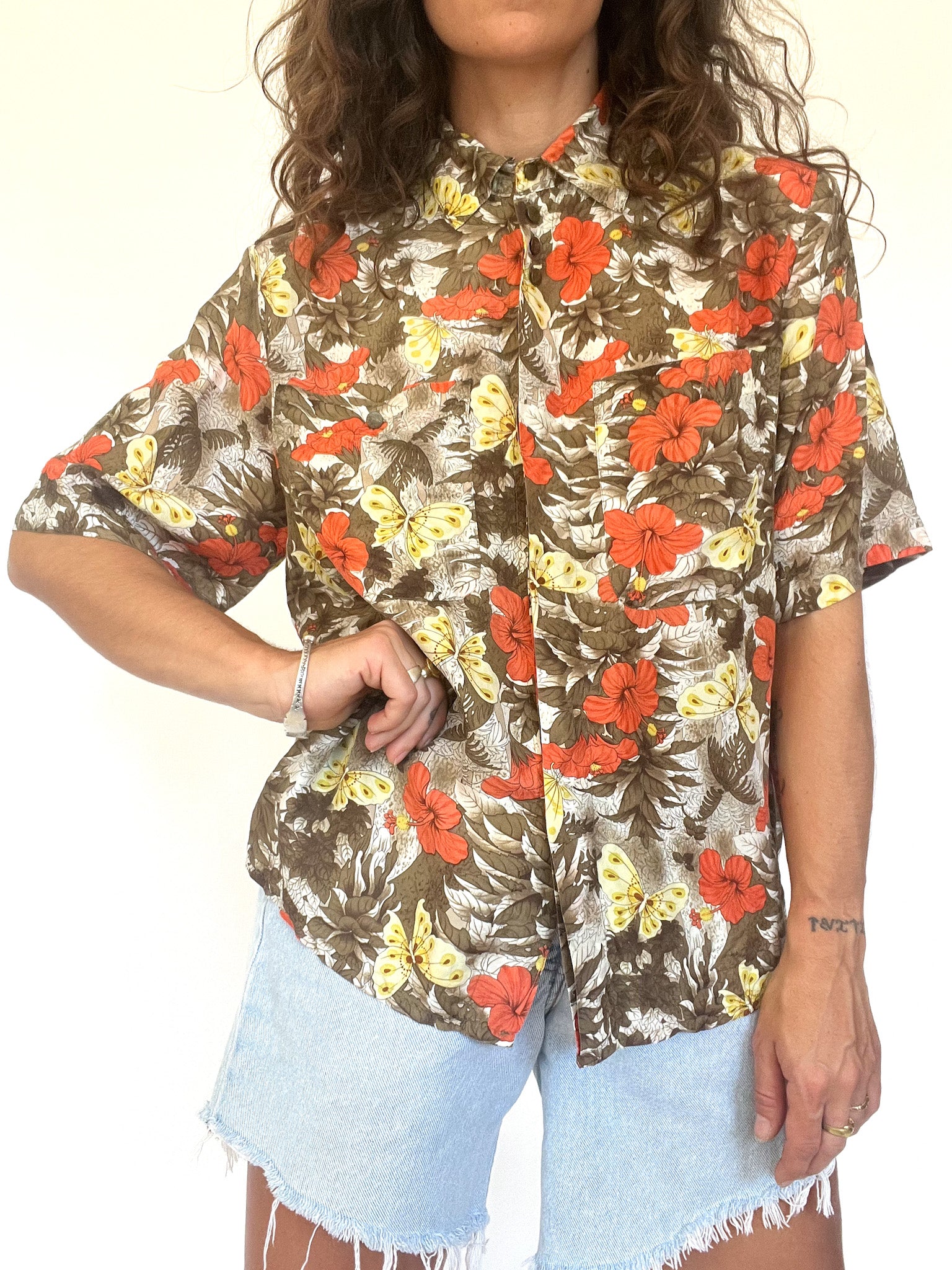 Vintage 90’s Tropical Butterfly & Hibiscus Short Sleeve Shirt