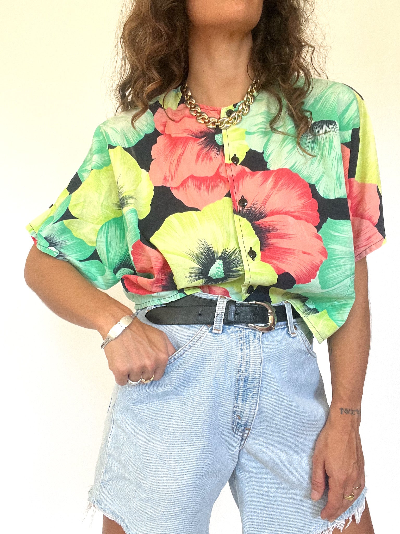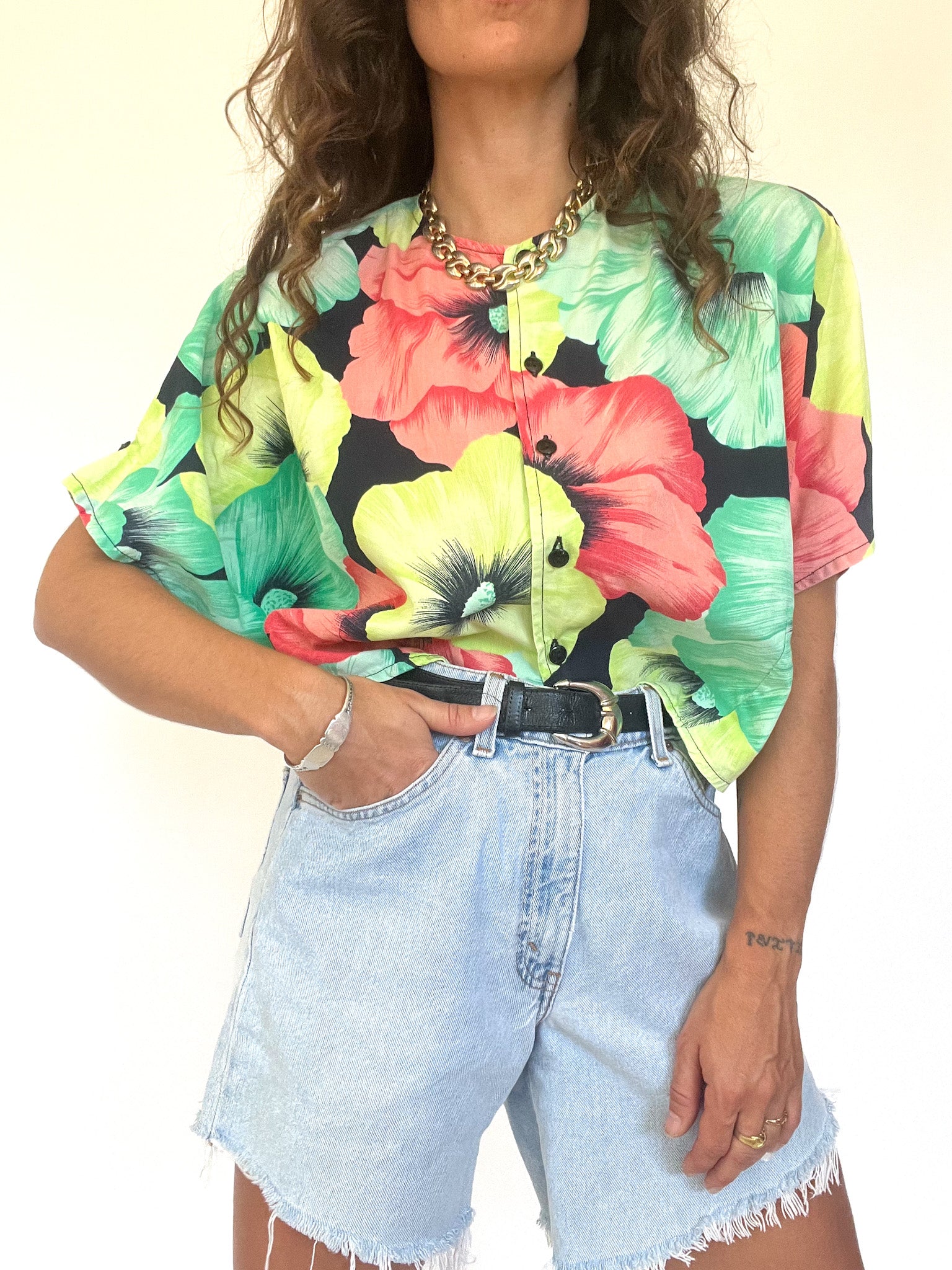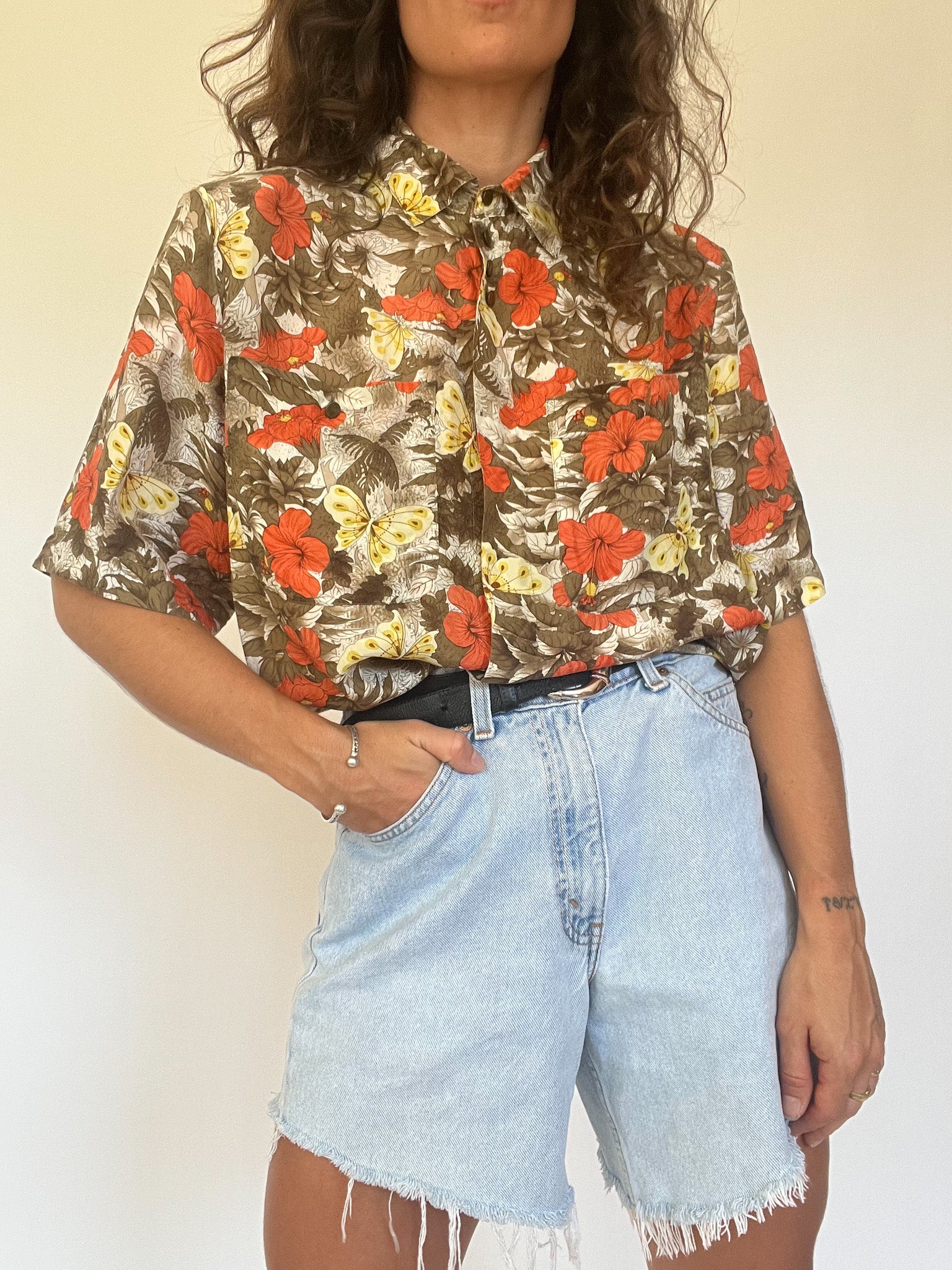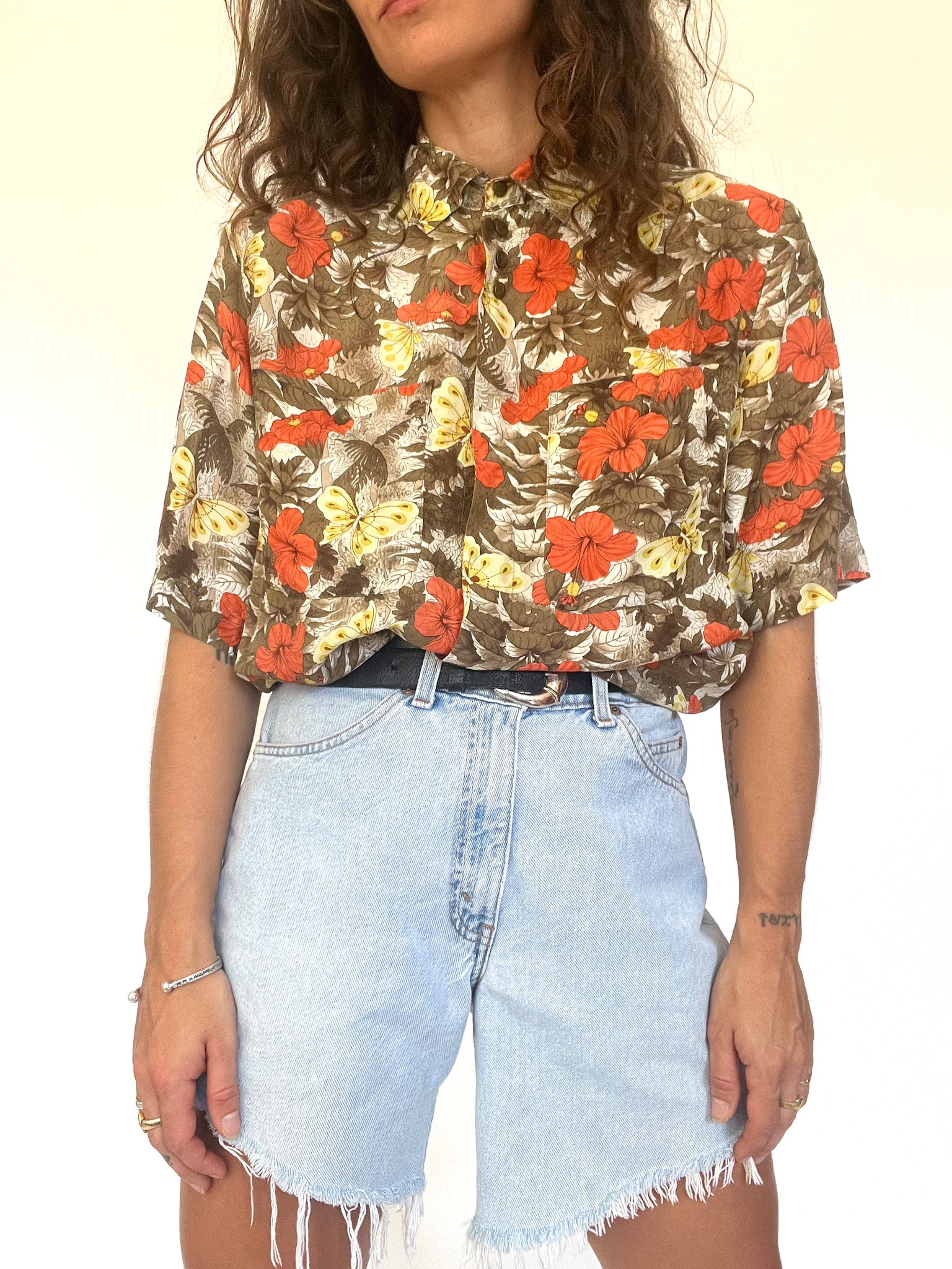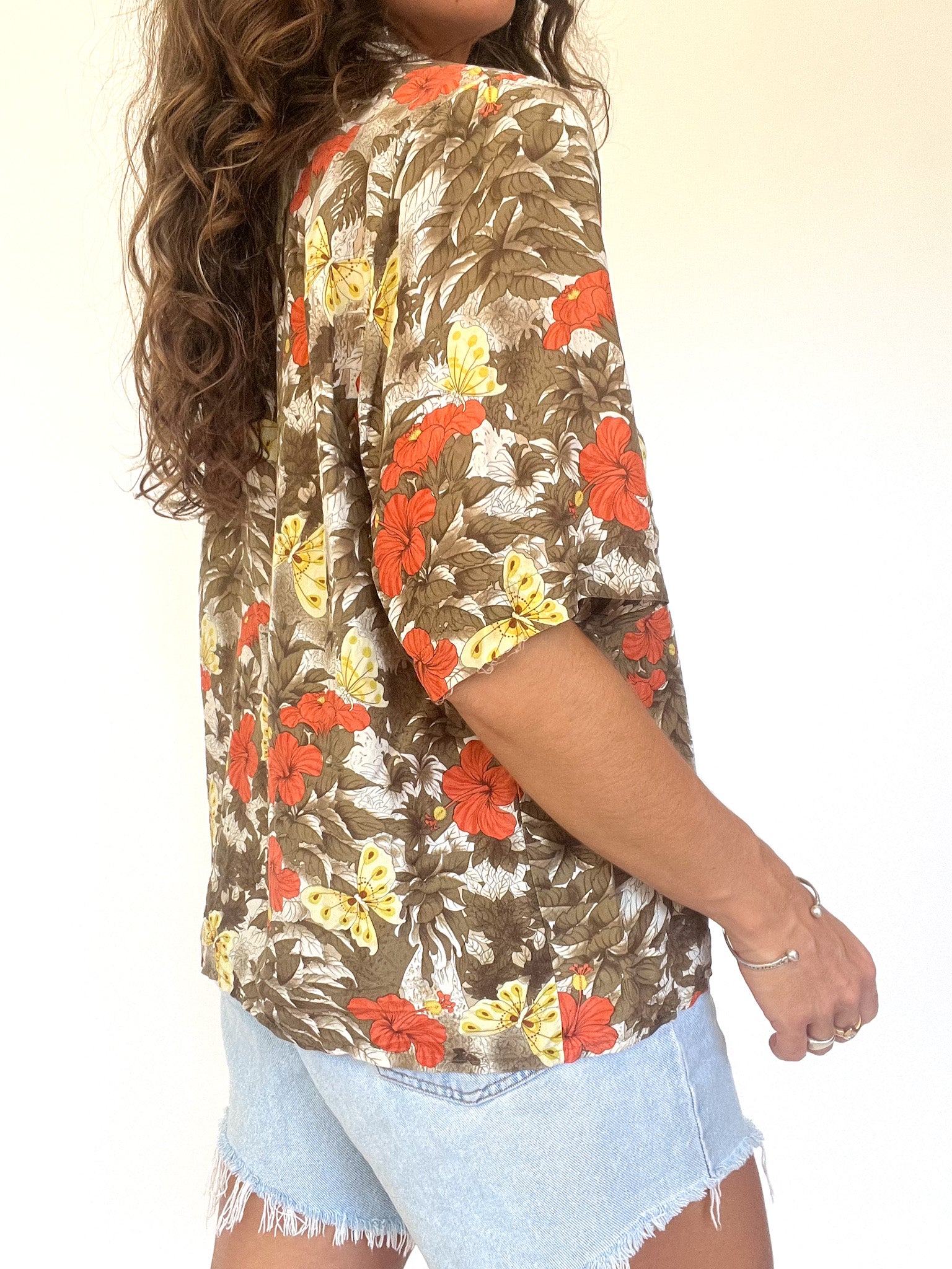 Vintage 90’s Tropical Butterfly & Hibiscus Short Sleeve Shirt