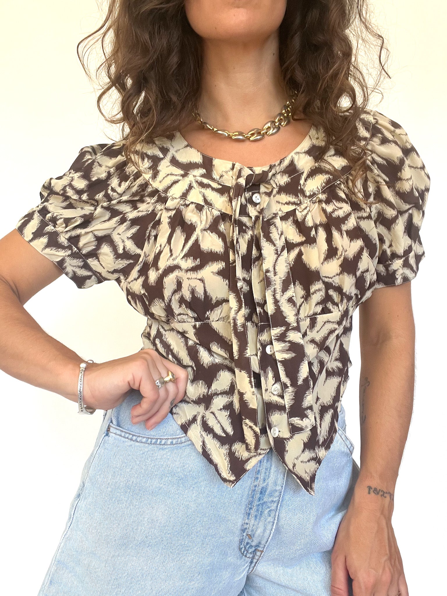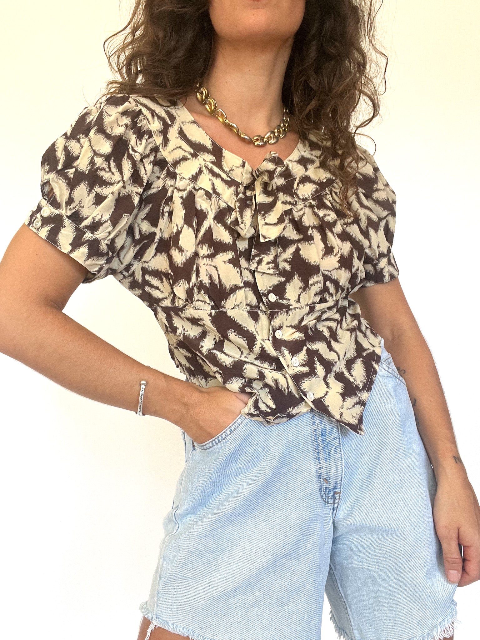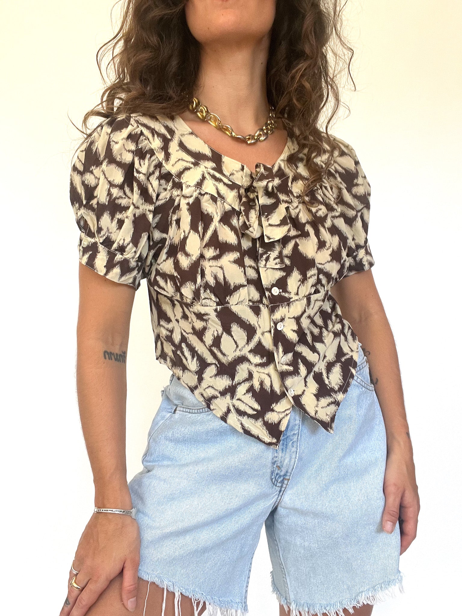 Vintage 80’s Silk Leaf Print Blouse with Tie Collar