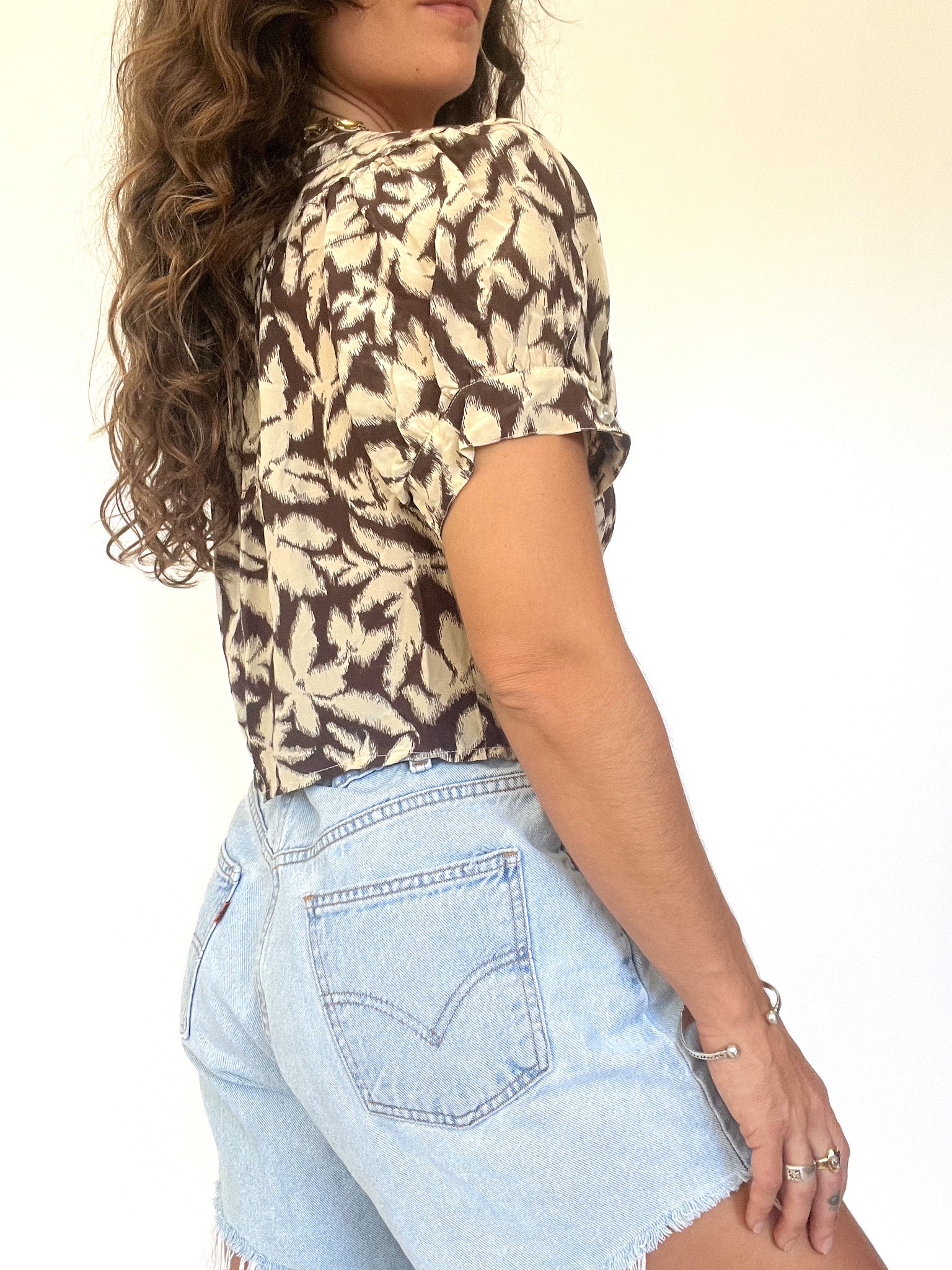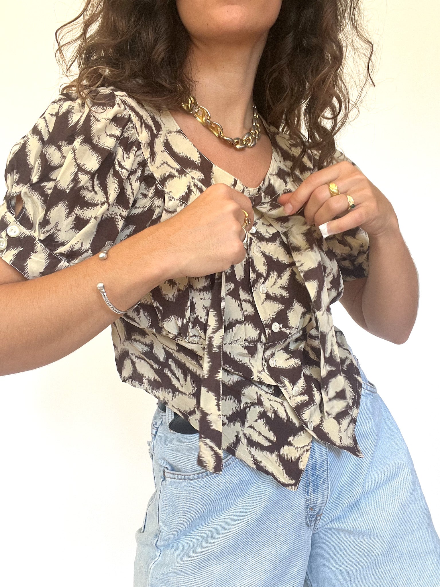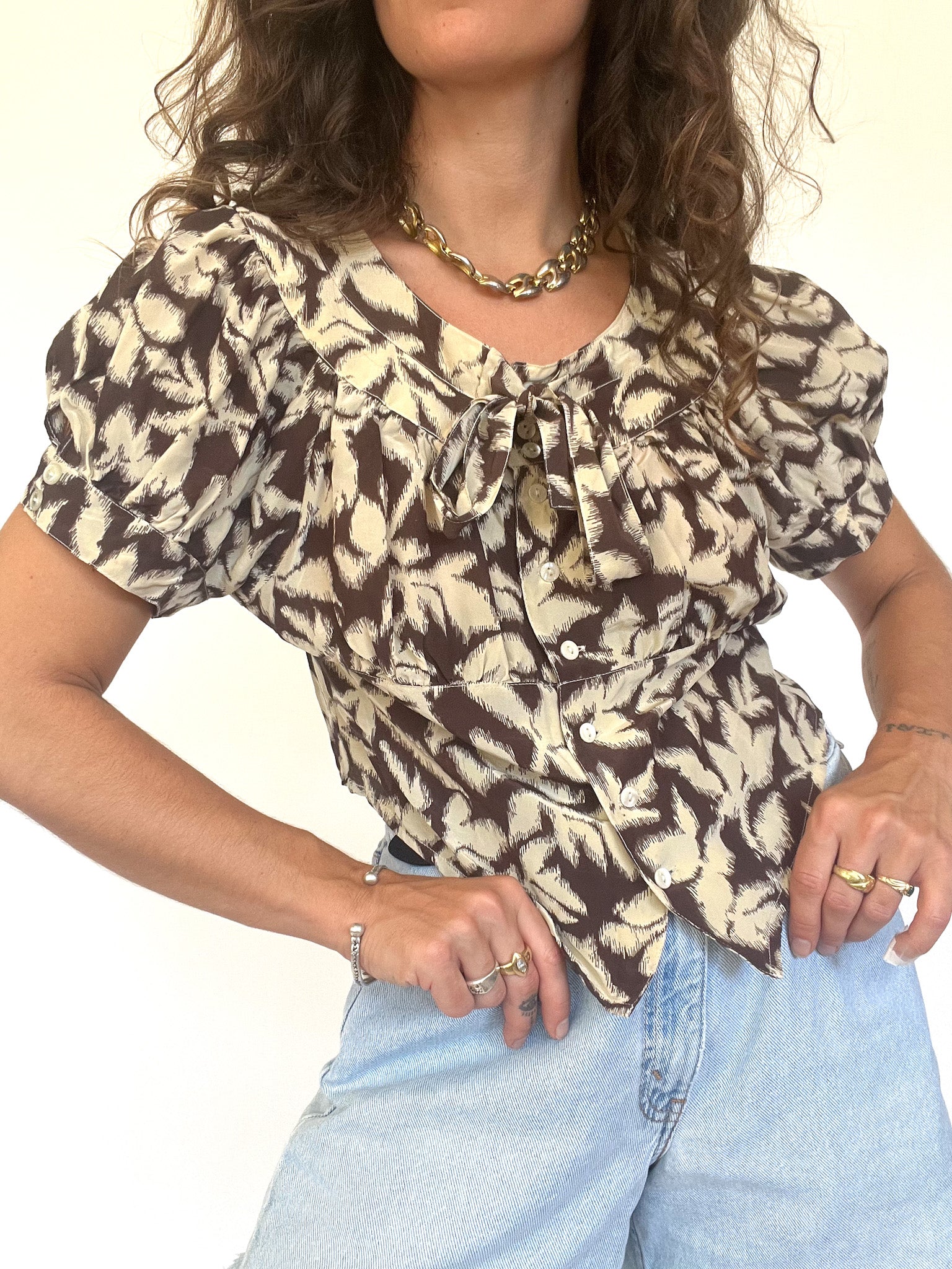 Vintage 80’s Silk Leaf Print Blouse with Tie Collar