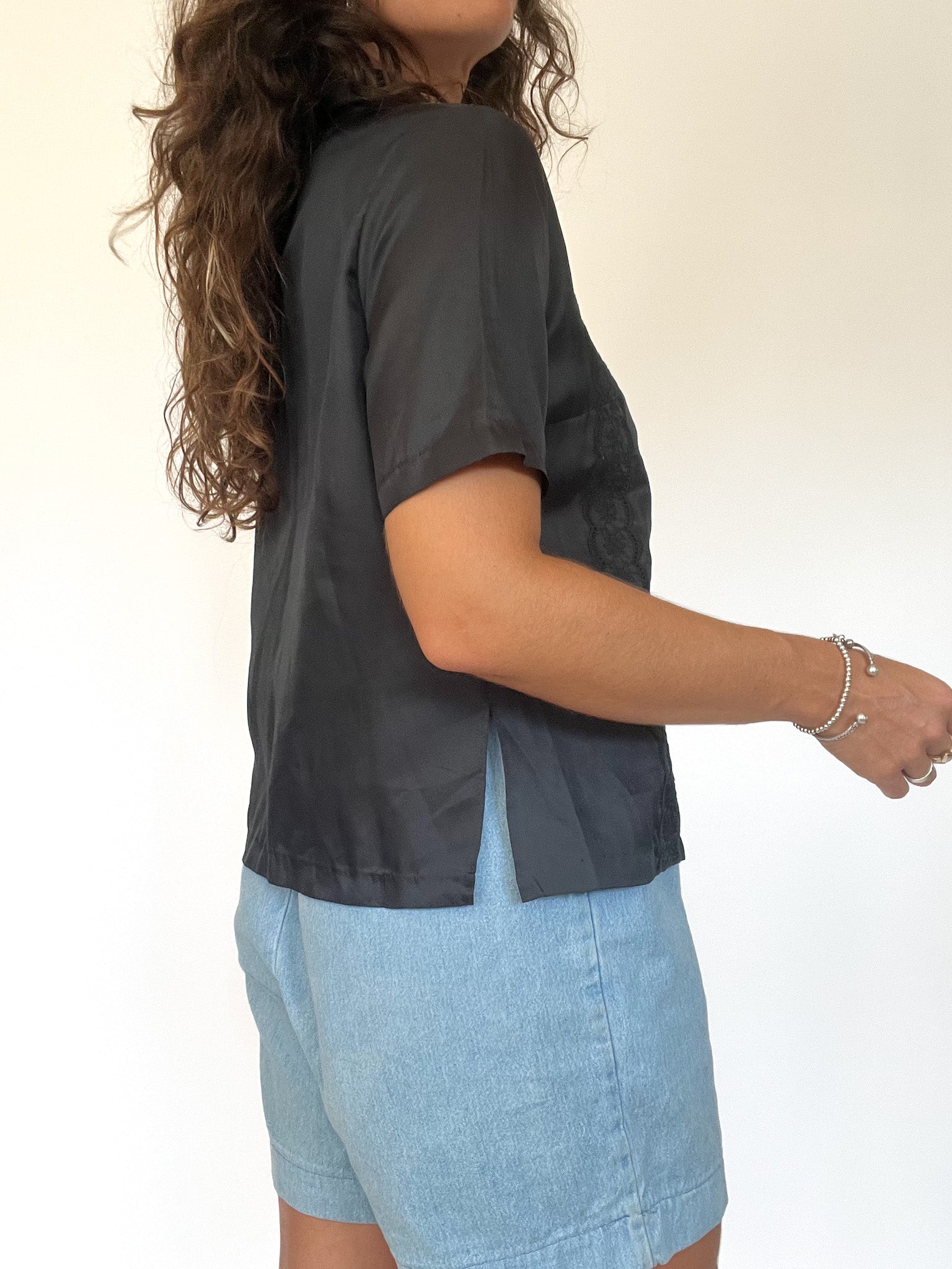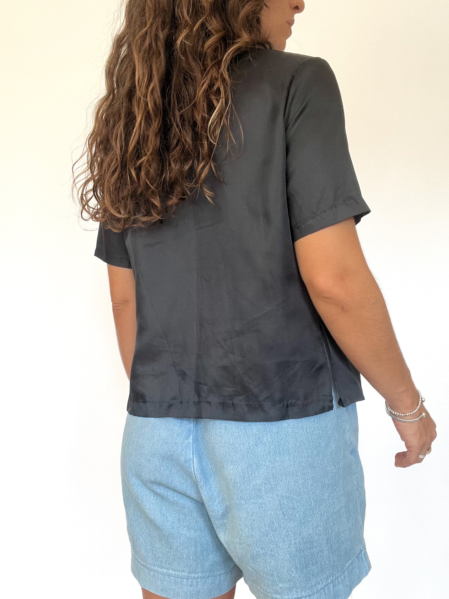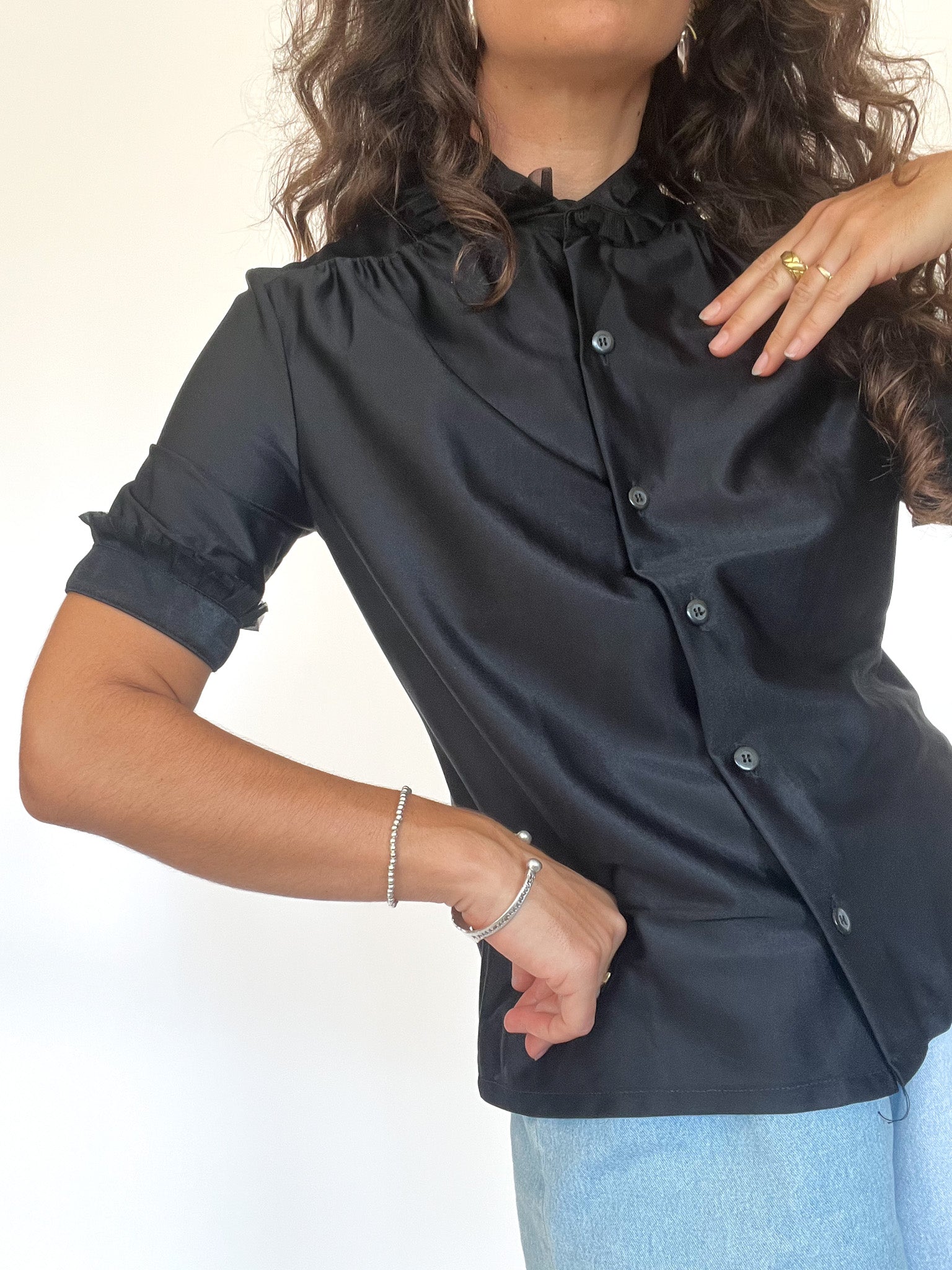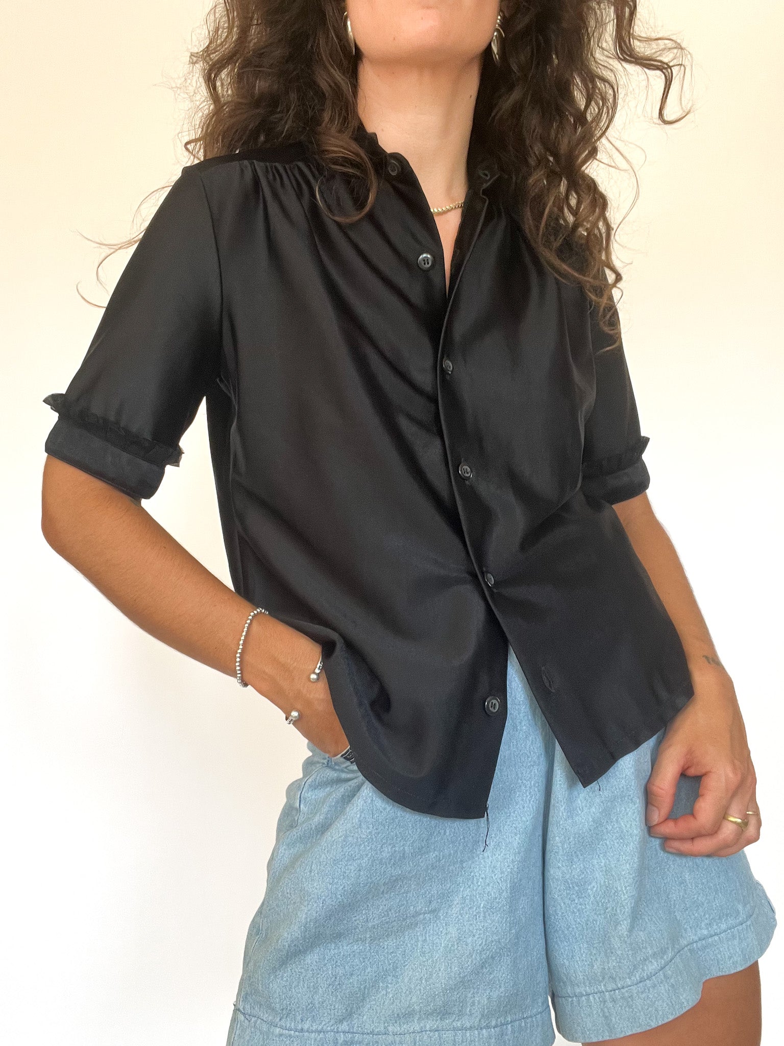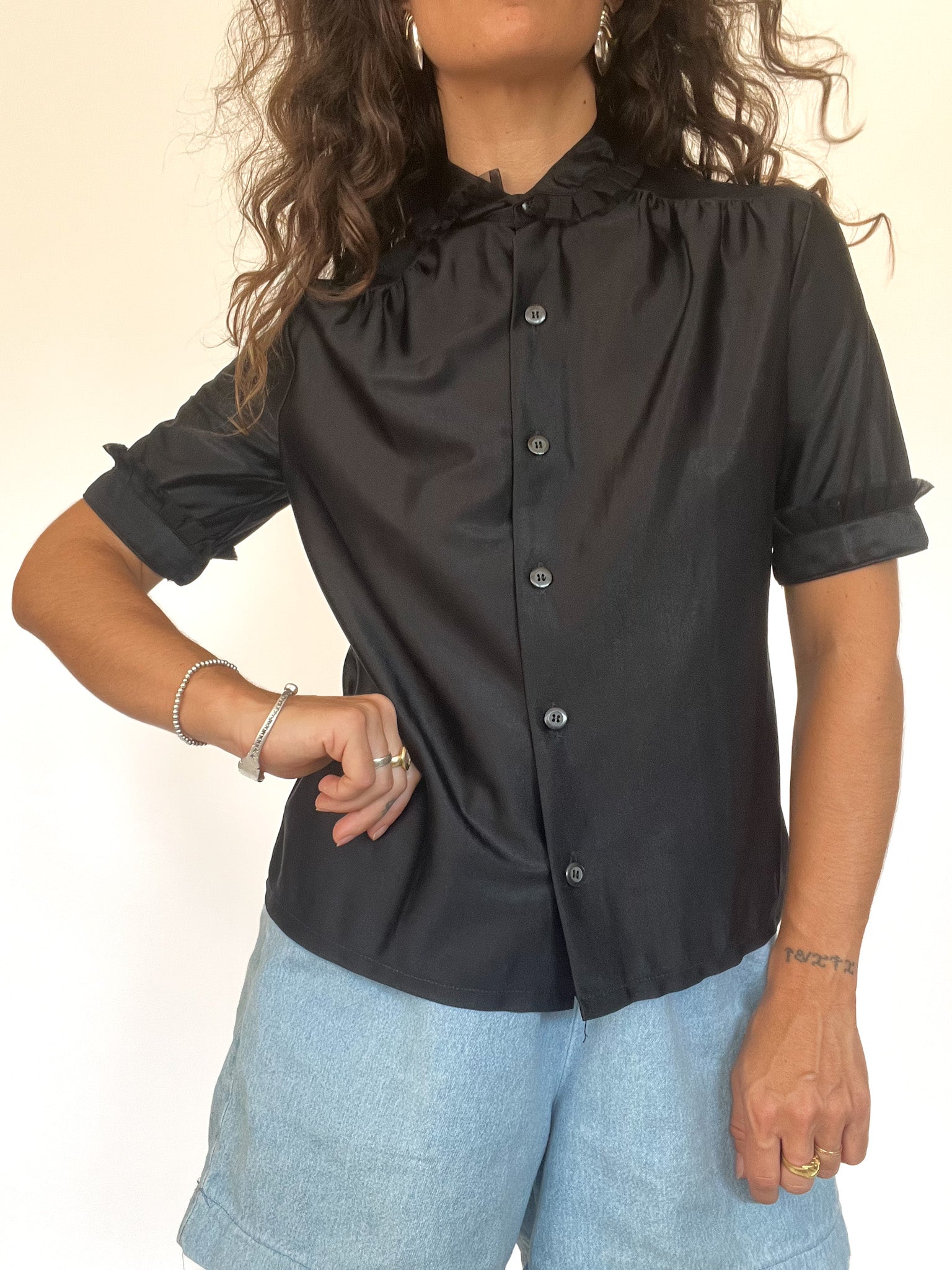Vintage 90’s Black Satin Blouse with Ruffle Trim