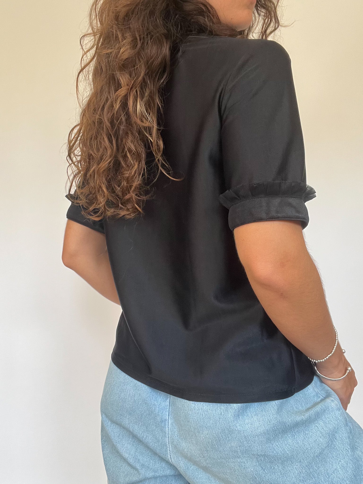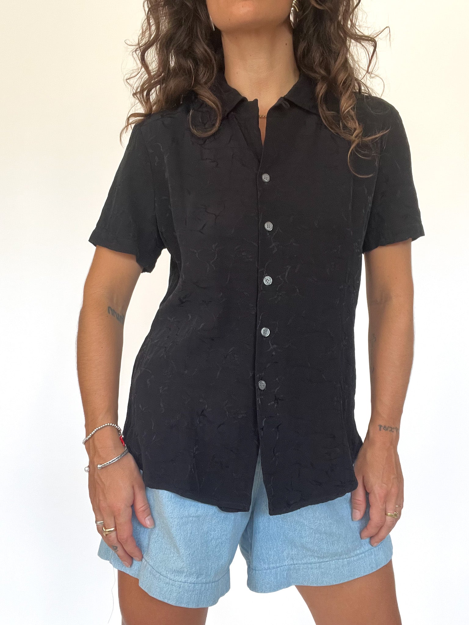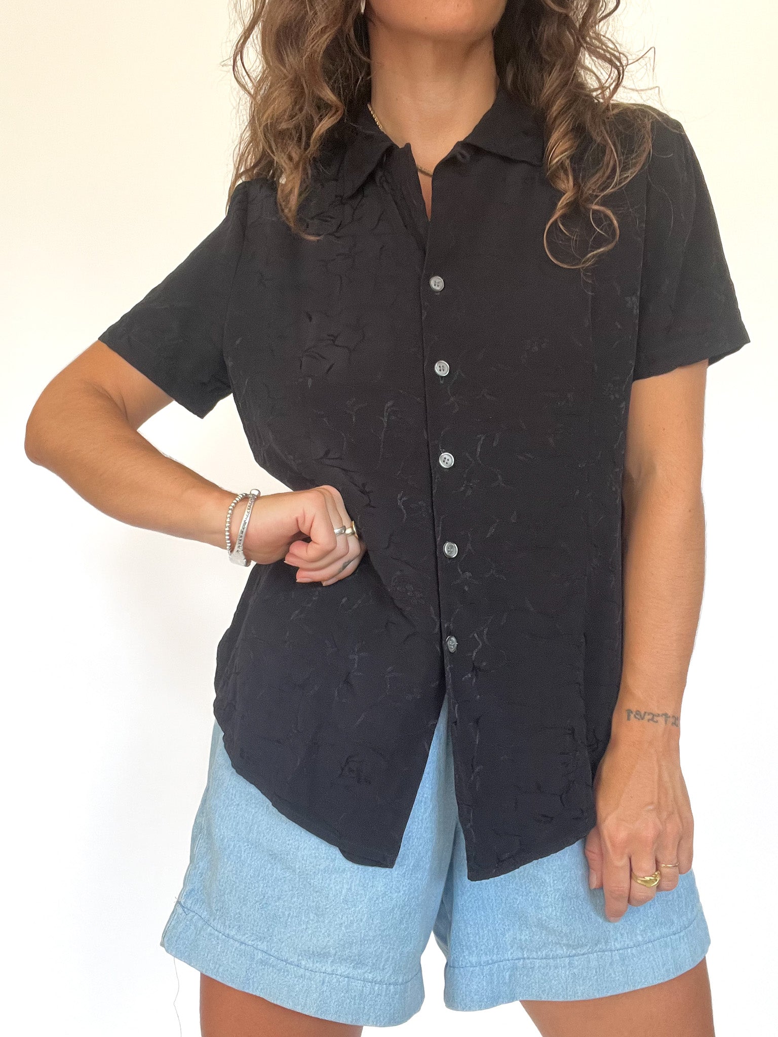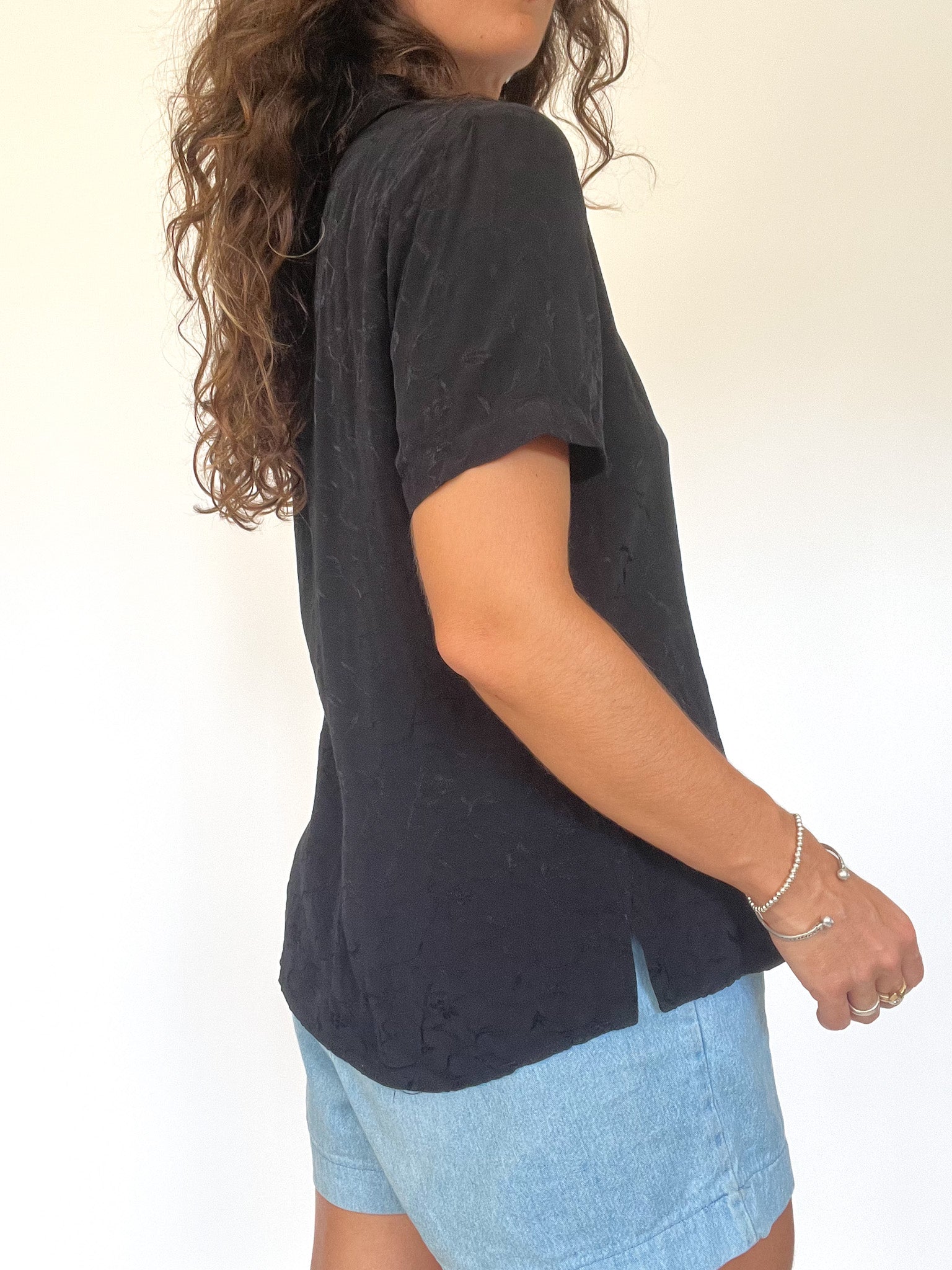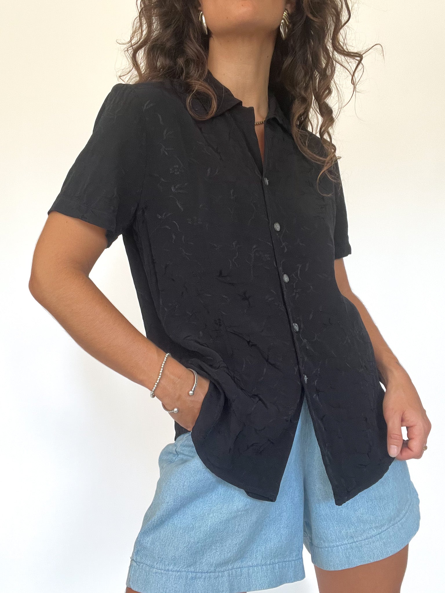 Vintage 90’s Black Satin Blouse with Ruffle Trim