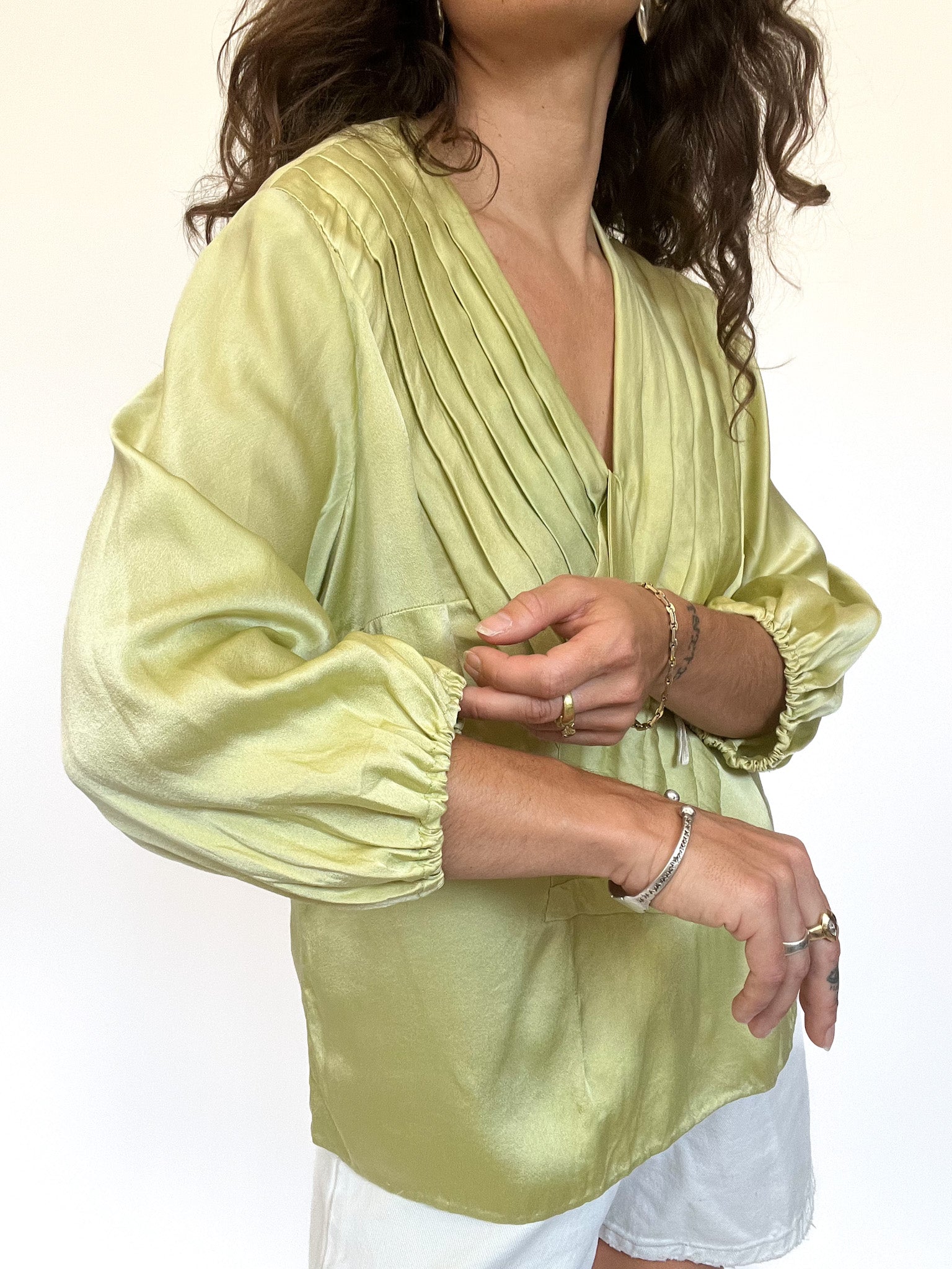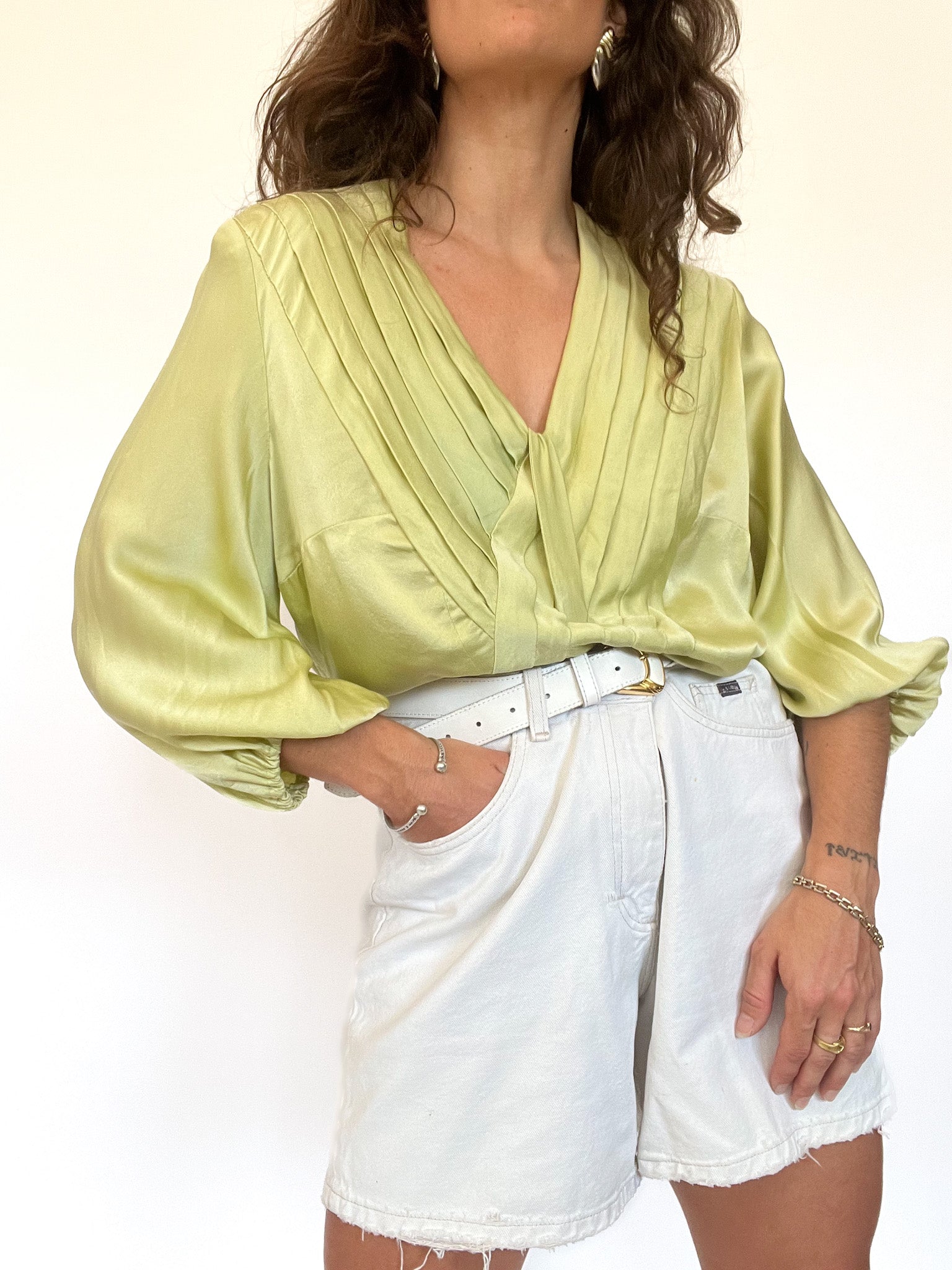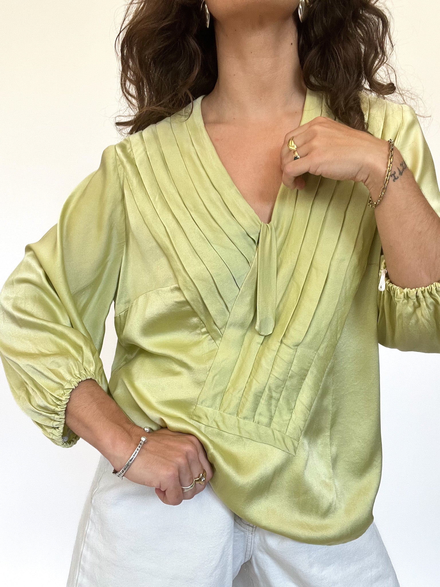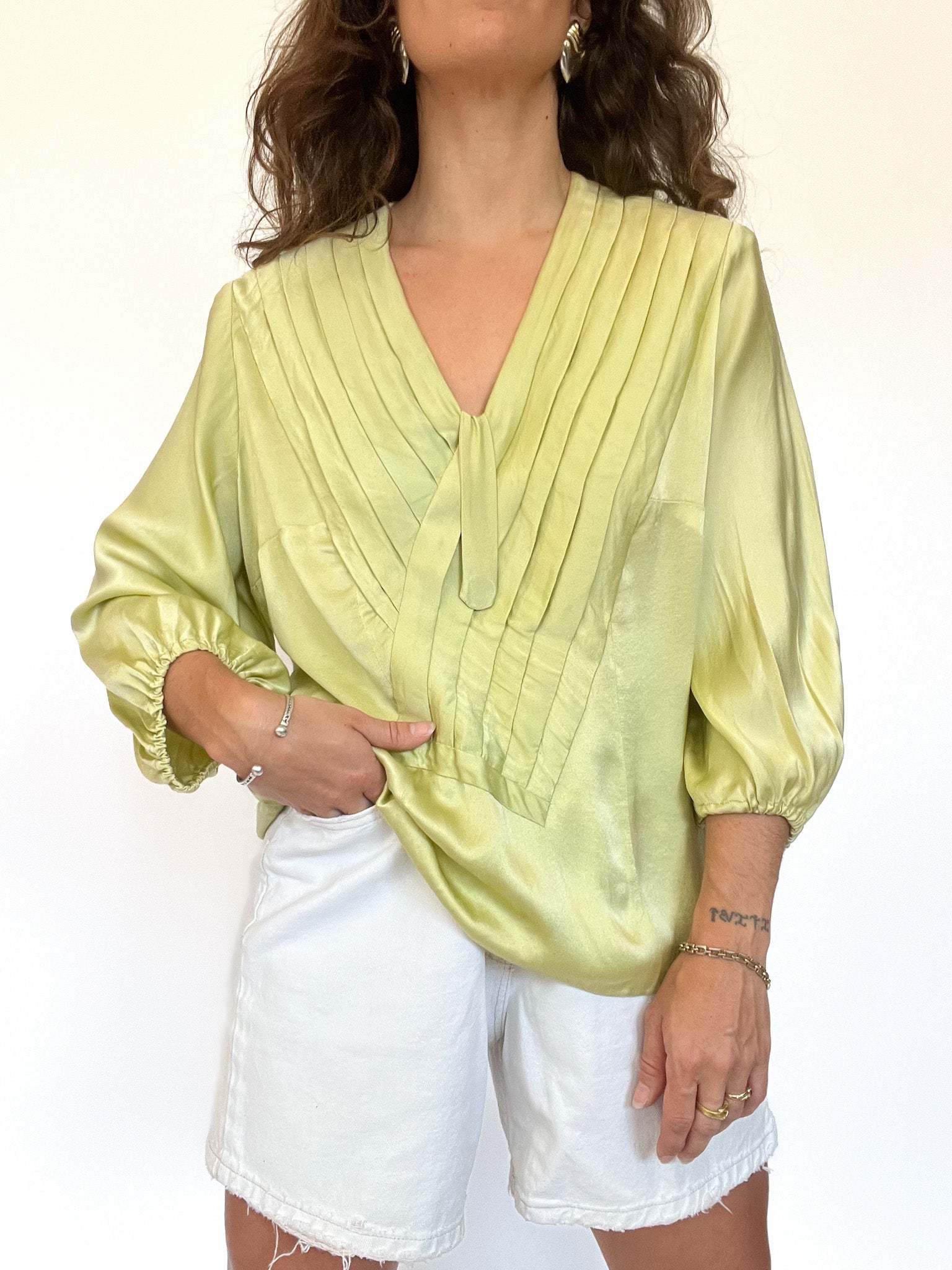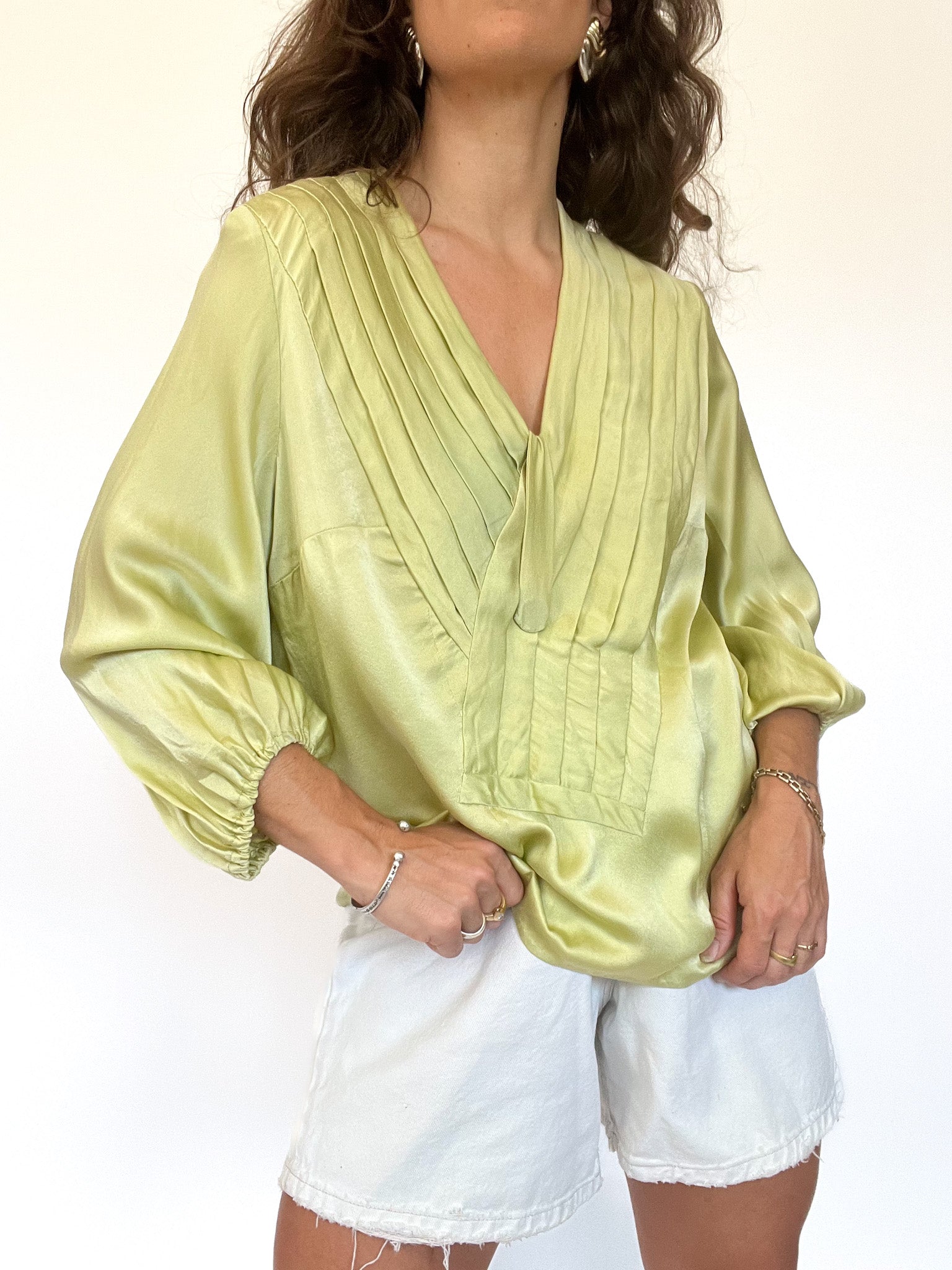 Vintage 80’s Lime Satin Blouse with Pleated Detail