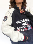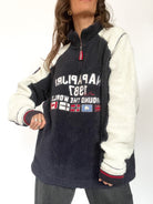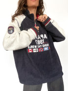 A bold and ultra-cozy second-hand Napapijri fleece pullover, featuring a sporty, expedition-inspired design. The contrast of deep navy and crisp white adds a dynamic edge, while the embroidered details and half-zip closure enhance its retro appeal.