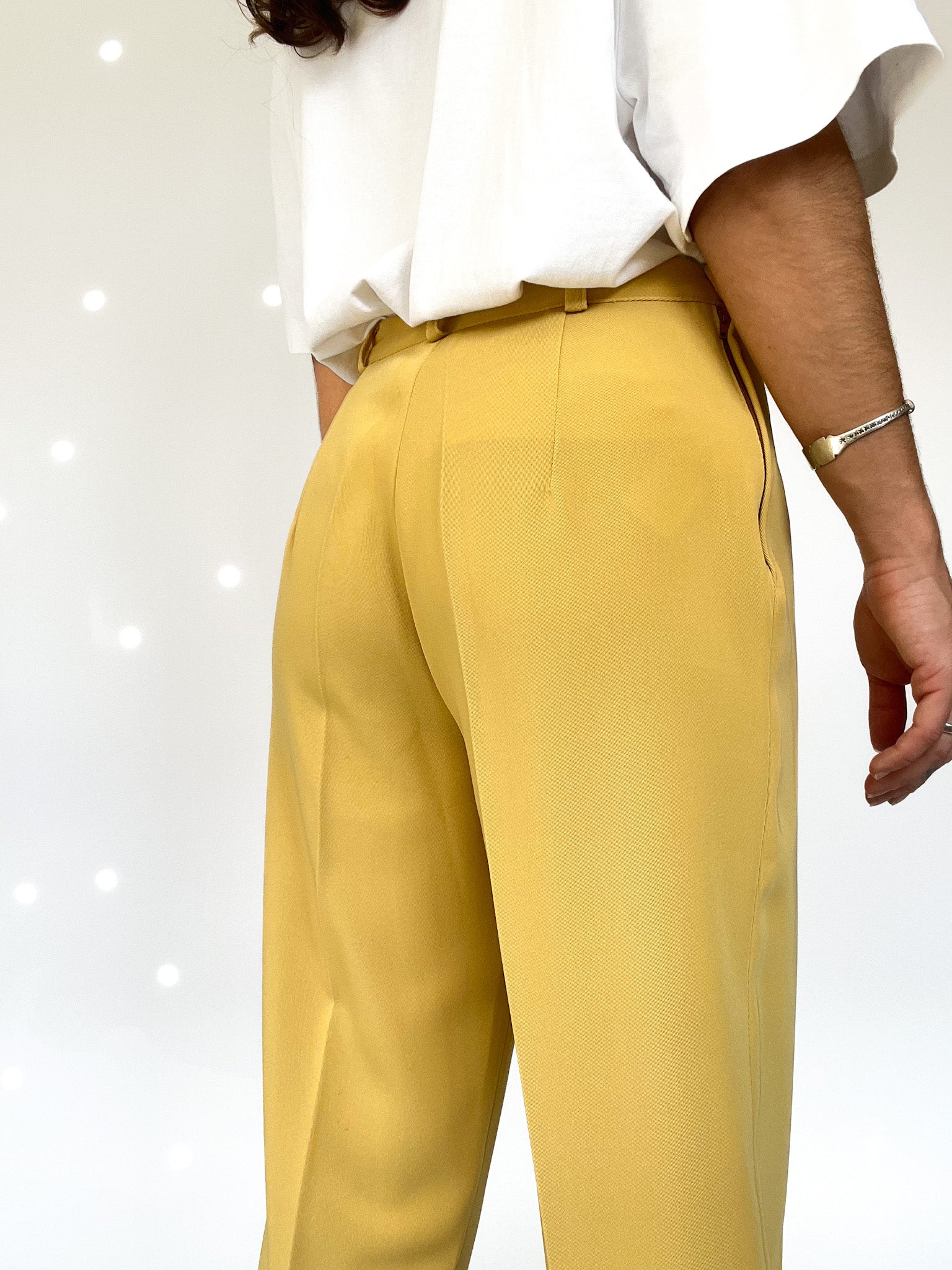 A statement piece with a refined silhouette, these vintage mustard yellow trousers exude effortless sophistication. Tailored to perfection, they feature a flattering high waist and a sleek, elongated leg for a timelessly elegant look. Their structured yet fluid drape makes them a versatile wardrobe essential, ideal for elevating any outfit with a pop of muted color.