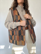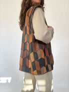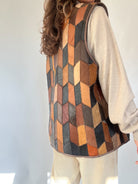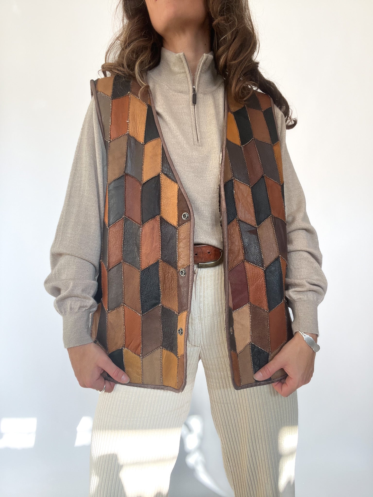 This unique vintage leather vest is crafted from a patchwork of multicolored leather panels, creating a bold geometric pattern in earthy tones. Each leather piece brings its own texture and hue, making this vest a one-of-a-kind layering piece. Perfect over a sweater or blouse, it adds an artisanal touch to any outfit while embracing retro style.