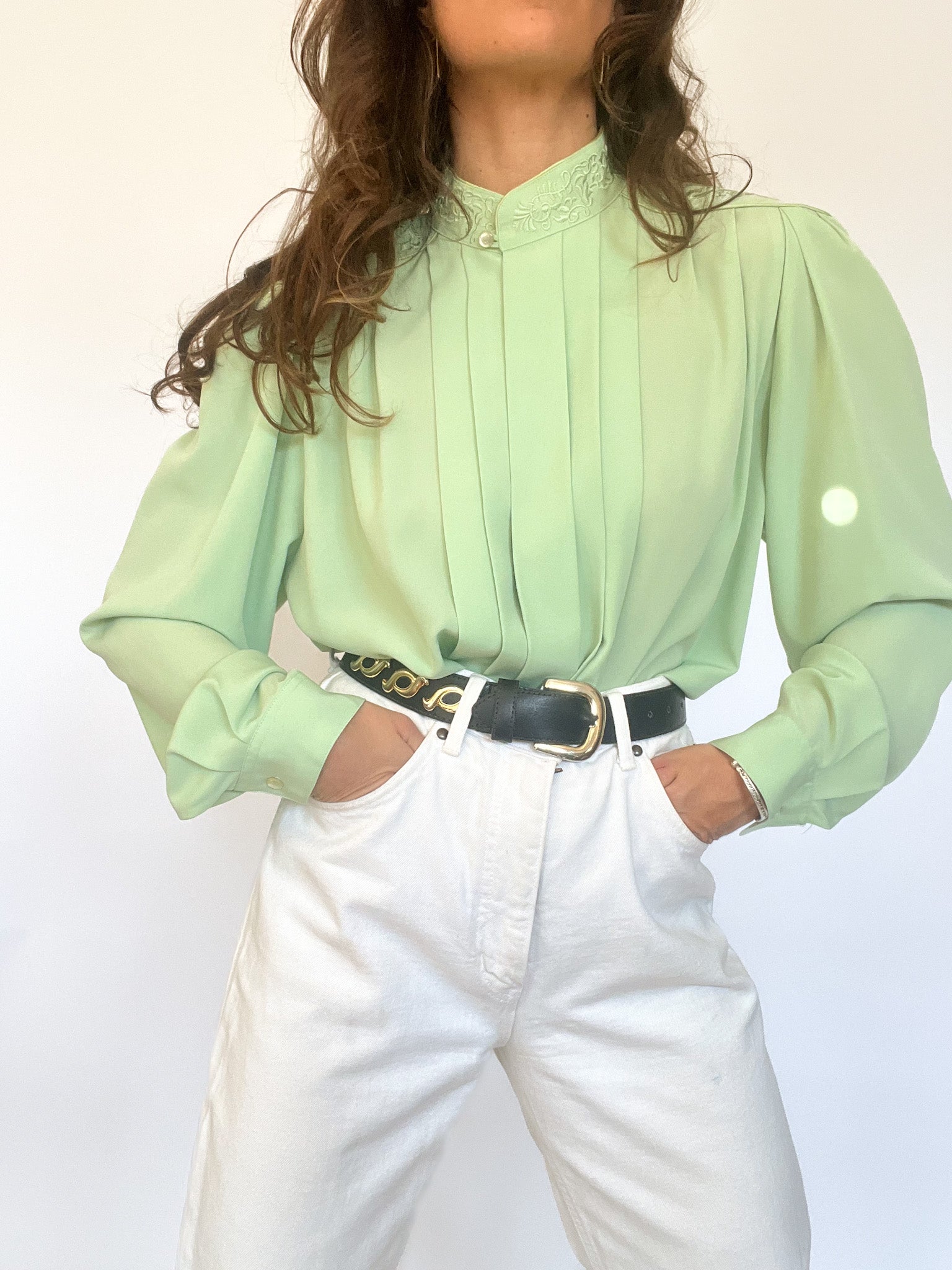 A fresh take on classic elegance, this mint green blouse embodies softness and structure all at once. With fine pleats down the front and delicate embroidery on the Mandarin collar and shoulders, it feels like a breath of spring. Designed for those who love subtle drama, the removable shoulder pads enhance the silhouette without ever overpowering. A timeless piece that balances refinement with individuality.