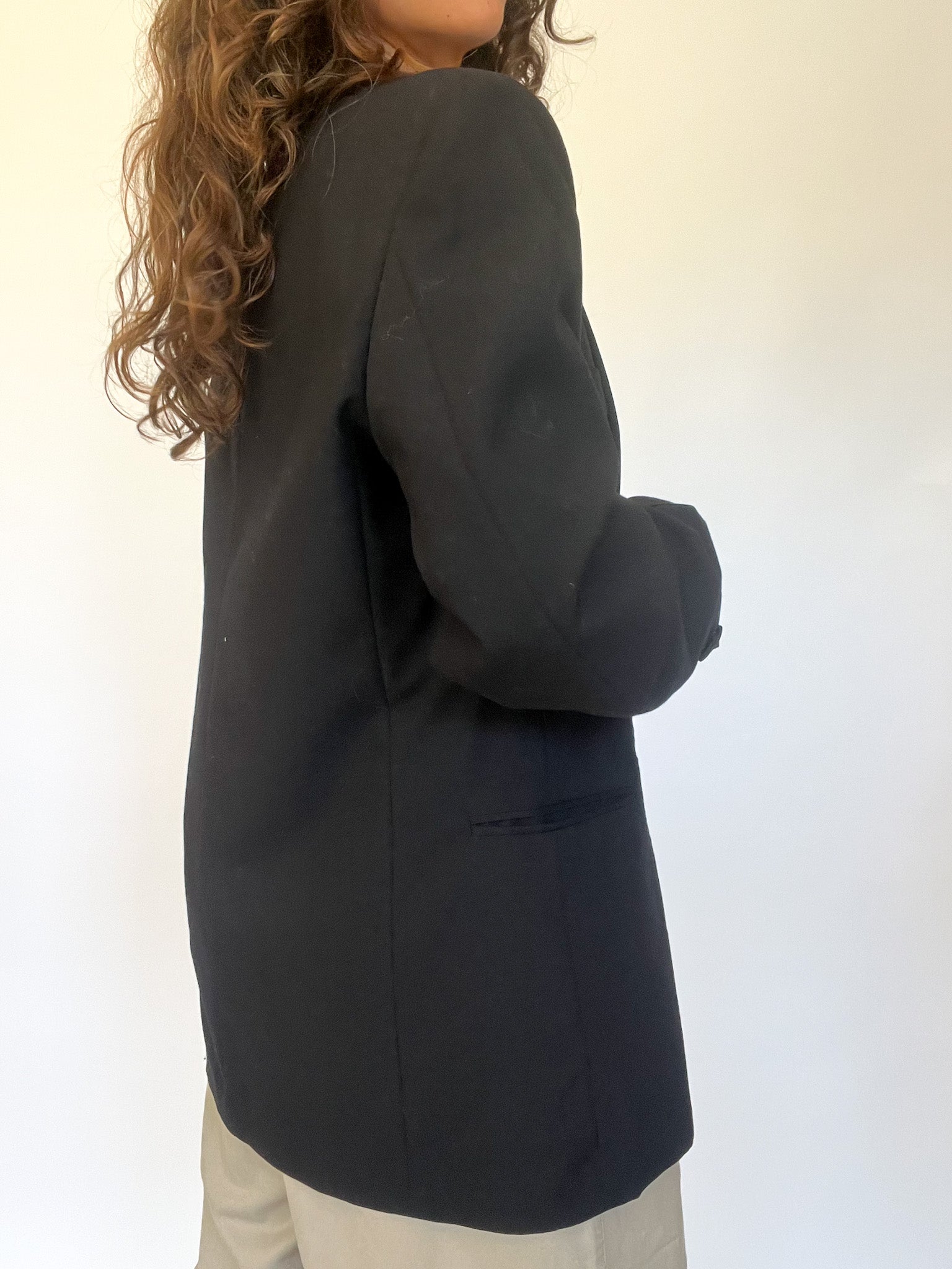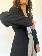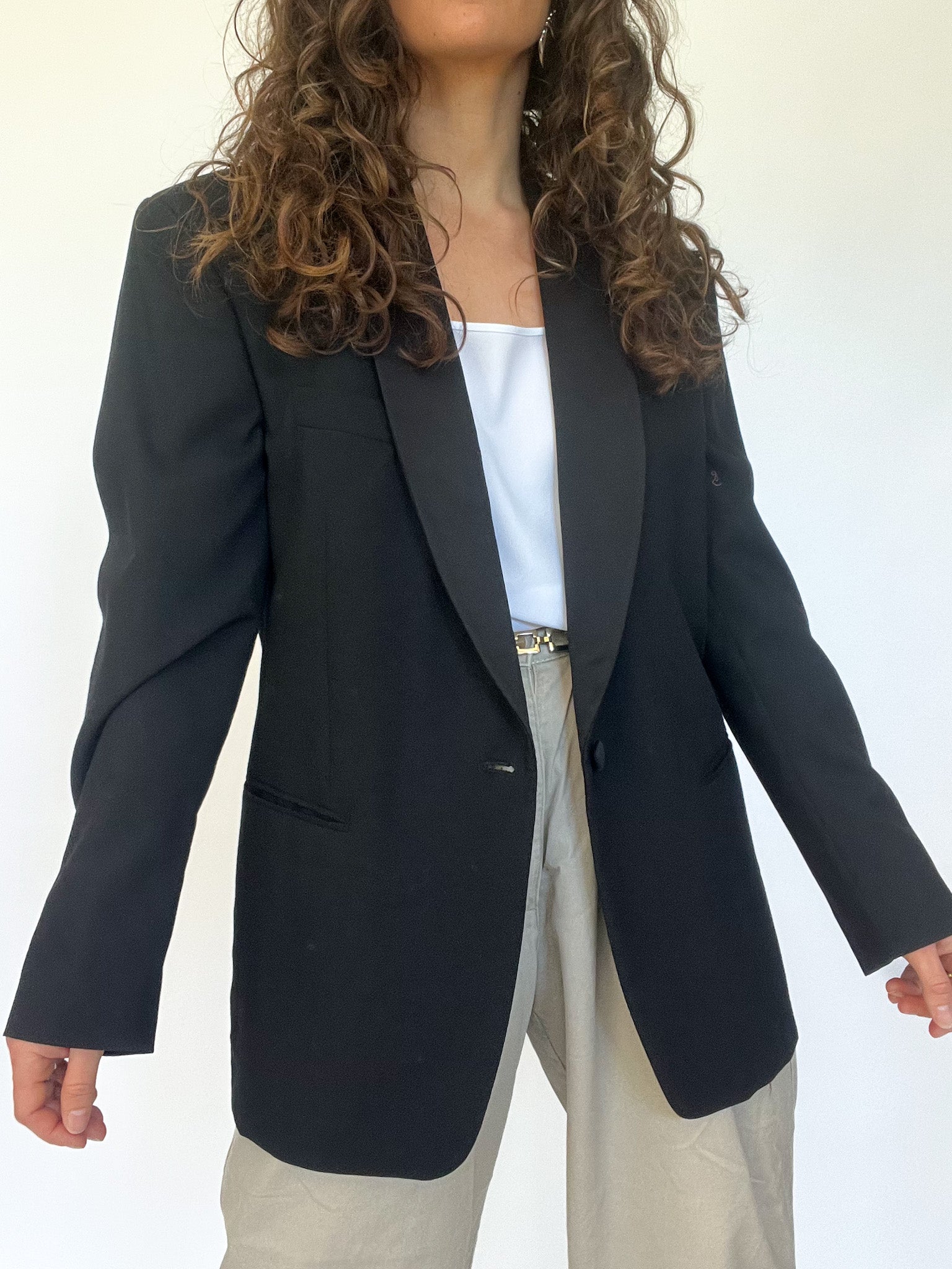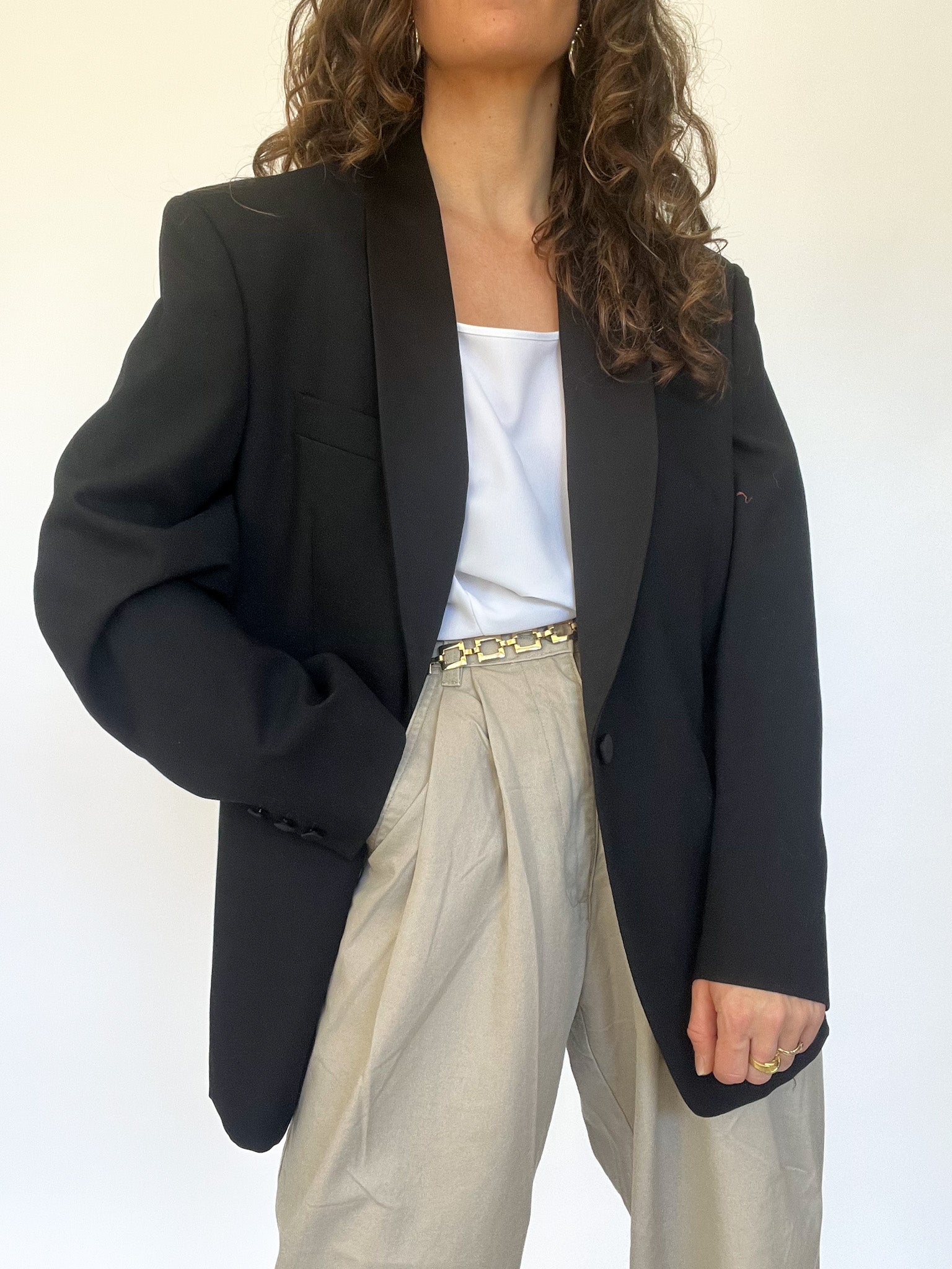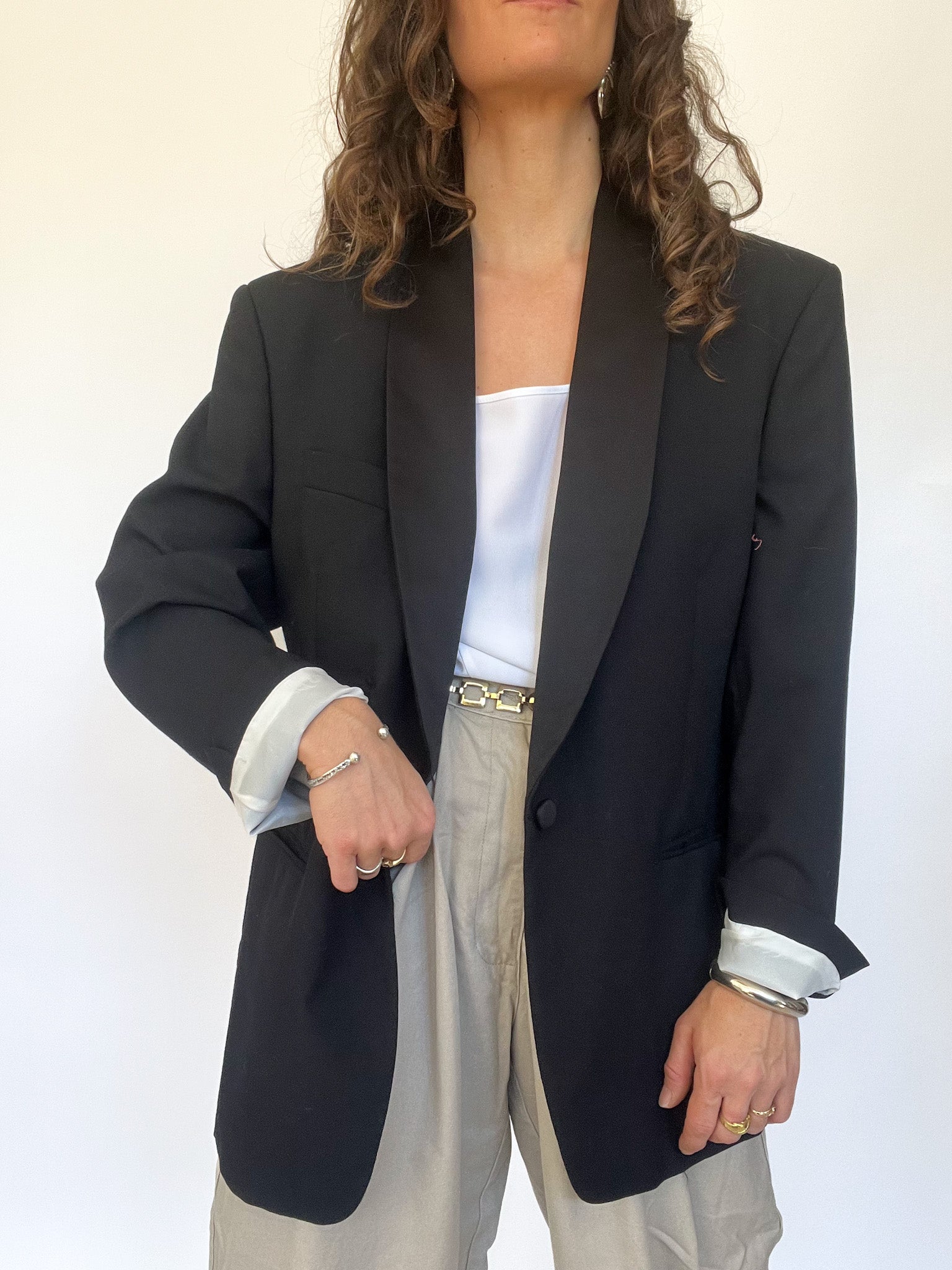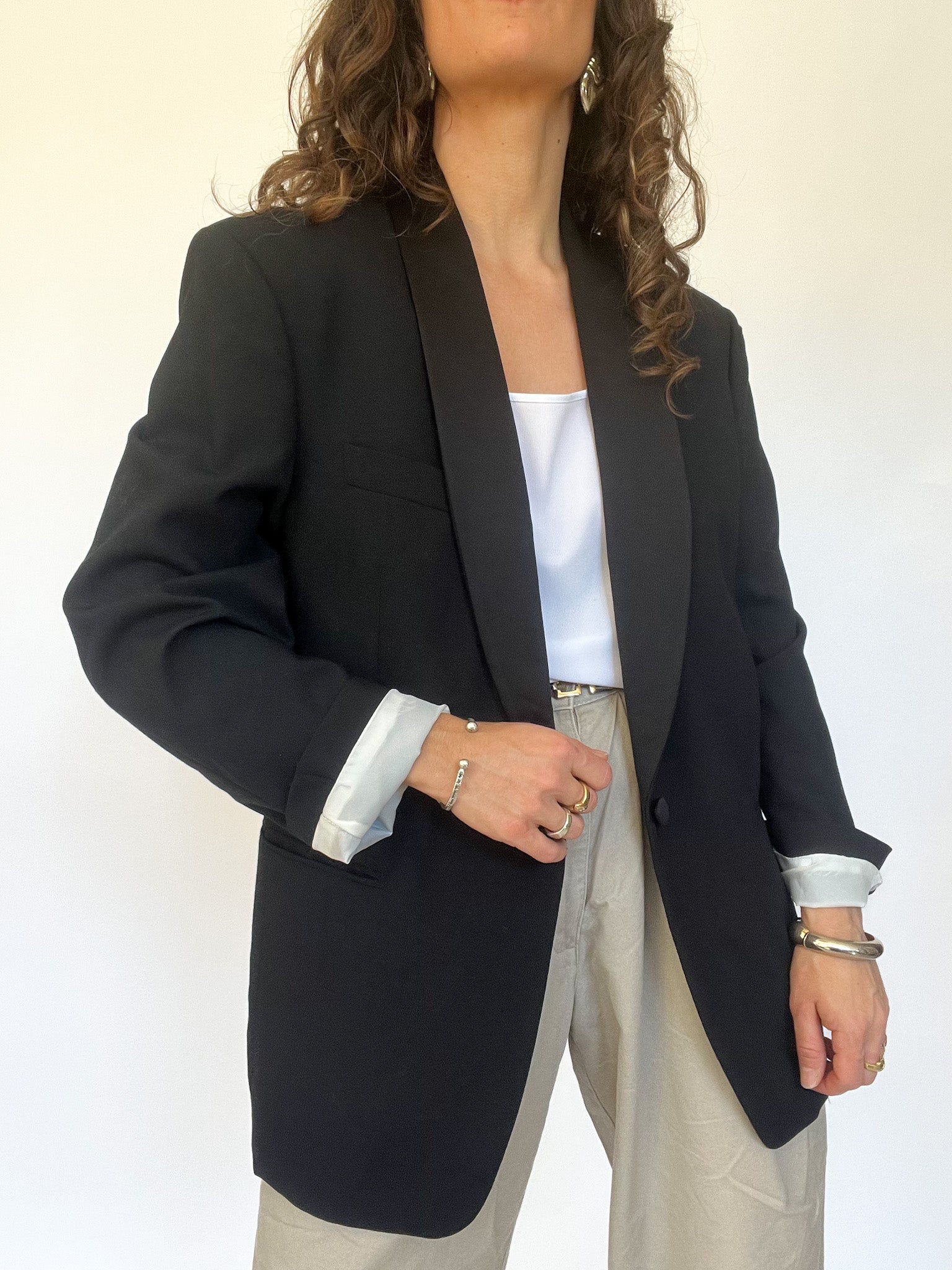 Masculine tailoring with feminine flair. This oversized black blazer with satin lapels brings a sense of drama and strength, reminiscent of 80s power dressing. Designed in 100% virgin wool, it holds structure beautifully — a strong shoulder for strong women.