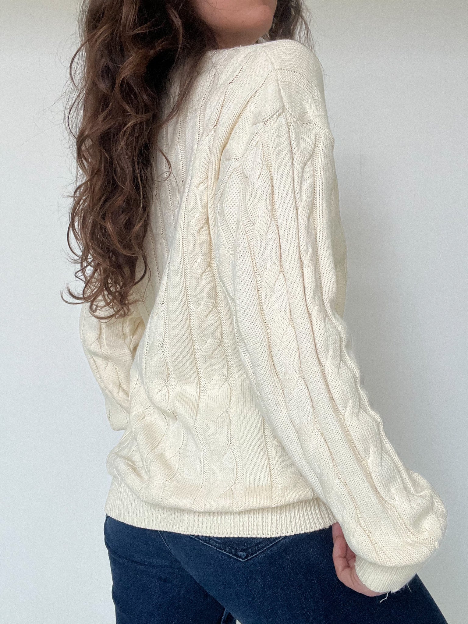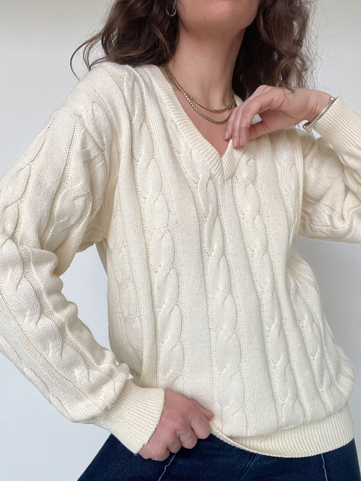 A timeless vintage essential that does everything right. This cream cable knit pullover embodies effortless elegance with its beautifully defined knitwork and soft V-neckline. The balance between structure and comfort makes it an easy everyday piece, whether styled casually with denim or layered for a more refined silhouette. Carefully selected for its versatility, quality and classic appeal, it is the kind of knit that stays relevant season after season. A true wardrobe cornerstone curated by Skorpiones Vintage.