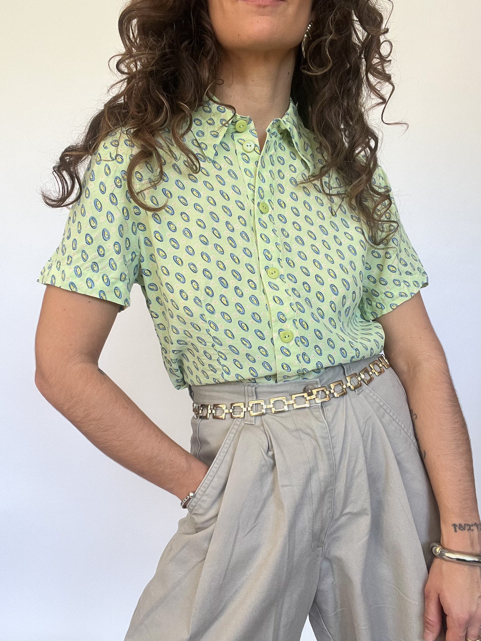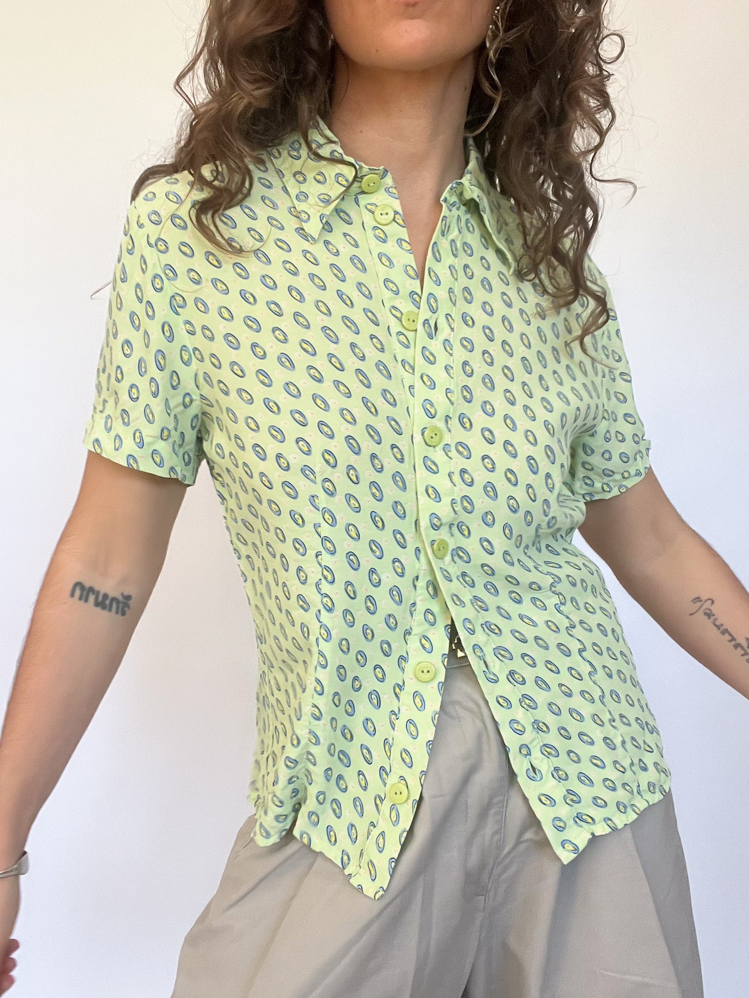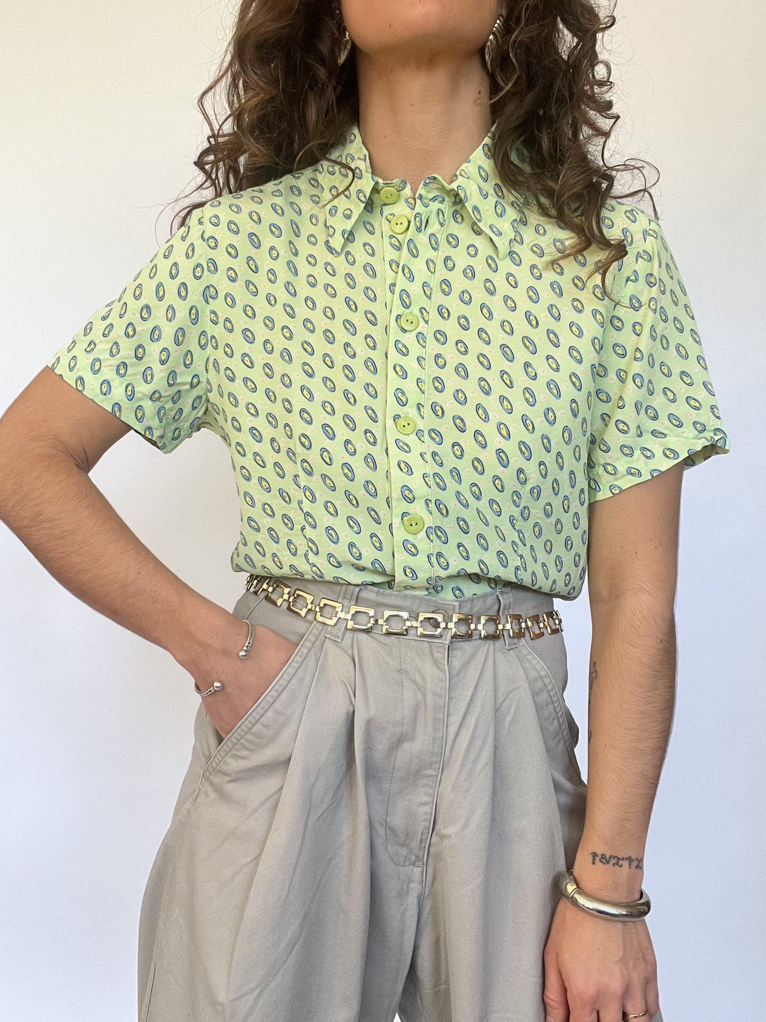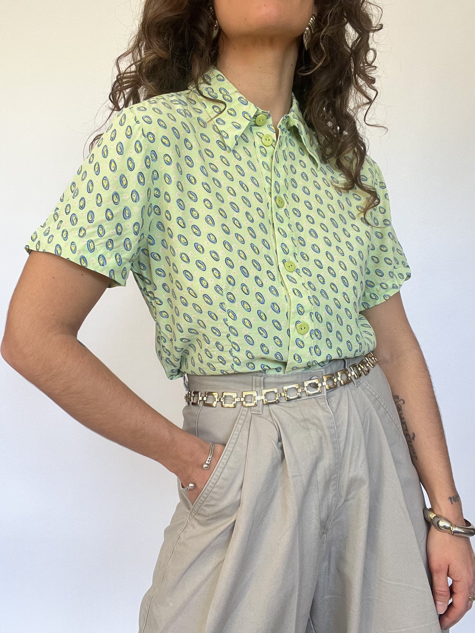 A playful twist on a classic cut, this short-sleeved shirt plays with symmetry and structure. Its fresh green hue and oval print pattern make it an eye-catching piece, while the tailored fit subtly enhances the silhouette. Lightweight and breathable, it’s a go-to for a bold yet effortless statement.