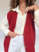 - Special features: Hand-knitted texture, deep red color, button-down front