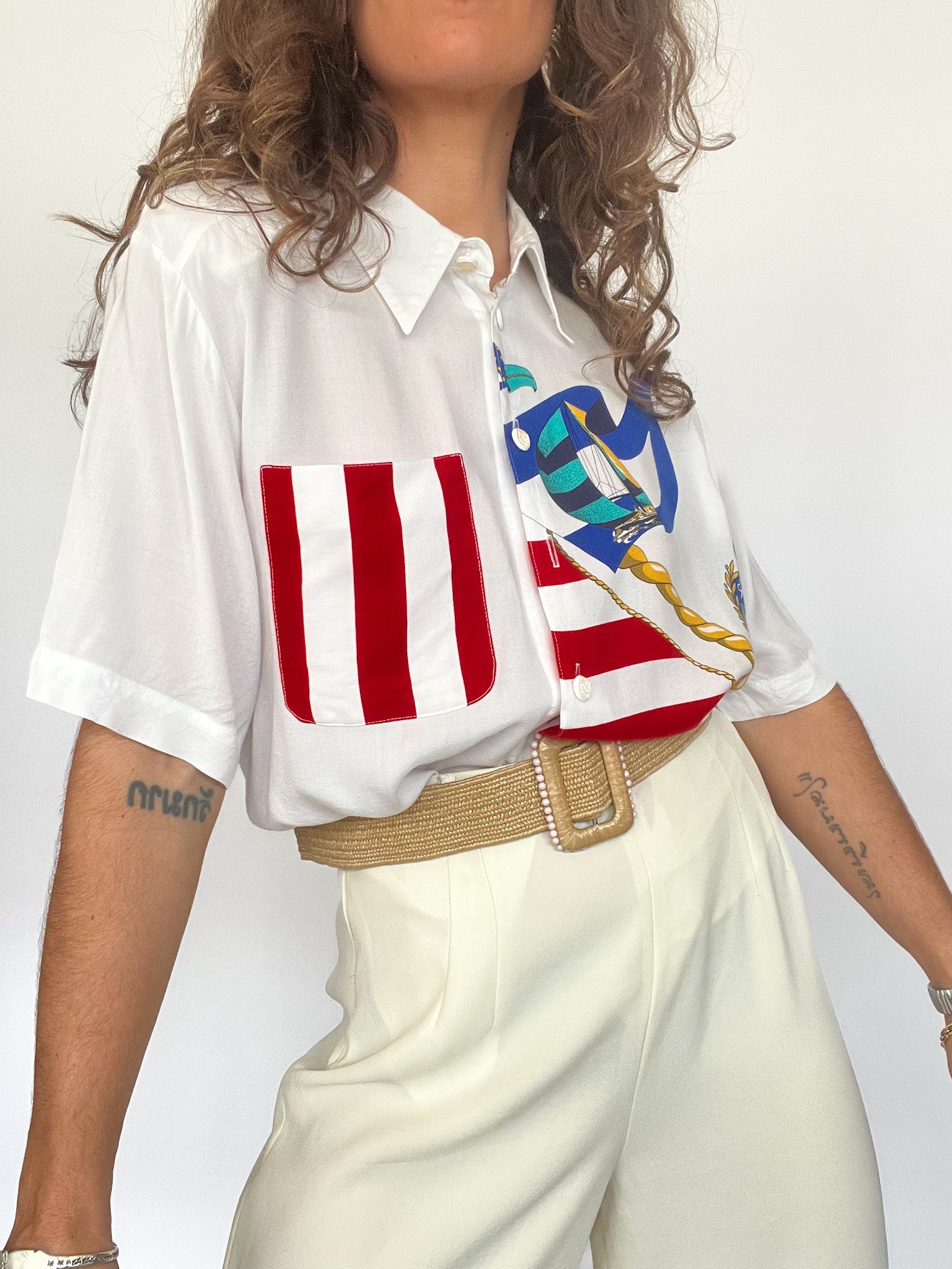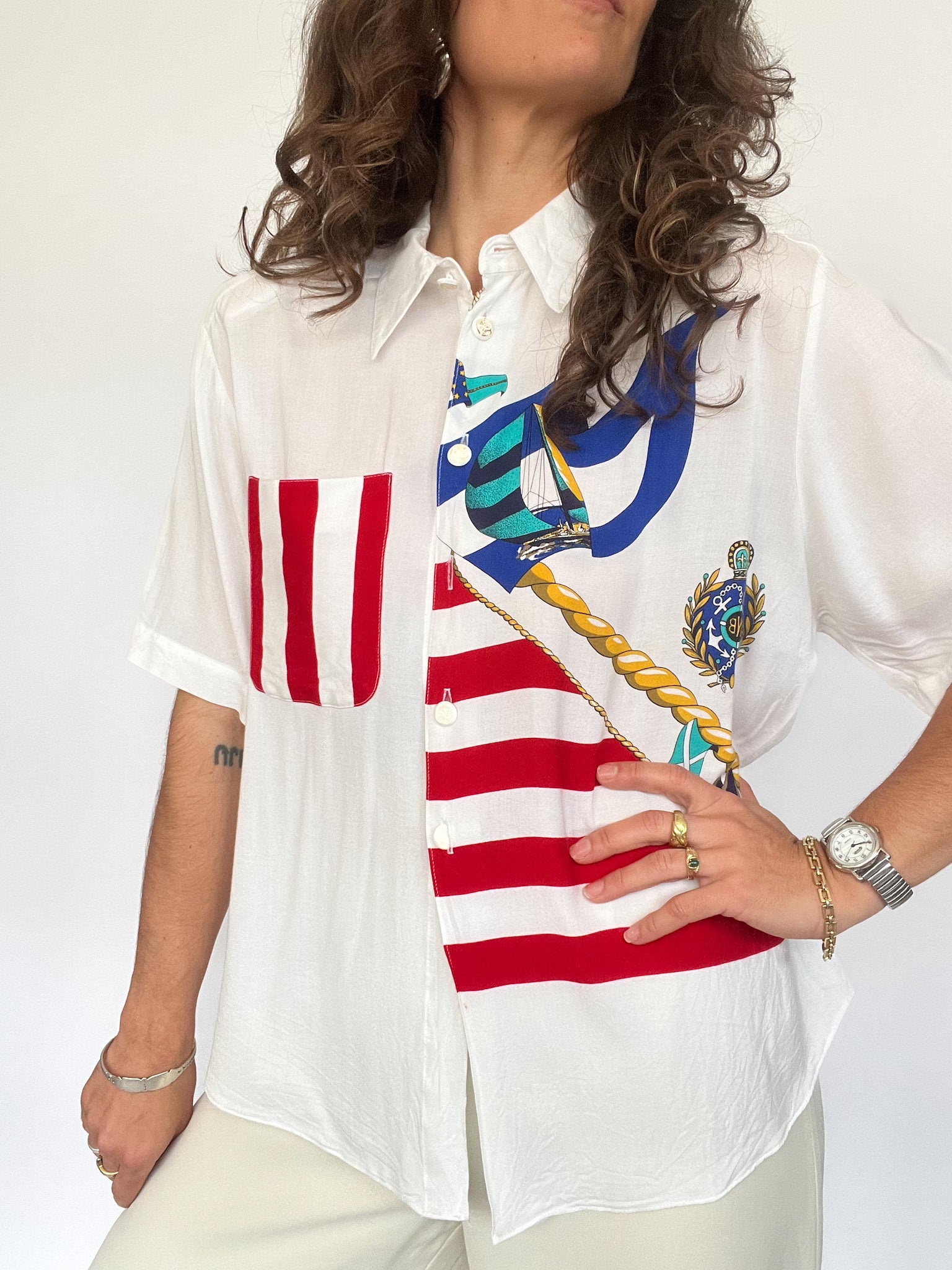 For vintage lovers who like it loud. This playful shirt mixes bold red stripes with sailboat motifs in vibrant blues — a perfect piece for seaside summers or styling as a statement layer. One front button is missing but can be replaced with a standard one upon request. A joyful ode to the bold fashion of the 90s.