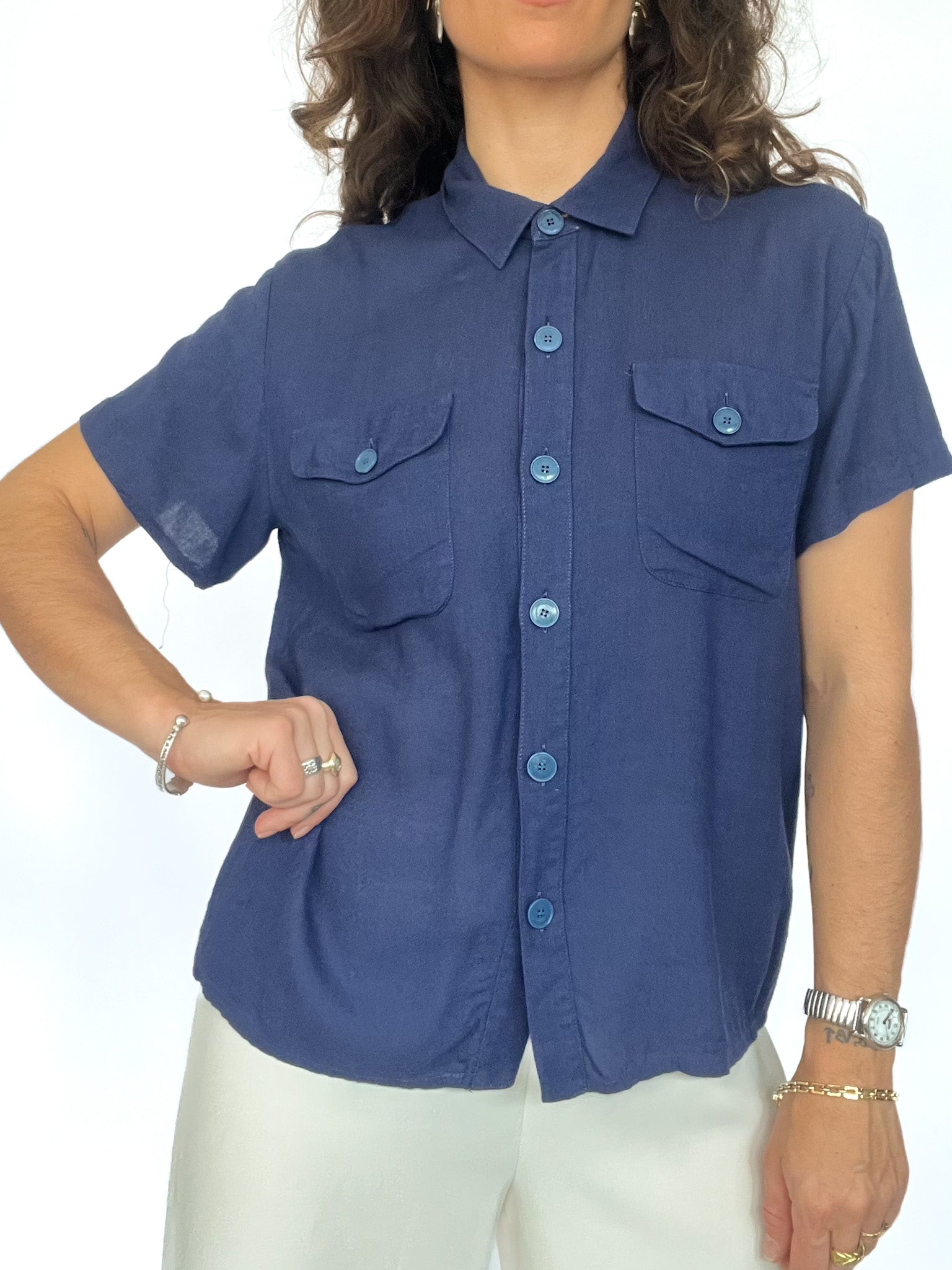 Understated yet striking, this vintage navy short-sleeve shirt brings clean tailoring and laid-back elegance together. Crafted in a linen-viscose blend, it feels airy and soft against the skin — ideal for warm days when you still want a bit of structure. Worn tied at the waist or left open, it’s a wardrobe essential with quiet power — a perfect example of Skorpiones’ taste for timeless, character-driven vintage.
