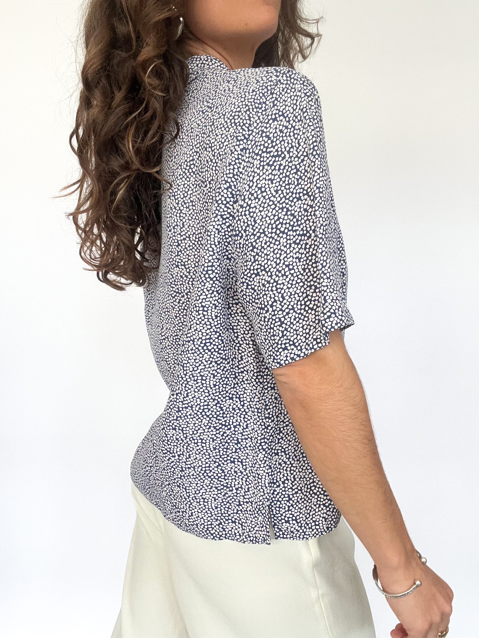 A minimal gem with a playful twist. This lightweight viscose shirt features a tiny white dotted print on navy, giving it a refined yet casual vibe. It’s the kind of understated staple that becomes a go-to — breathable, easy to pair, and full of vintage charm.