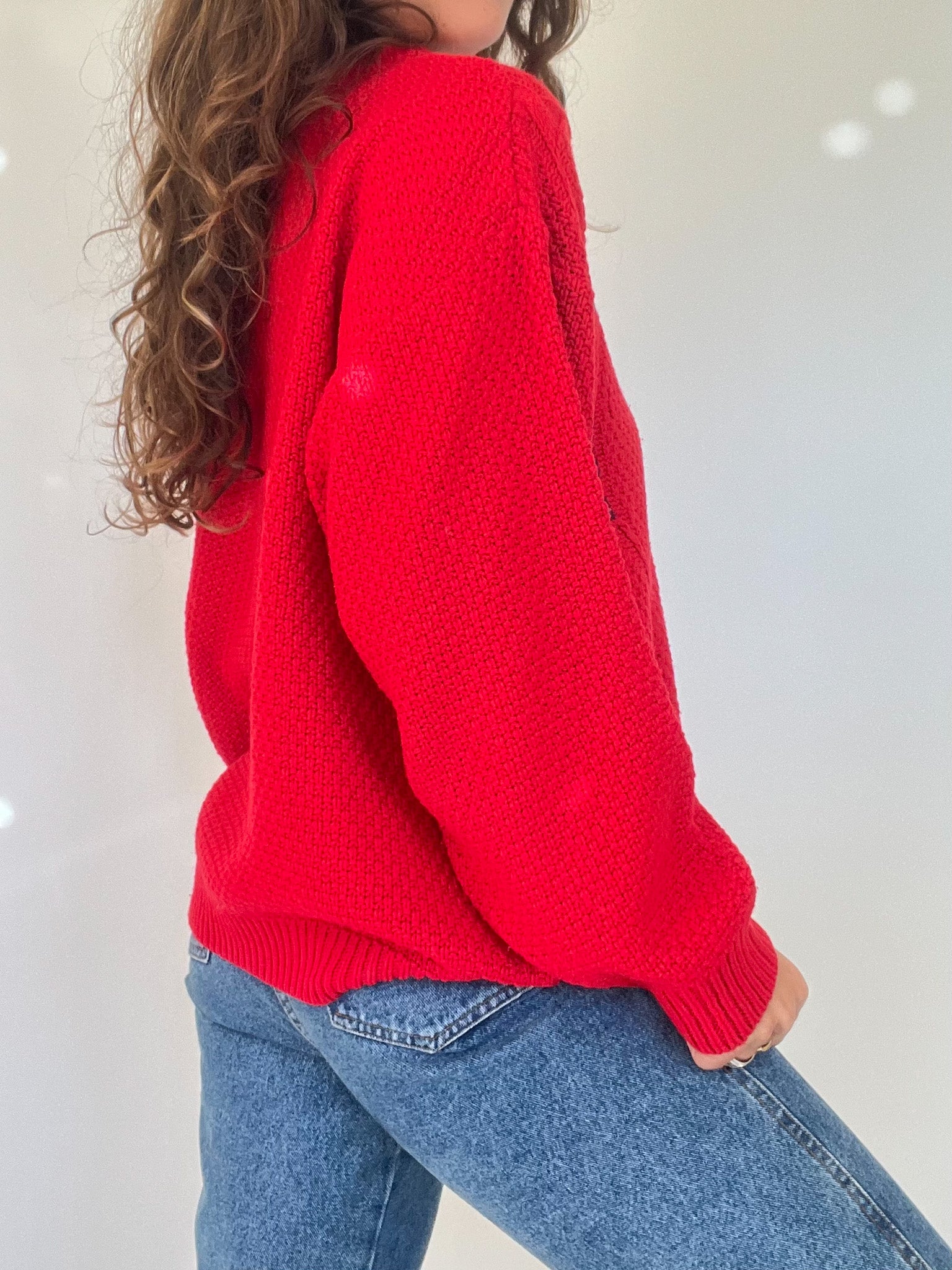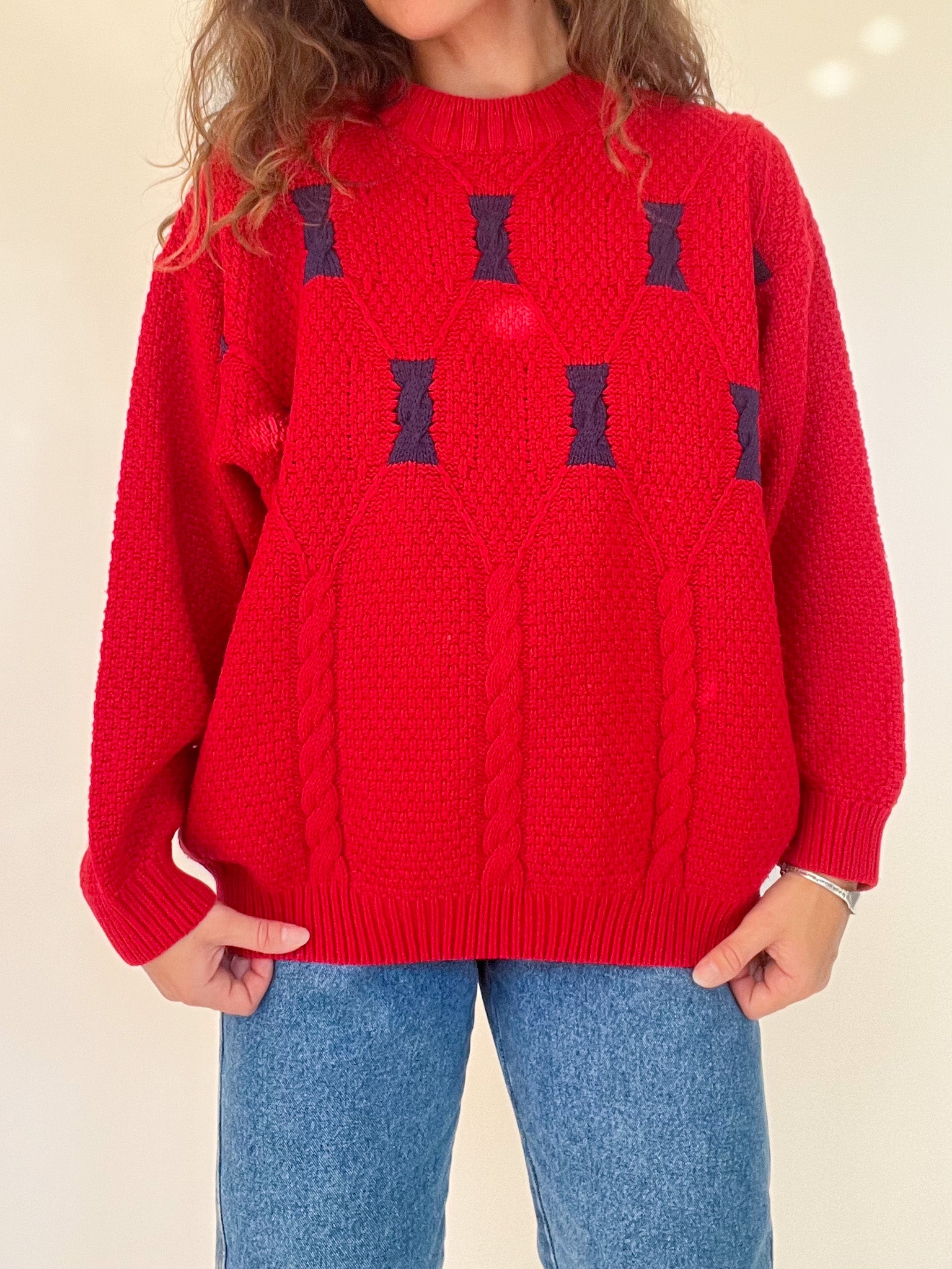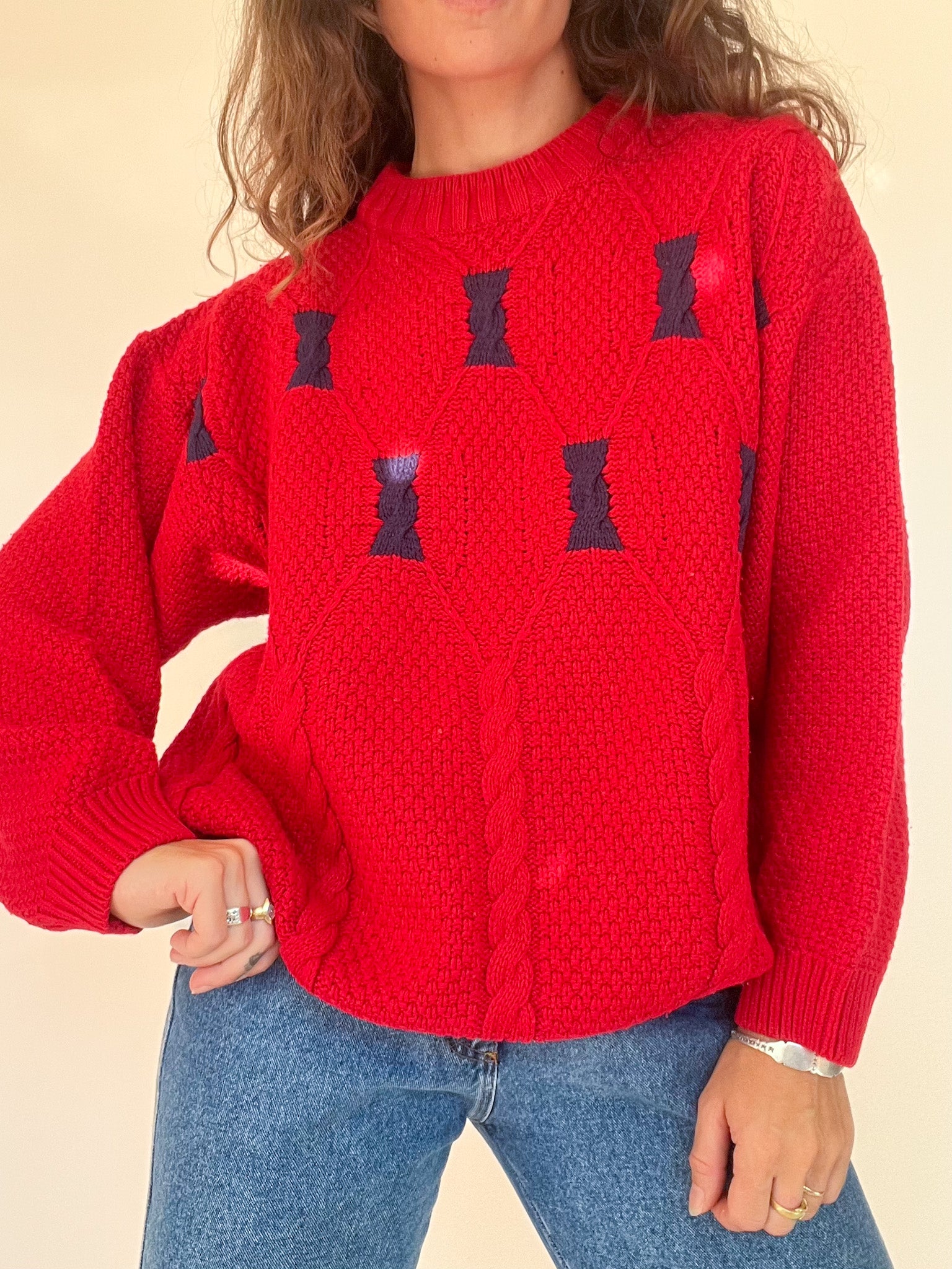 Infused with graphic energy, this knit combines textured red wool with navy geometric intarsia and a bold cable detail. More than just warmth, it’s a statement of strength and individuality, built to last through changing trends.