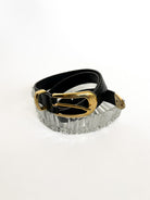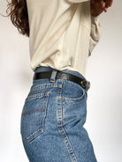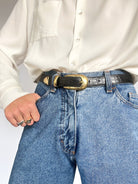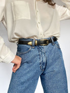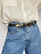 A sleek and sophisticated piece, this vintage black leather belt is the perfect fusion of elegance and versatility. The crocodile-embossed leather gives it a refined texture, while the gold-tone buckle and matching tip details bring a luxurious vintage flair. Designed with a PVC lining for added durability, this belt is both stylish and practical. Whether worn over high-waisted jeans or layered with a blazer, it’s a statement accessory that stands the test of time.