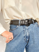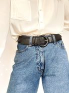 A timeless accessory with a bold touch, this vintage black leather belt is designed to elevate any outfit. The textured leather, subtly embossed with a refined pattern, adds dimension and character, while the round buckle enhances its vintage charm. Whether cinched at the waist or worn with high-waisted denim, this belt is a statement of effortless elegance.