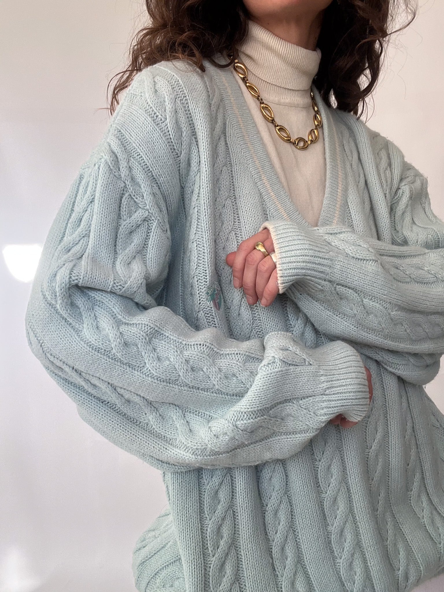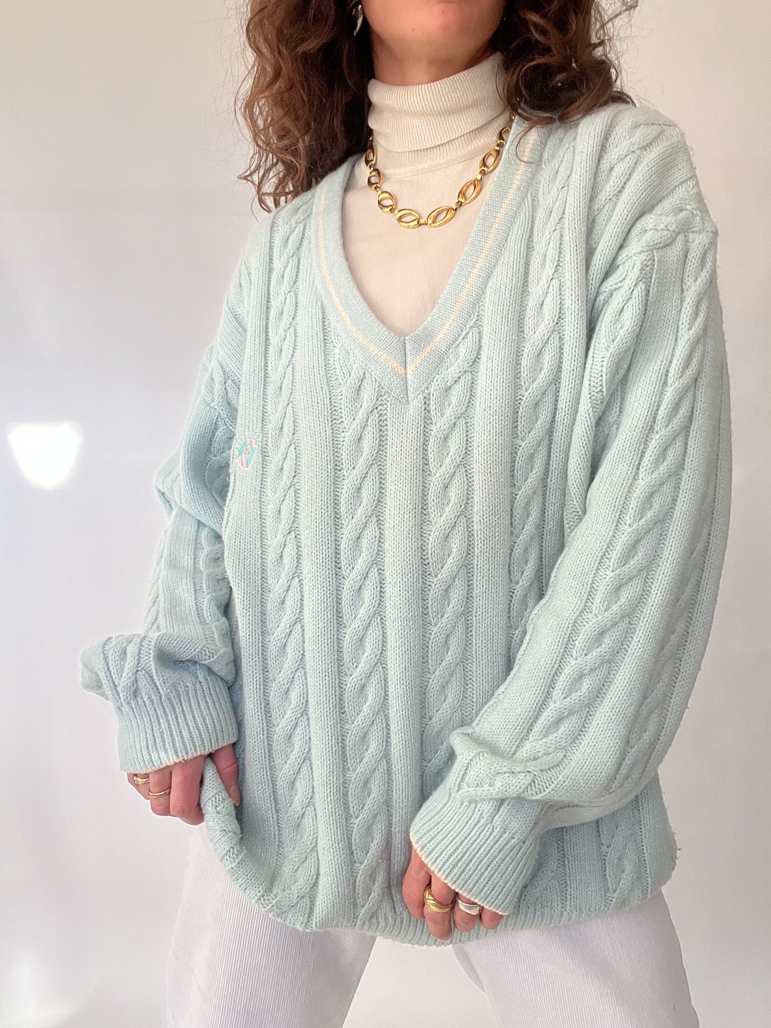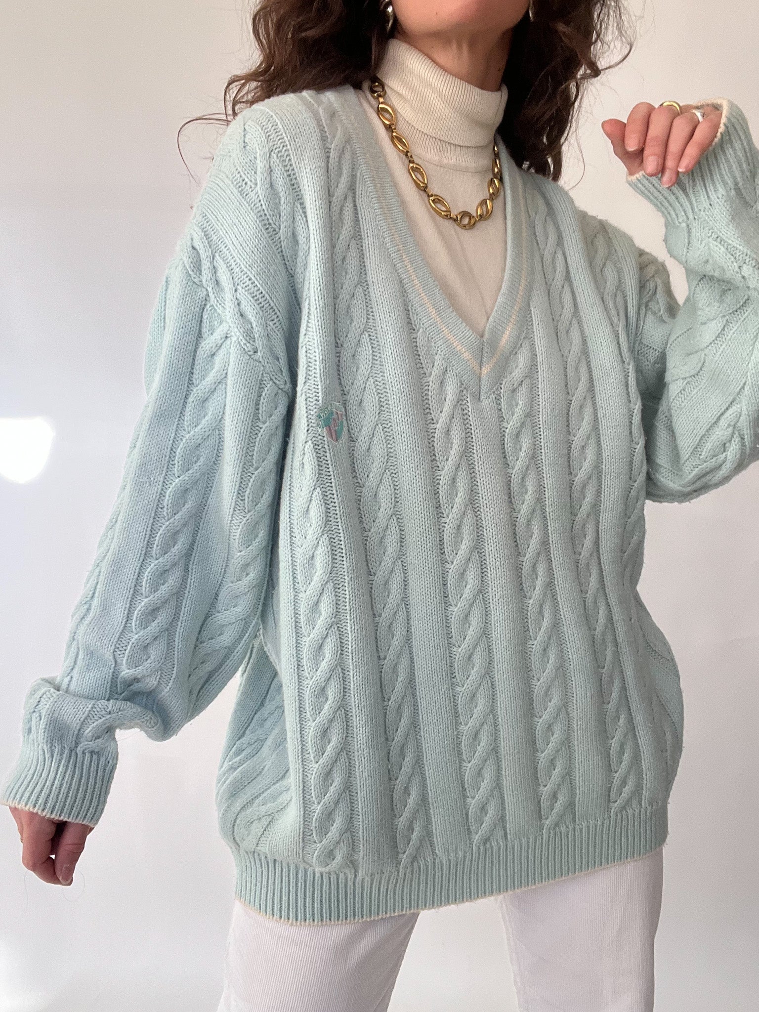 Vintage 80’s Sky Blue Cable Knit V-Neck Pullover