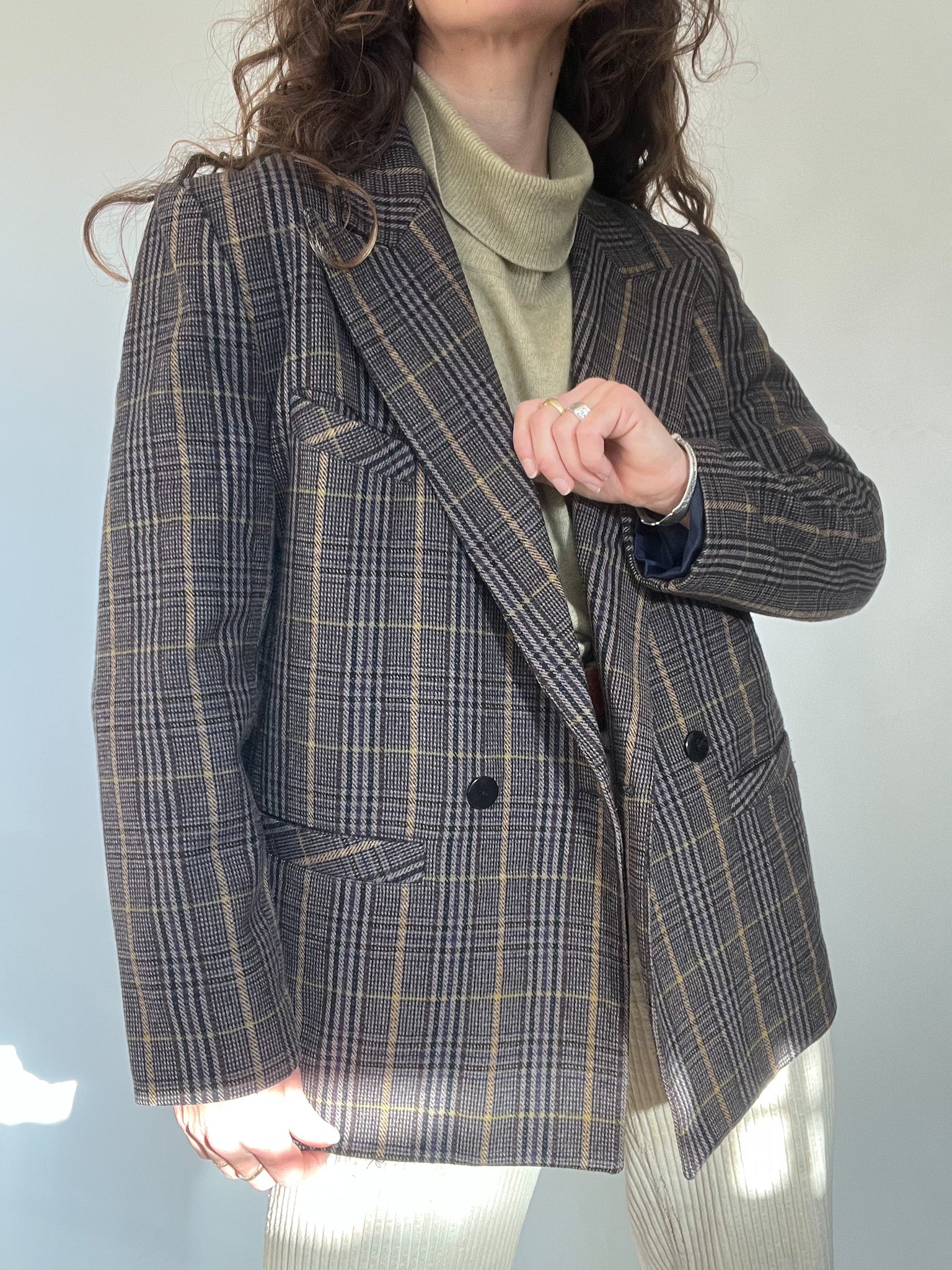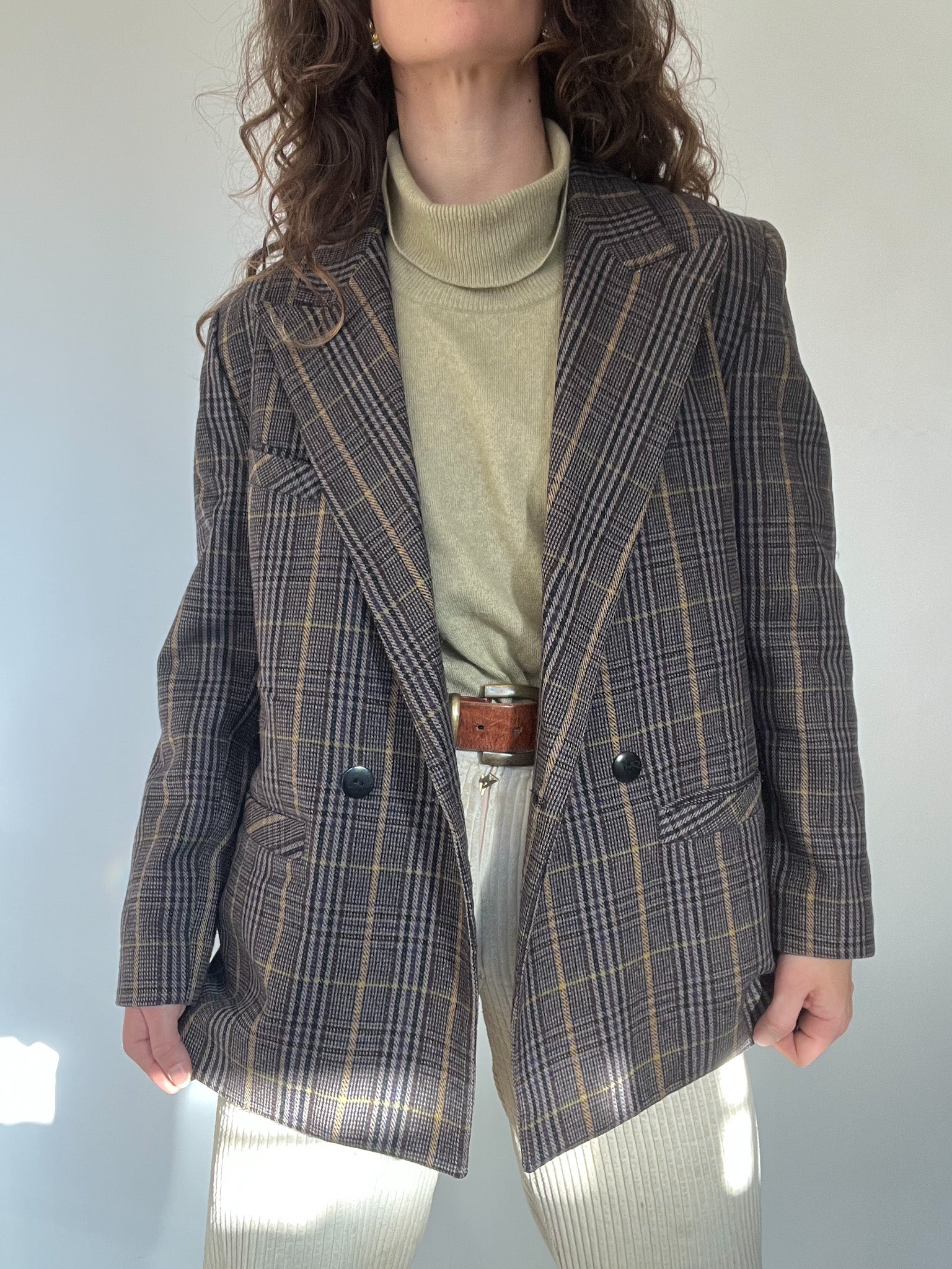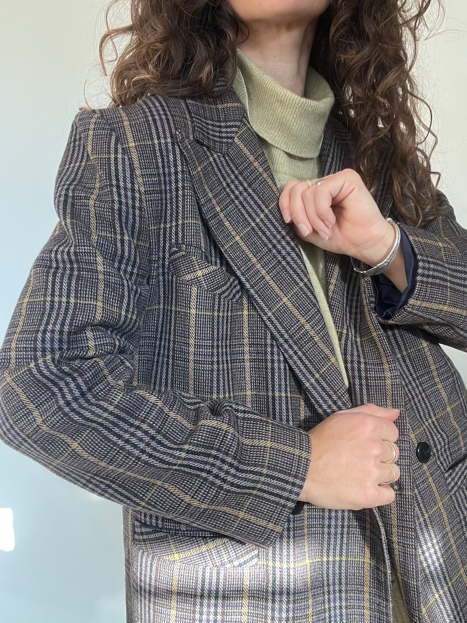 A beautifully tailored checkered blazer in deep brown tones, highlighted with subtle yellow lines that bring structure and elegance to the silhouette. This Paris-made piece embodies the refined, timeless essence of 90’s French tailoring — sharp, confident, and unmistakably iconic. Its straight fit and clean construction make it a versatile staple, perfect for elevating everyday looks with a touch of French sophistication.