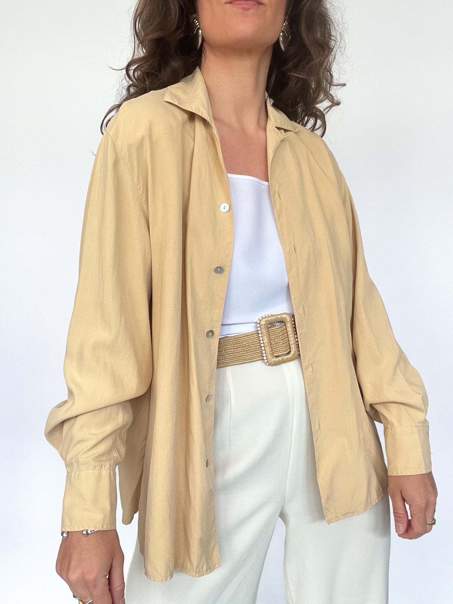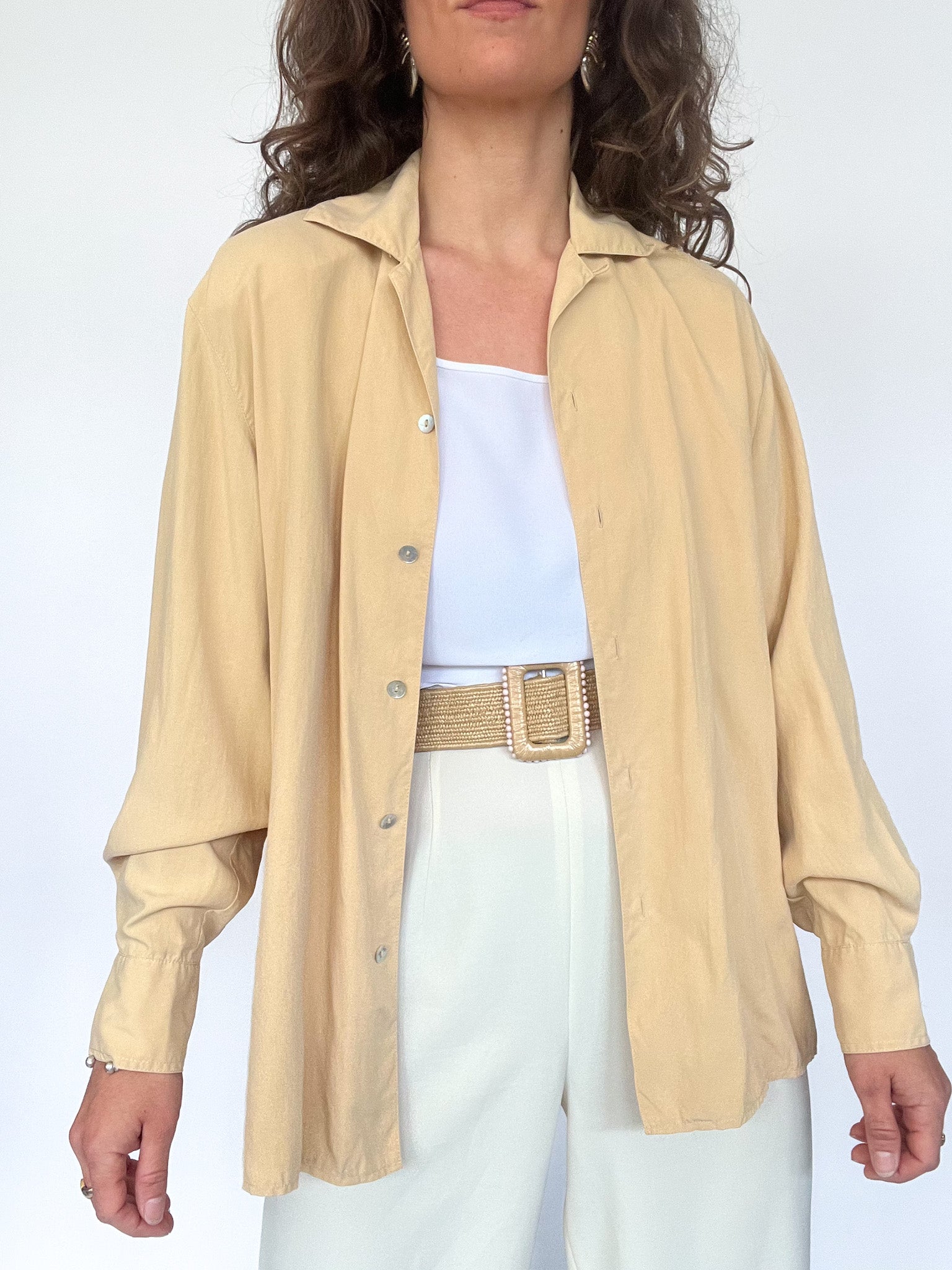 Pure simplicity, pure elegance. This soft champagne-colored shirt in 100% silk is the kind of staple that brings instant sophistication. With its fluid drape and natural shine, it offers endless styling options — from loose and casual to tucked-in and chic. A quiet luxury piece that embodies durability and femininity.
