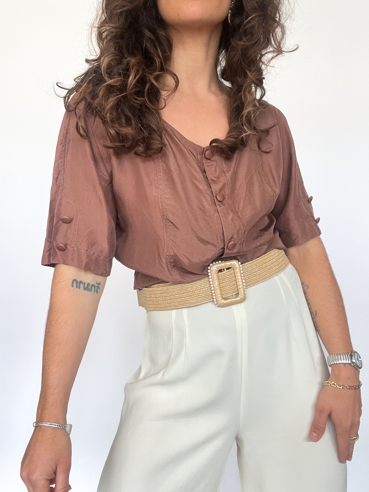 Effortlessly romantic, this vintage silk blouse features asymmetric seams, a flattering neckline, and covered buttons that echo 90s minimalism. Its natural sheen and light crinkle texture give it life and dimension, offering both softness and structure in one timeless silhouette.