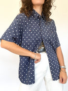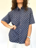 Playful but polished, this navy short sleeve blouse with white polka dots offers a charming twist on vintage tailoring. With twin breast pockets and a soft fabric blend, it’s breezy yet structured — an everyday essential with a dose of personality.